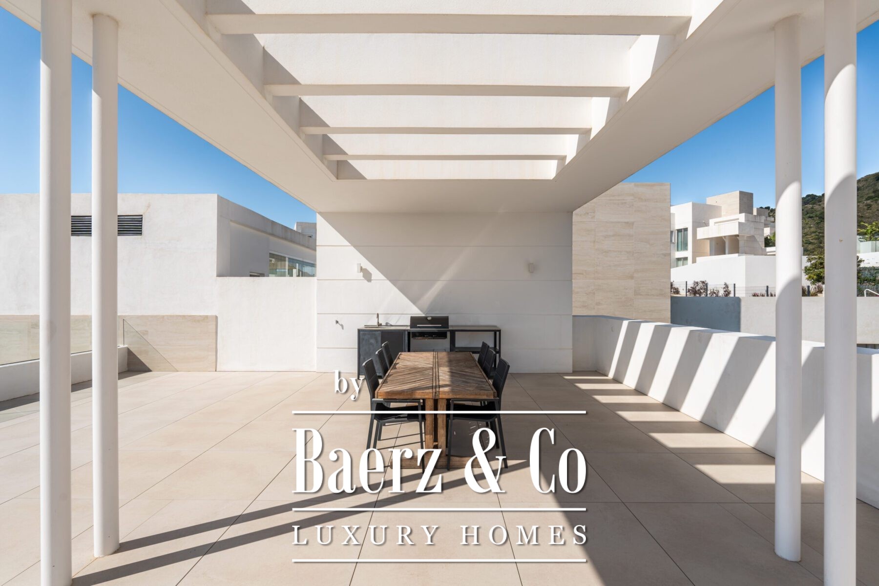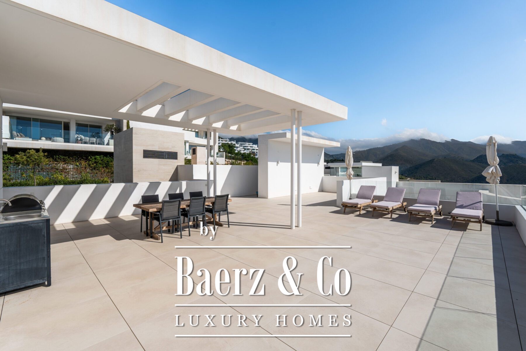 Penthouse Marbella invites a rare confluence of privacy and panorama, poised above the city within a secure gated enclave. This penthouse in Marbella, southeast-facing for optimal light, commands sweeping views of the sea and mountains from a private position. Spanning 157 m² of refined indoor space and 276 m² of surrounding terraces, every aspect is calibrated for sophisticated indoor-outdoor living.