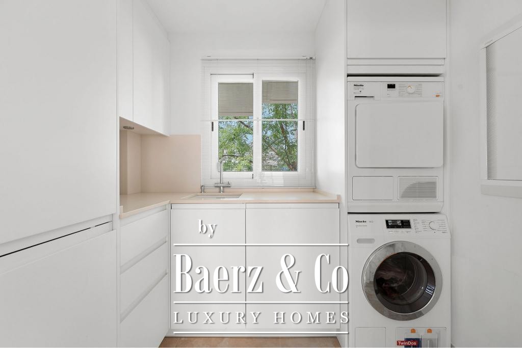The main living floor presents an open-plan design anchored by a state-of-the-art kitchen equipped with premium Gaggenau appliances, a generous living area, and an elegant dining space. High-quality wooden flooring, electric blinds, an advanced alarm system, and a lift speak to a commitment to both sophistication and practicality. Two underground parking spaces and dual storage rooms enhance daily convenience.