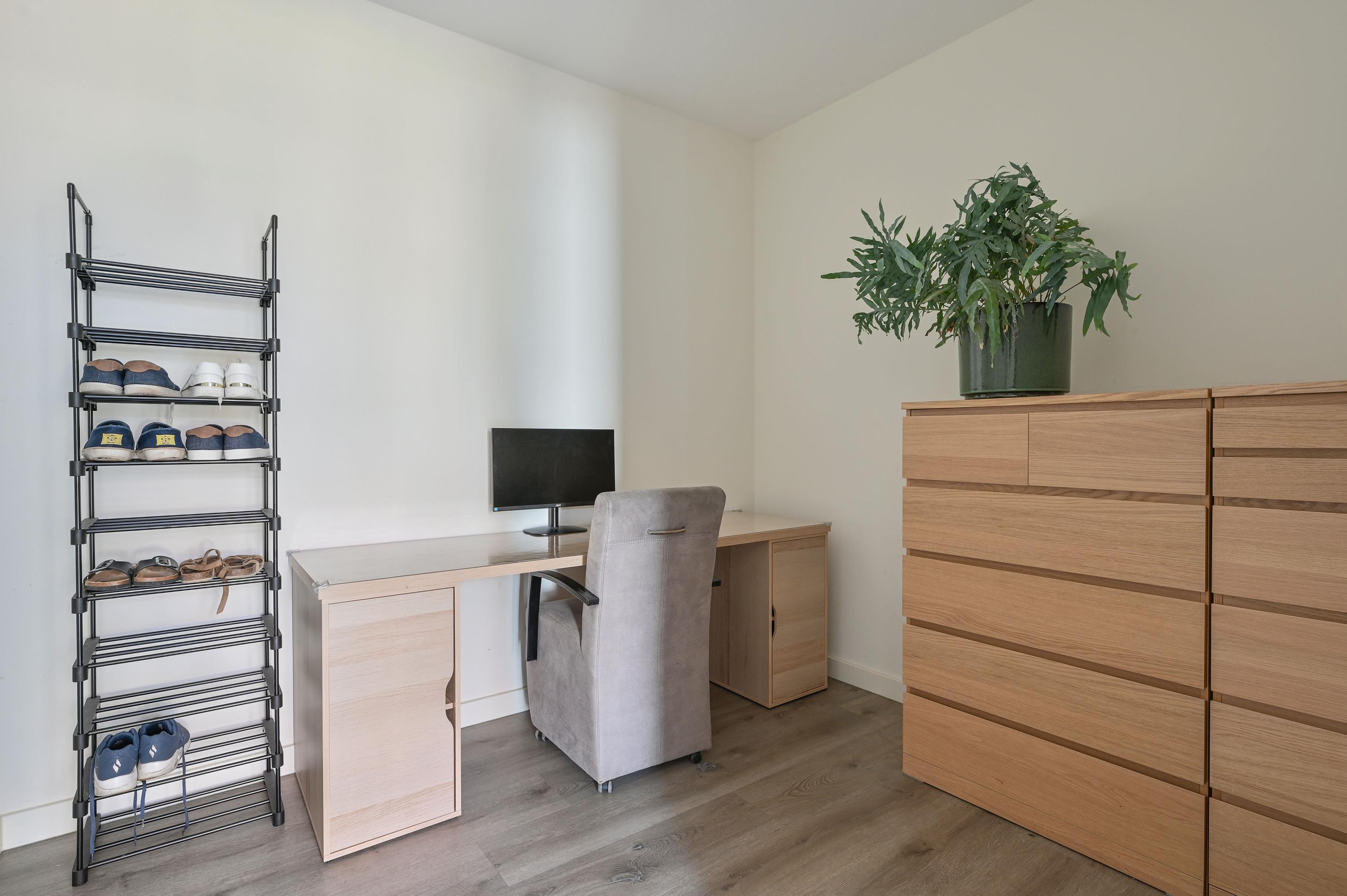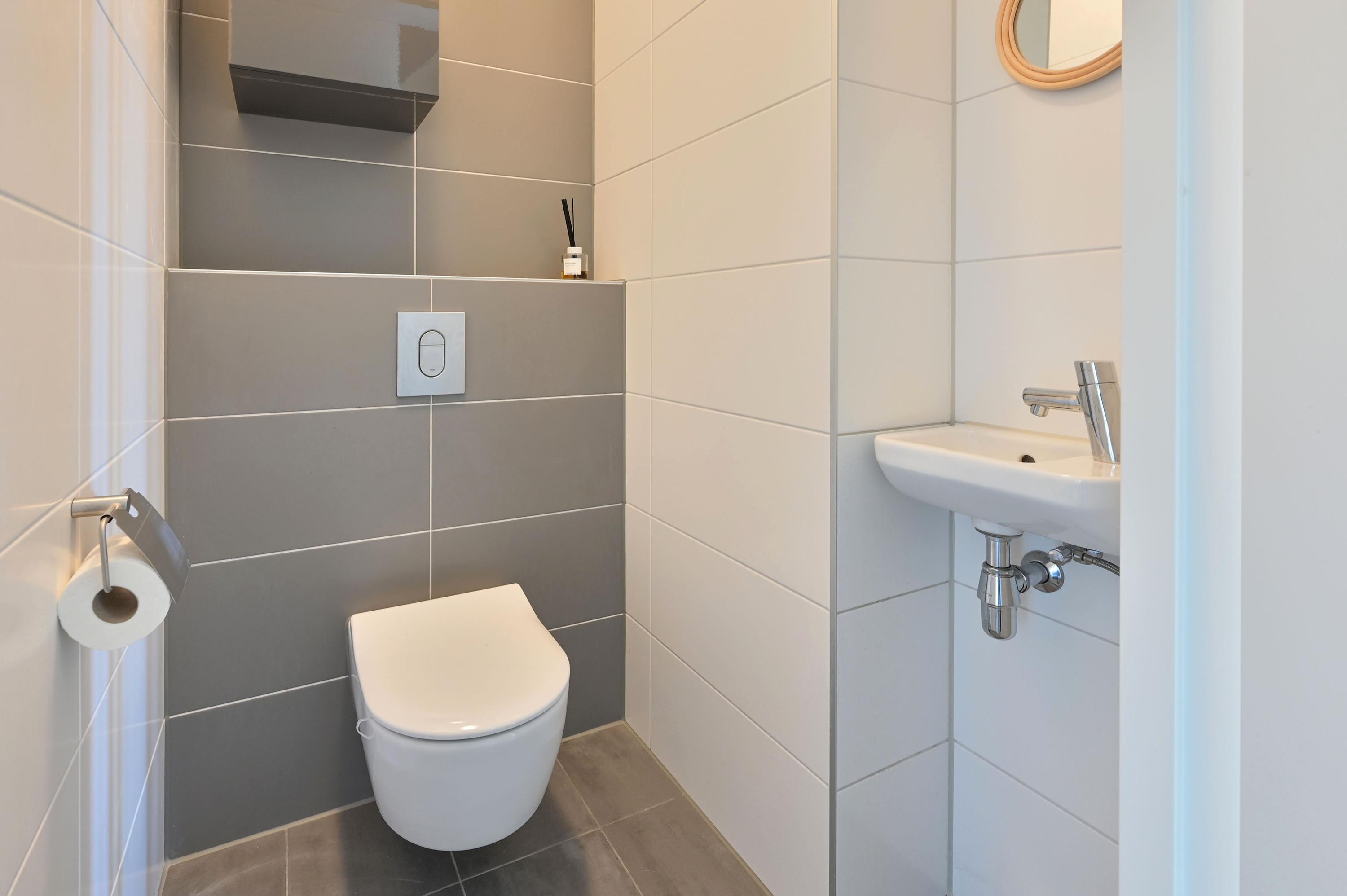 To the left of the entrance is a versatile room currently used as an office, also ideal as a hobby room or indoor storage. This room even has its own entrance from the front. Adjacent is the meter cupboard with fiber-optic connection, followed by a modern guest toilet in grey-white tones with wash basin. A practical storage closet sits under the stairs, with plenty of space for coats and shoes.