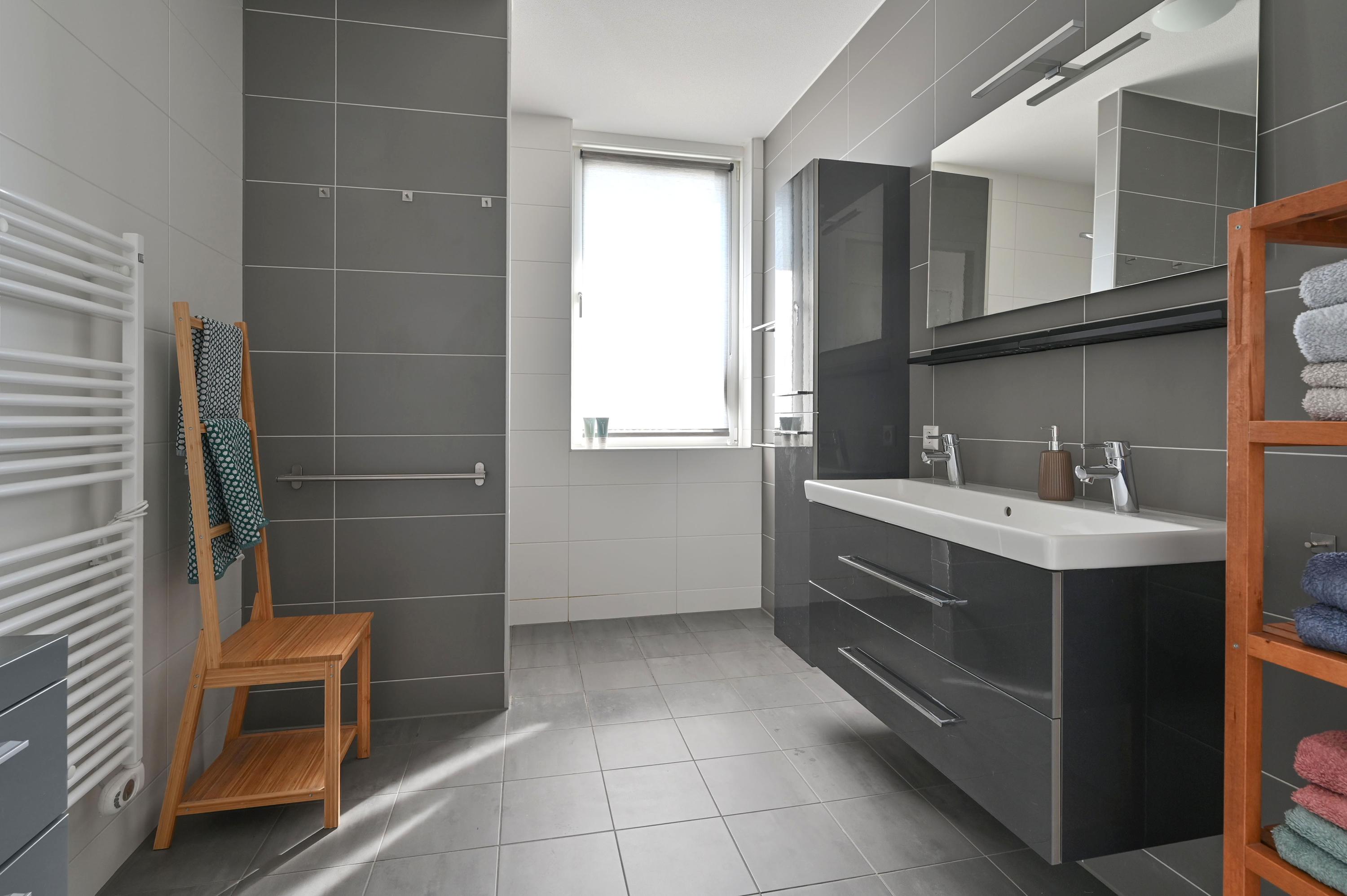 This floor also houses a technical room with heat pump, boiler, mechanical ventilation unit, and inverter for the 14 solar panels – along with additional storage space. At the end of the hallway are two more spacious bedrooms: the primary bedroom with a large corner window, and another generous room, currently used as an office.