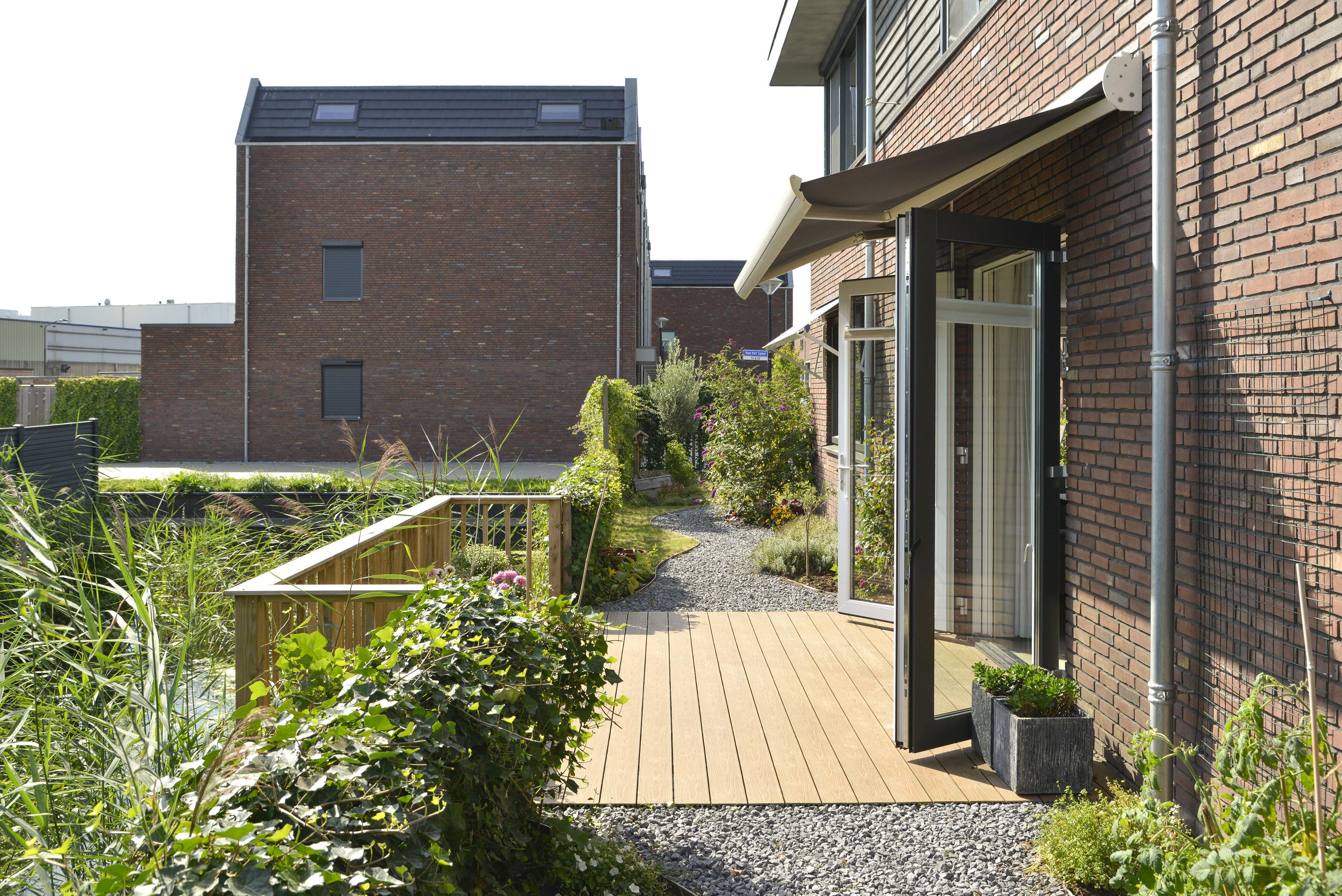 The path continues along the water, surrounded by greenery, to the sunny south-facing heart of the garden. Here you’ll find a spacious terrace by the living room, currently shaded by a retractable awning, with potential for a stylish veranda. Beyond stretches a well-kept lawn, framed by planting and a sleek beech hedge. Whether you want to relax, garden, or entertain guests, this garden has it all – with the added bonus of beautiful water views.