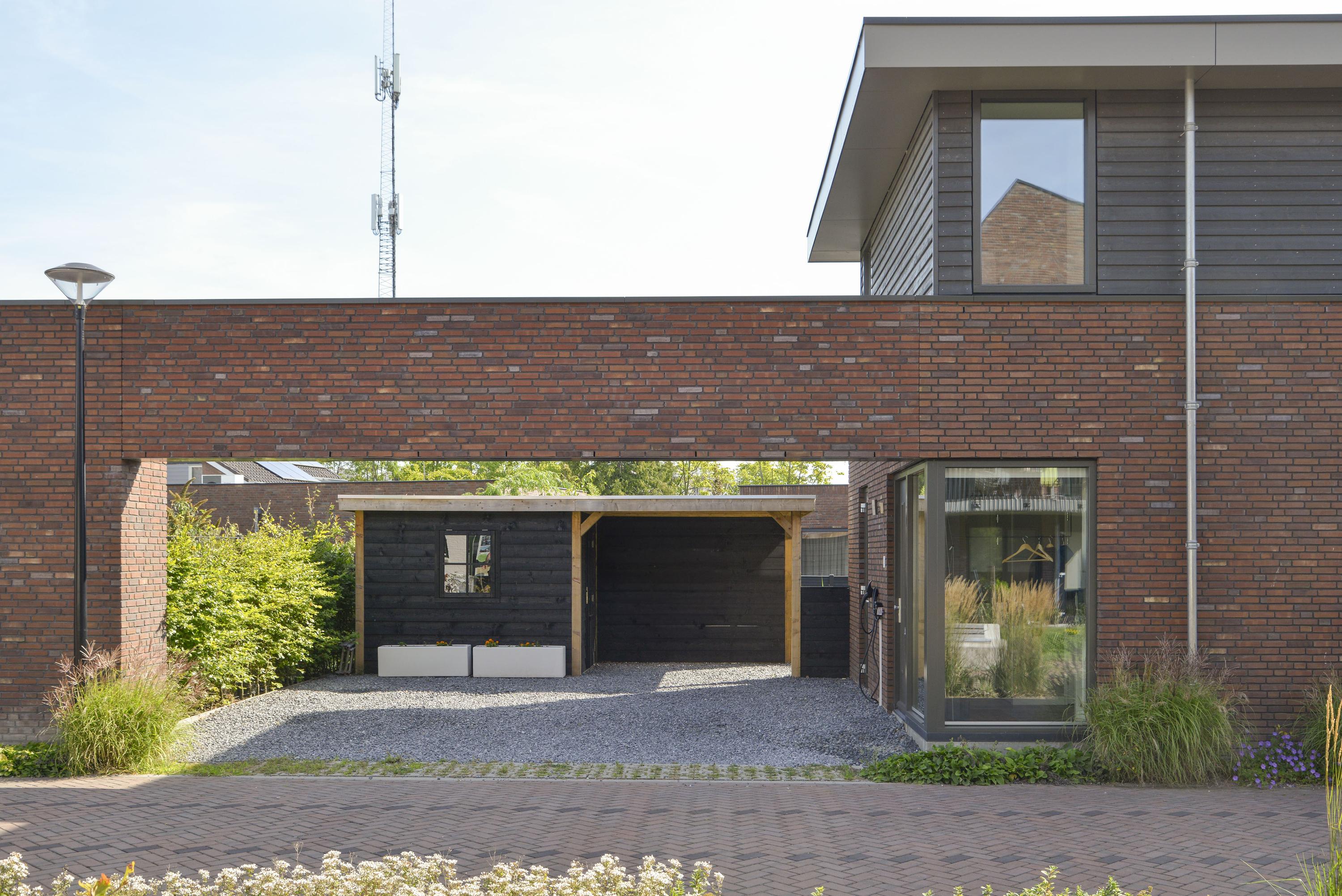 The spacious anthracite gravel driveway offers parking for two cars and includes a private charging station. From here you reach the stylish entrance of the villa. Inside, the generous hall with a large corner window immediately catches the eye, flooding the space with natural light. From the hall, you have access to various rooms and the staircase to the first floor.