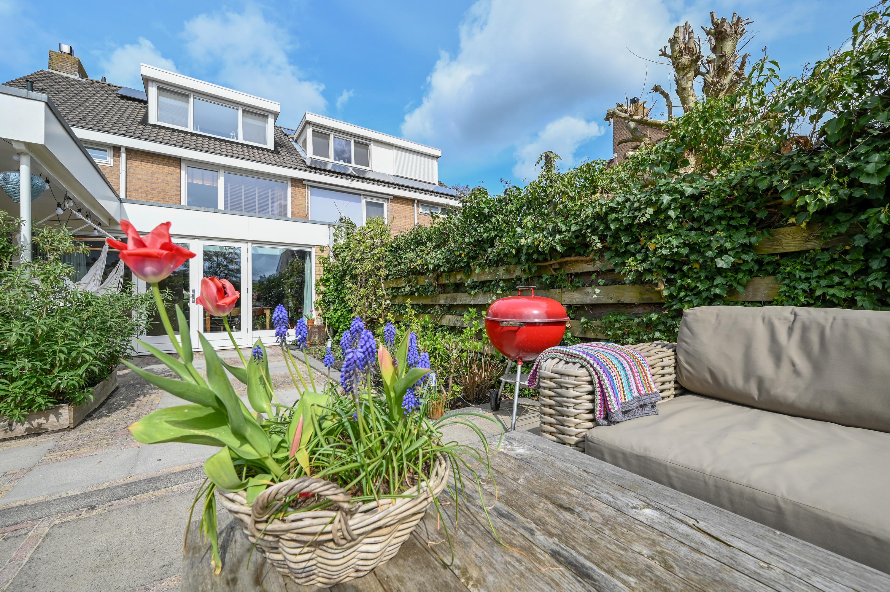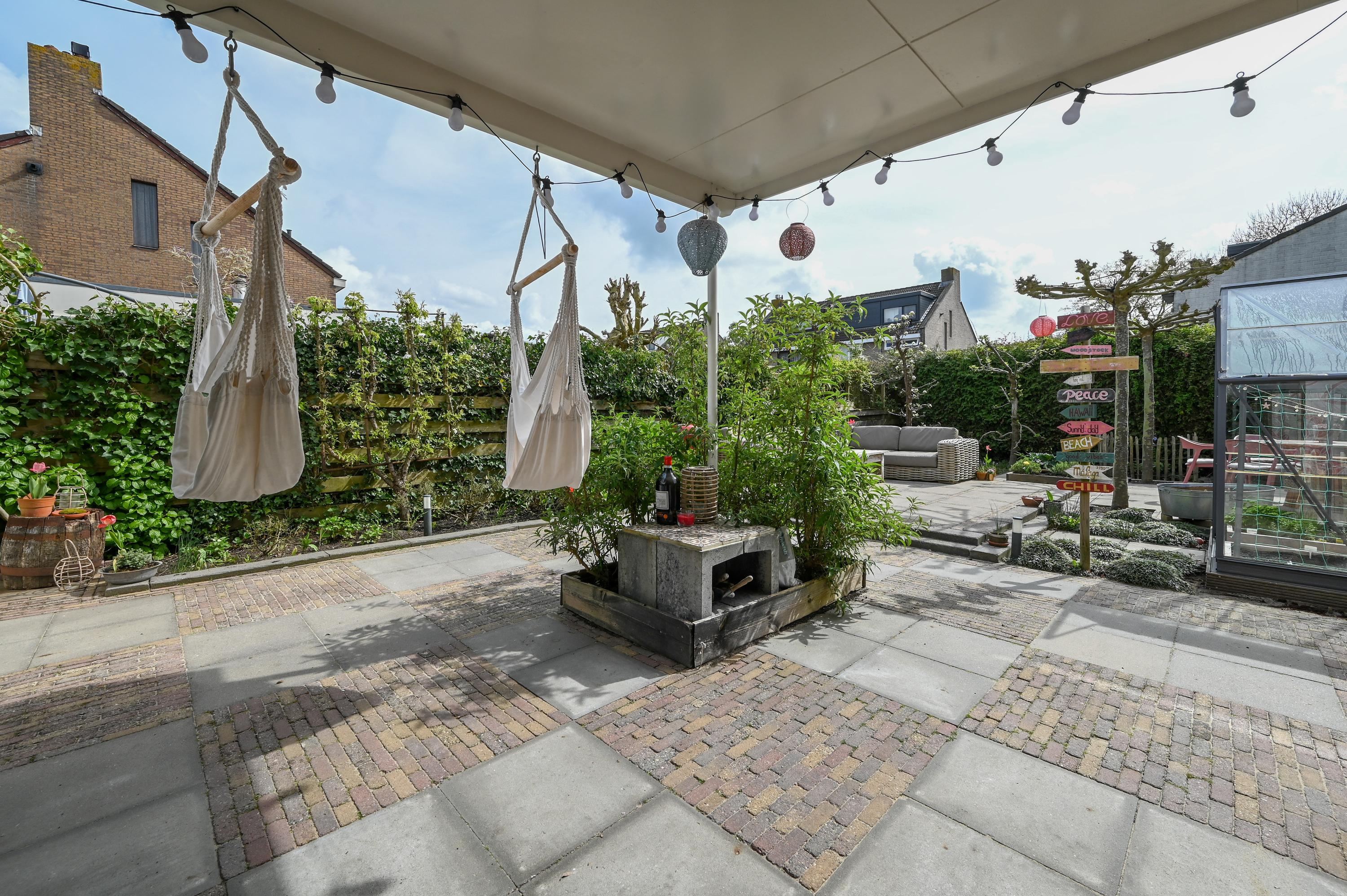 The garden has been thoughtfully landscaped with a mix of terraces, borders, and greenery. A small greenhouse offers space for homegrown produce and hobbies, while fruit trees add a playful and natural character. The layout provides multiple seating areas, each offering a different experience of sun and privacy.