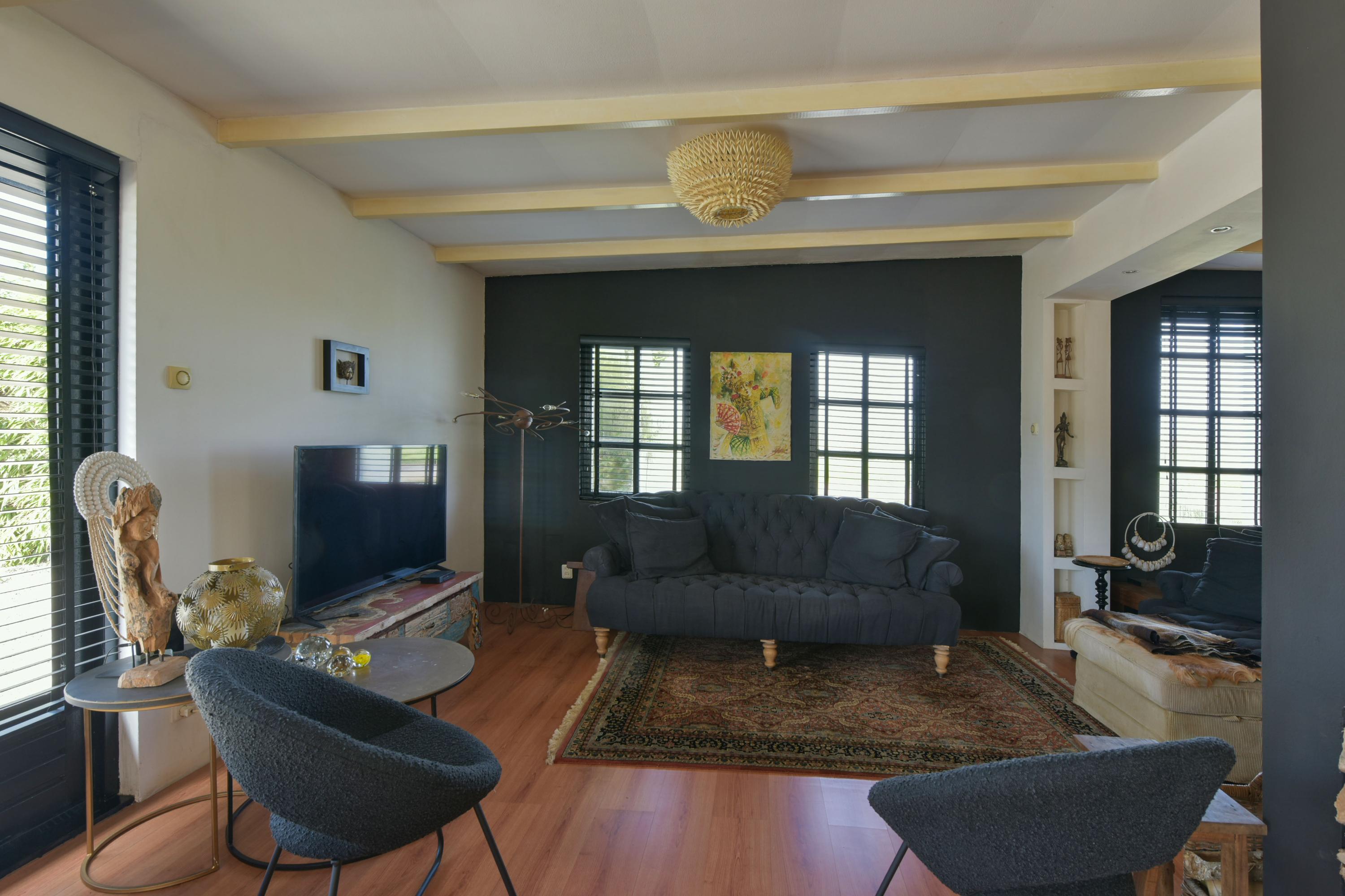 Upon entering the hallway, you will find a wardrobe closet, a toilet with washbasin, and access to the living room. As soon as you step into the very spacious U-shaped living room, you immediately notice the abundance of space and natural light this home has to offer. Thanks to the side extension, a generous living area has been created where multiple seating and living areas can easily be arranged.