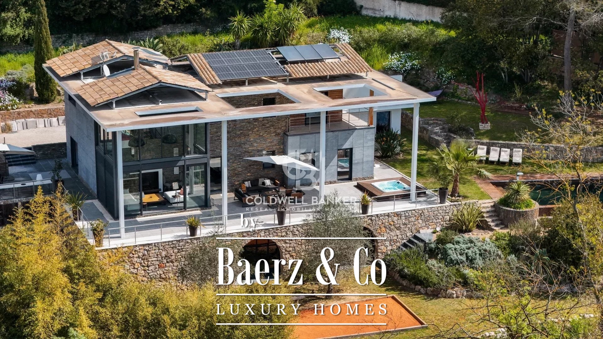 Villa Mougins embodies contemporary refinement, set within a sought-after residential enclave where panoramic views of the hills and the historic village unfold from its elevated position. The villa, with a total living area of 500 m², is defined by clean architectural lines and an abundance of natural light, offering a restrained yet inviting atmosphere.