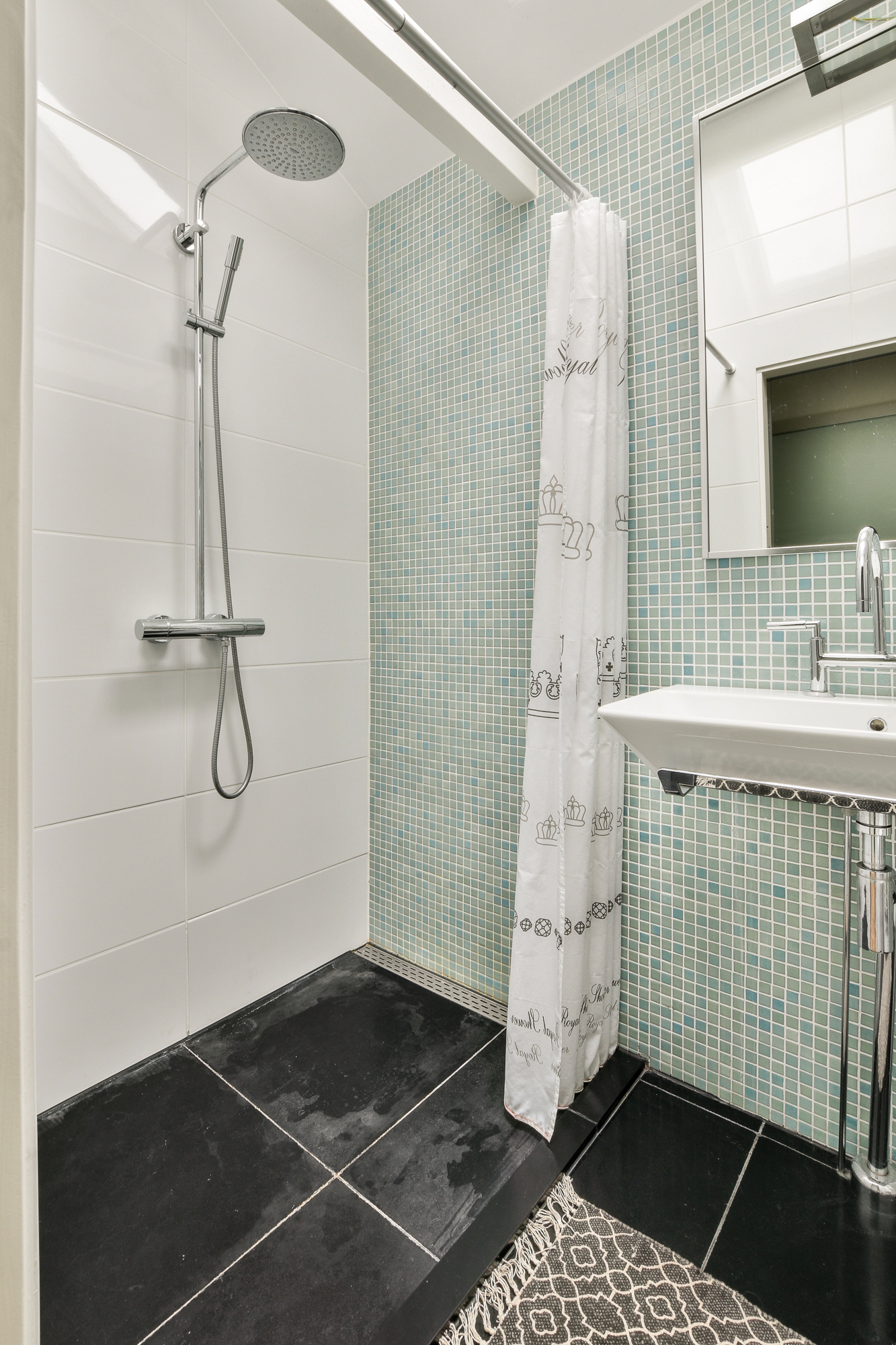 The bathroom is modern in design and equipped with a walk-in shower, washbasin and toilet. The space is efficiently laid out and reflects the well-maintained condition of the houseboat, where comfort and functionality come together.