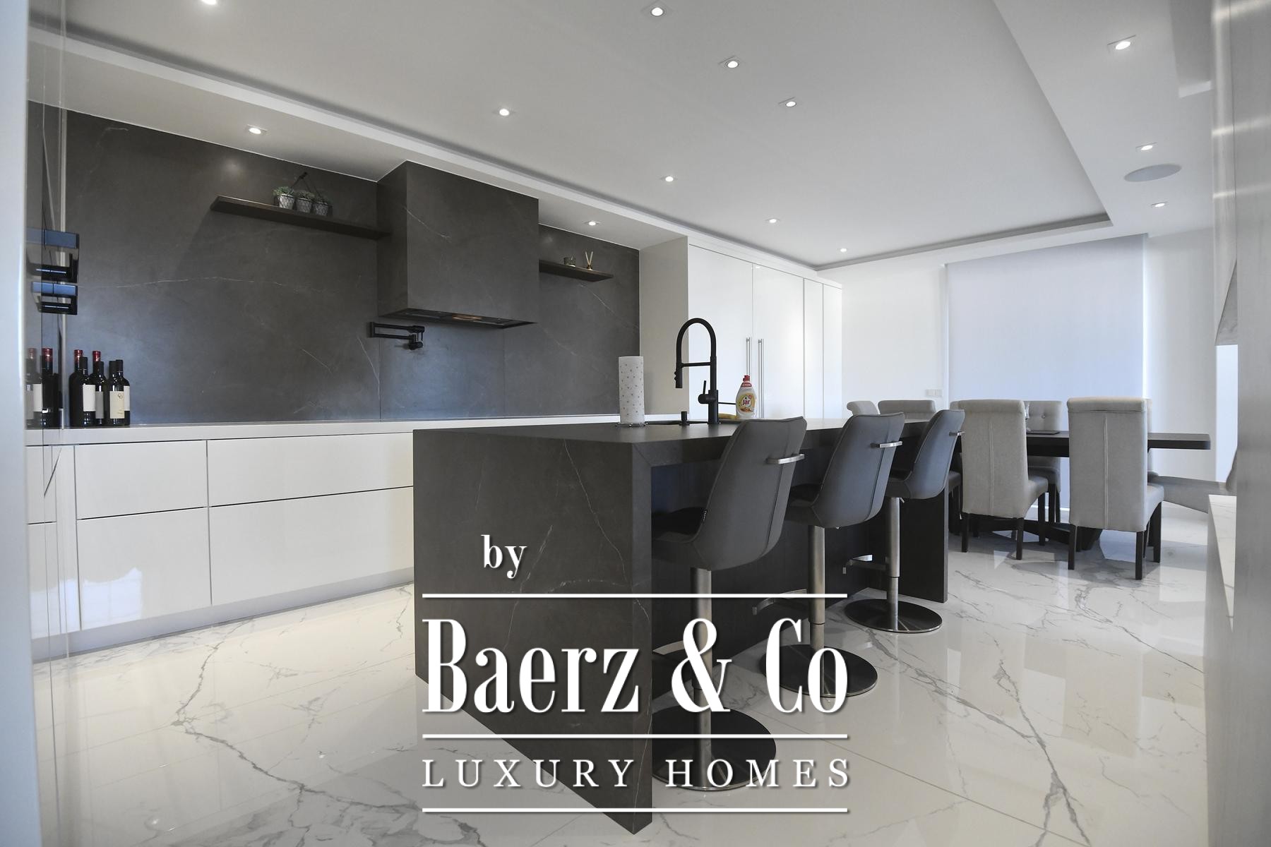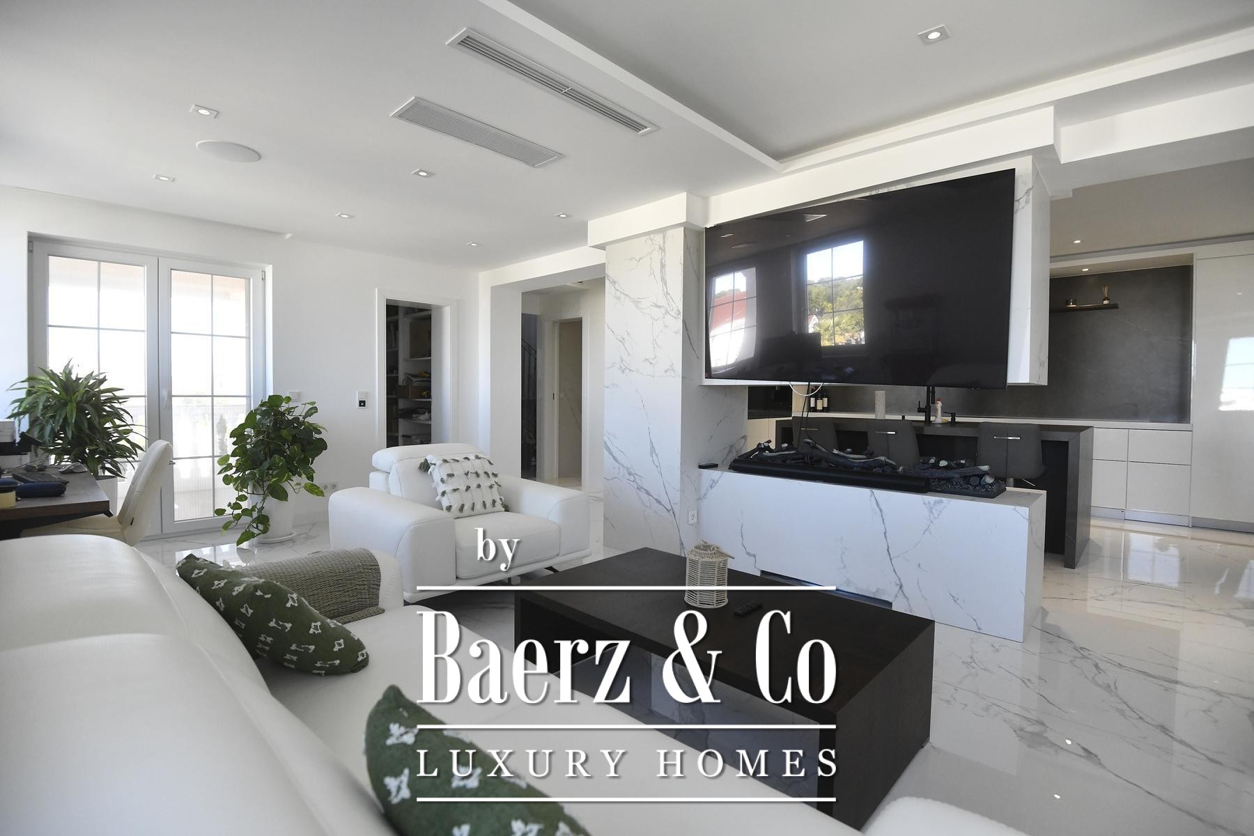 The focus here is on seamless spatial flow. An open-plan living and dining area is anchored by a marble-clad fireplace, set under a ceiling that draws in natural light from large glass surfaces and French doors that frame sea views. The tactile warmth of three-layer parquet floors is balanced by underfloor heating and discreet ceiling air conditioning, all managed via an advanced smart system for lighting, blinds and climate.