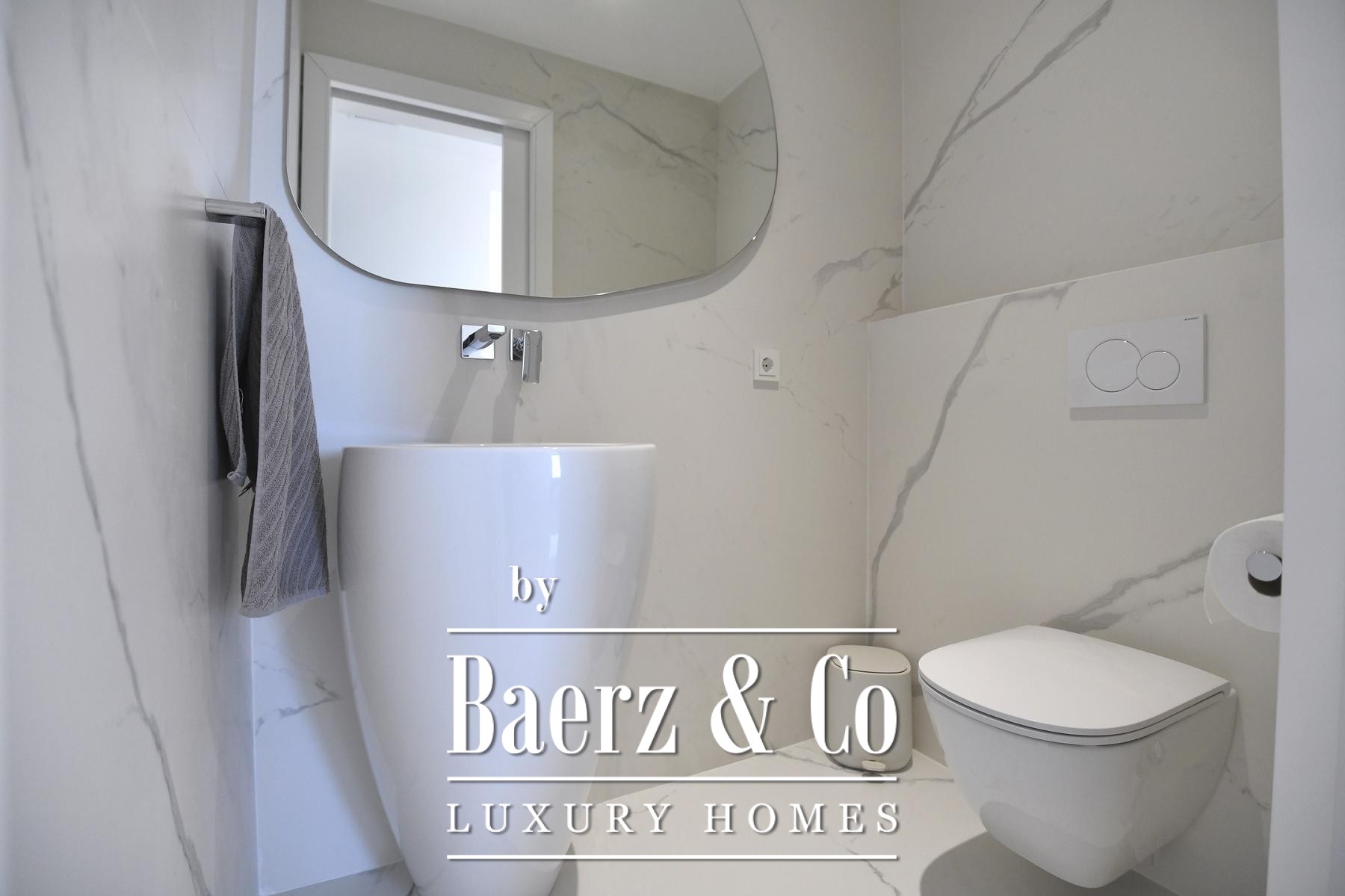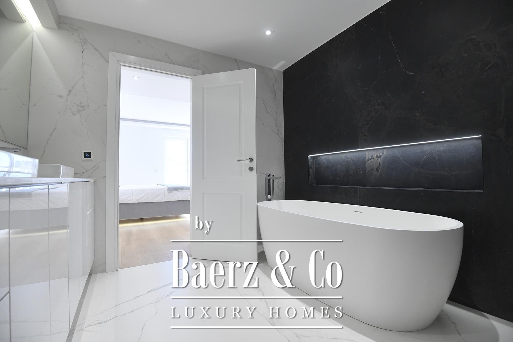 The kitchen, fitted with Miele and Liebherr appliances and quartz worktops, embodies functionality and craft. Four bedrooms and four bathrooms occupy the upper level, each space unfolding in calming neutrals, natural stone and wood. The private roof terrace stands apart—generous, intimate, and appointed with a bioclimatic pergola and jacuzzi, offering panoramic views across Zaton and the Adriatic horizon.