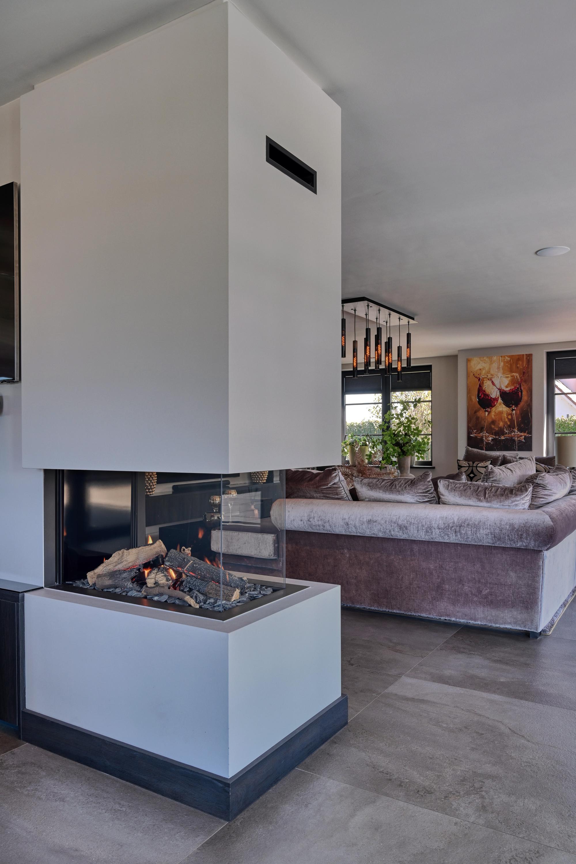 The spacious living room, featuring a room divider with two gas fireplaces, has a warm and inviting atmosphere and direct access to the garden.