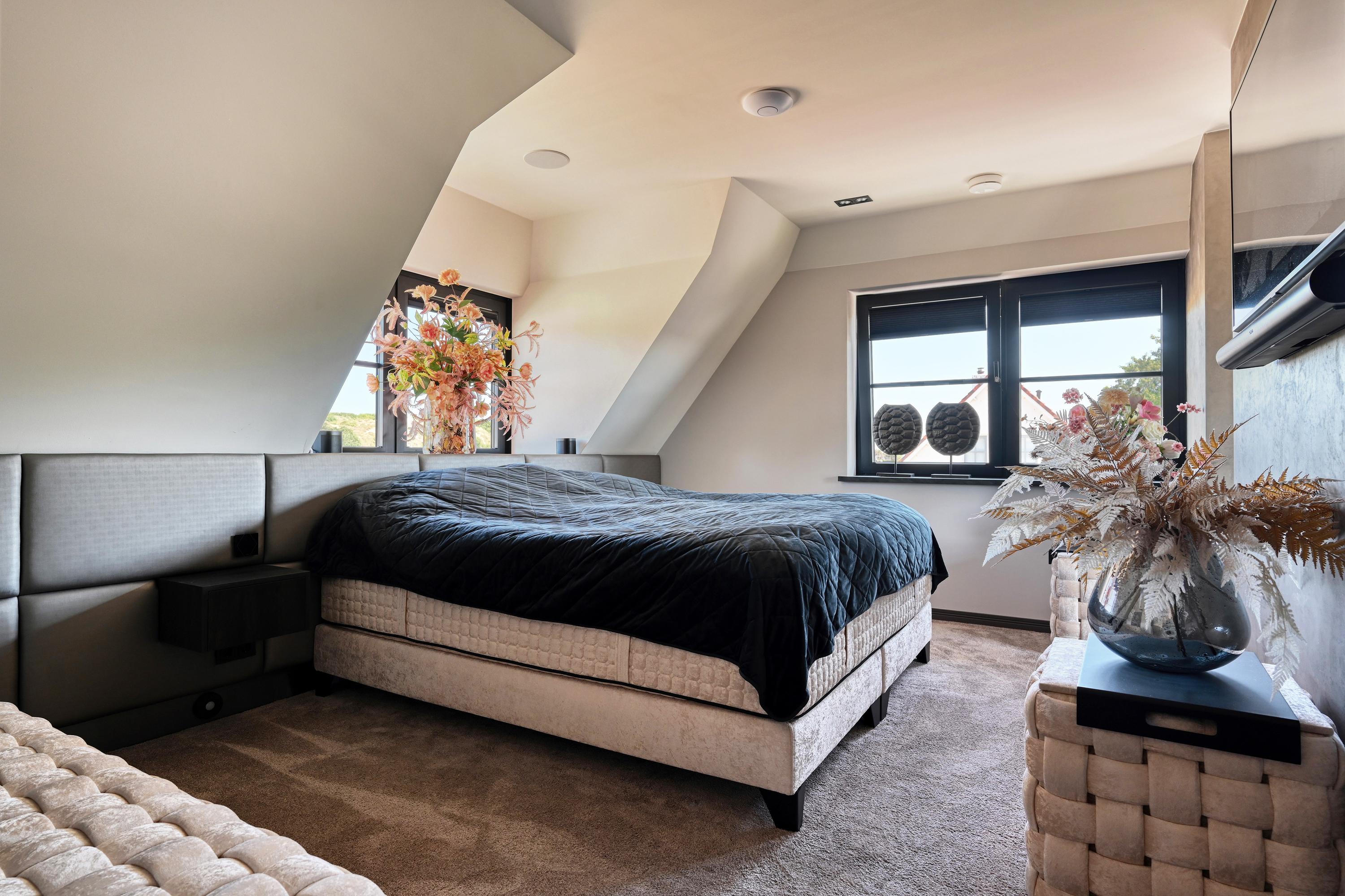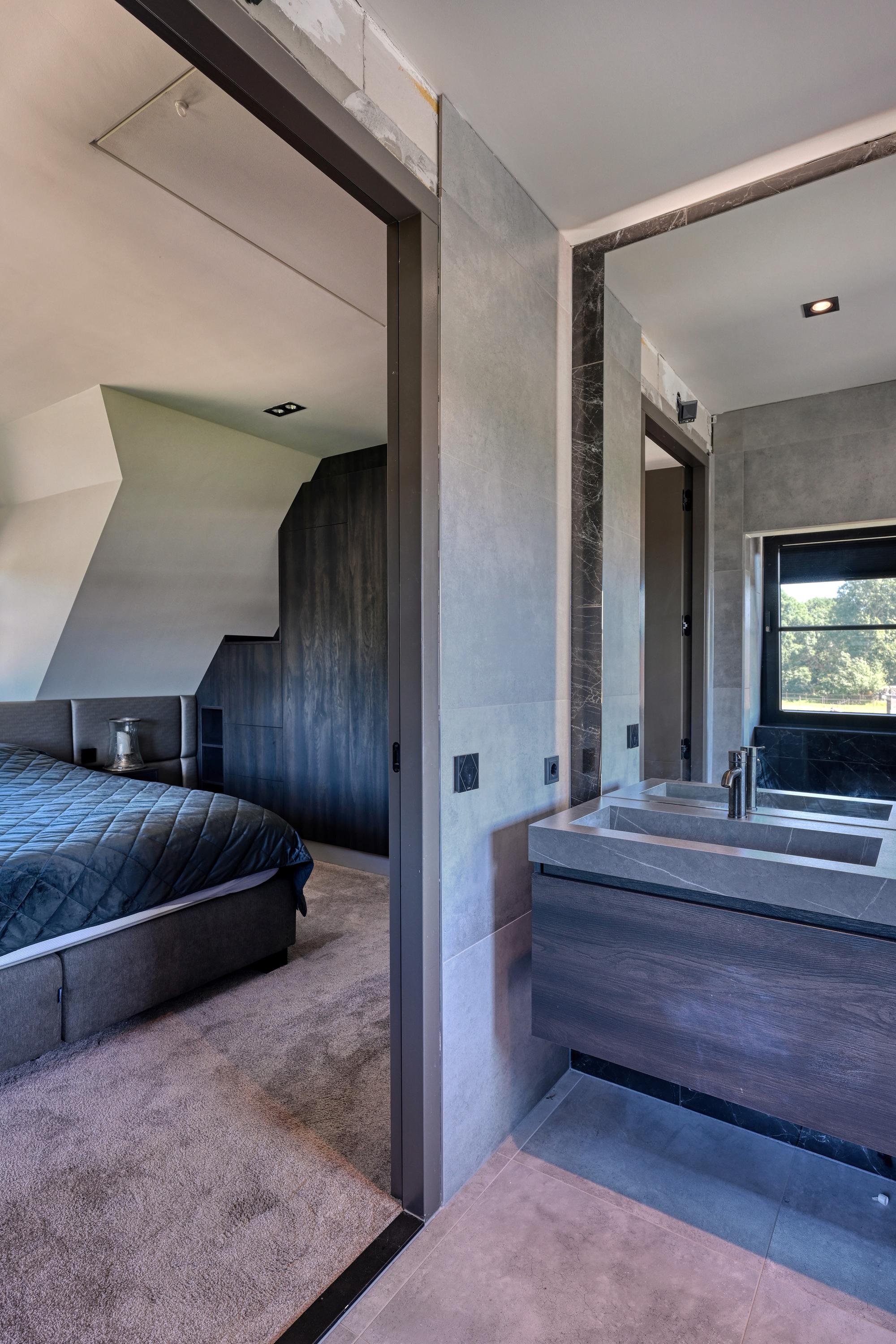 The first floor features two spacious bedrooms and two luxurious bathrooms, both exuding the same warm ambiance but offering varying views of bulb fields and dunes. The master bedroom has its own elegant walk-in closet, leading directly to an en-suite bathroom equipped with a bathtub, a luxurious double vanity, a shower, and a separate toilet.
