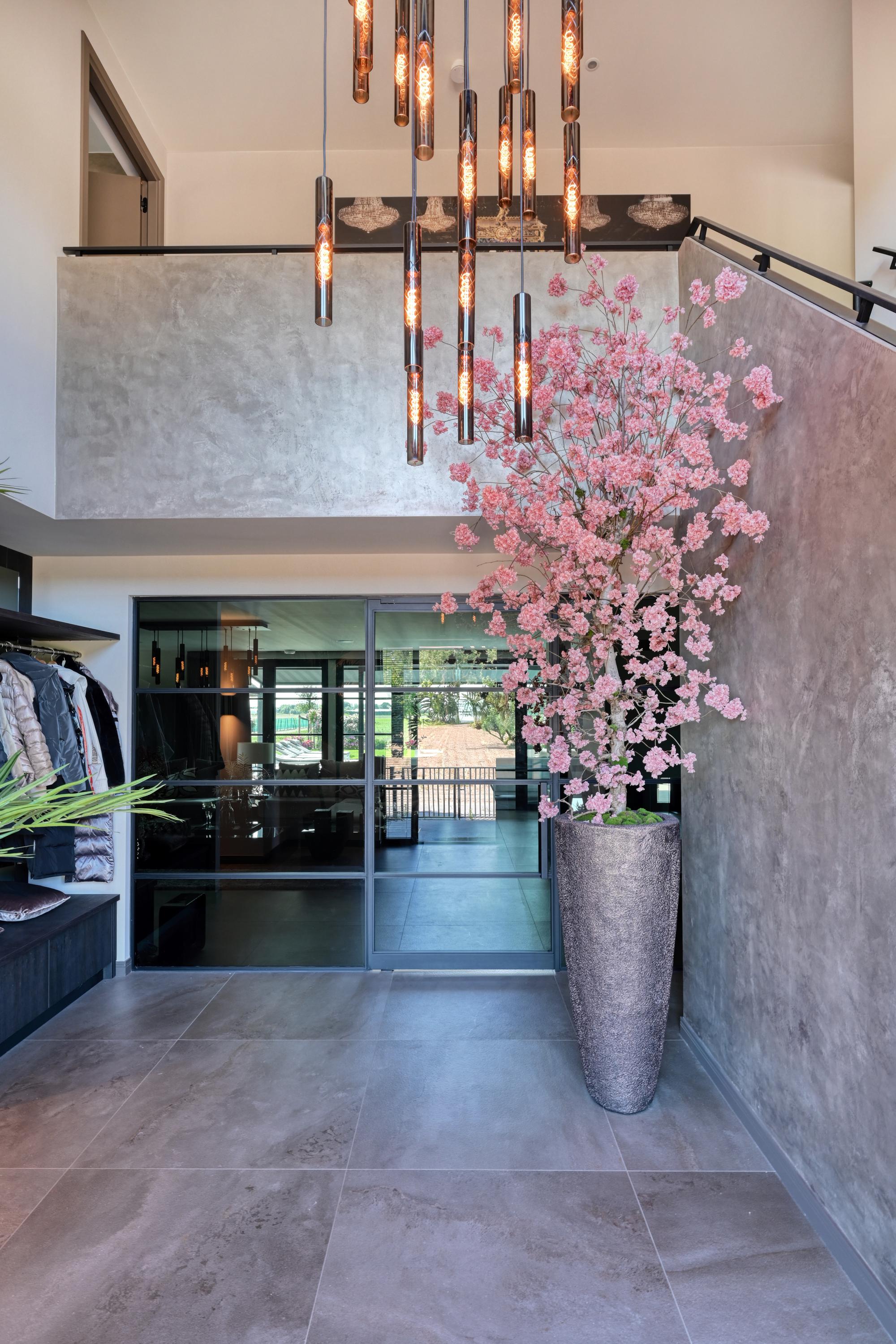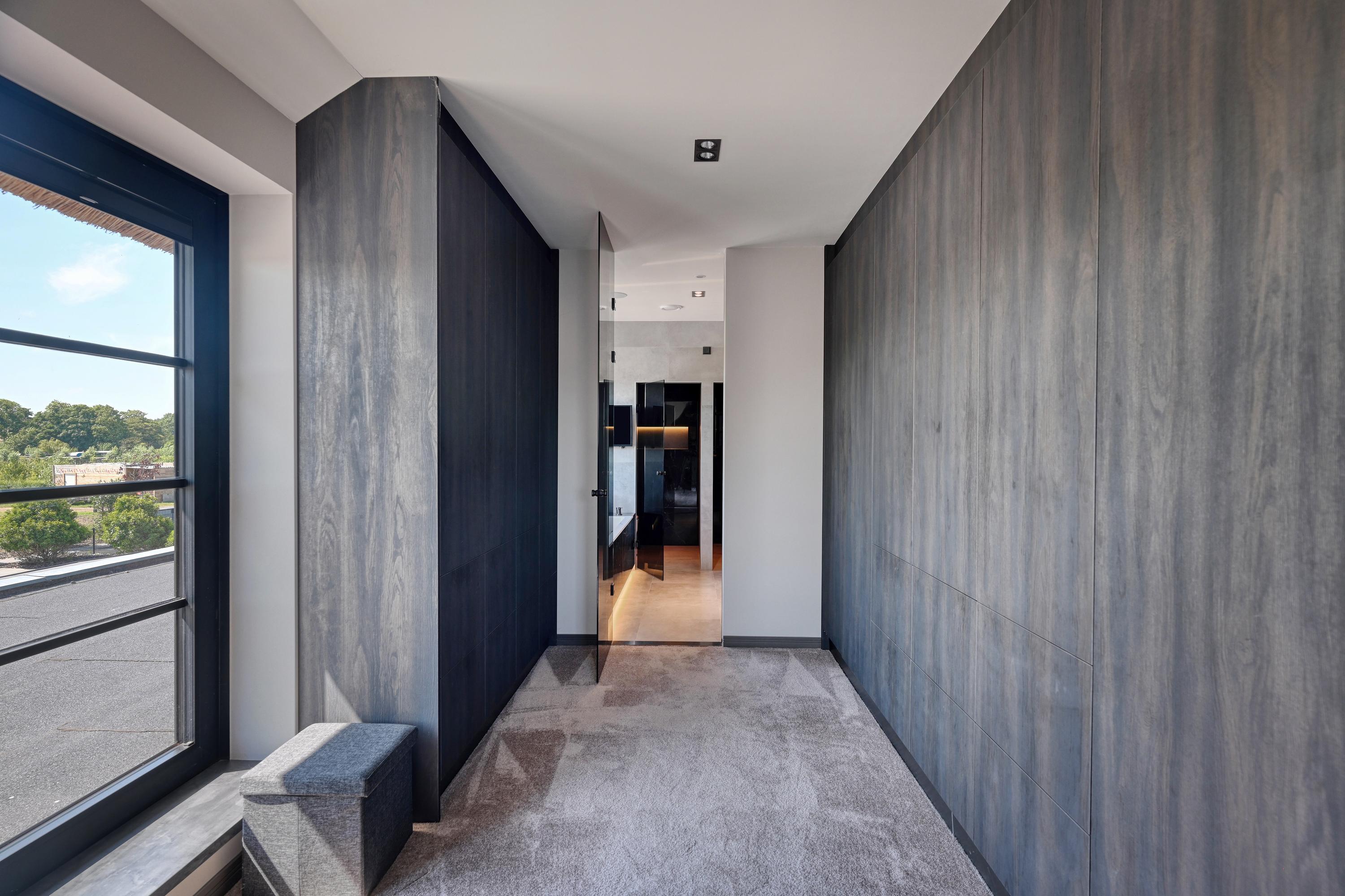Upon entering, you’ll find a spacious entryway with a loft and a beautiful staircase; it immediately becomes clear that this villa was designed with a sense of space and elegance. Steel doors with smoked glass provide access to the living room.