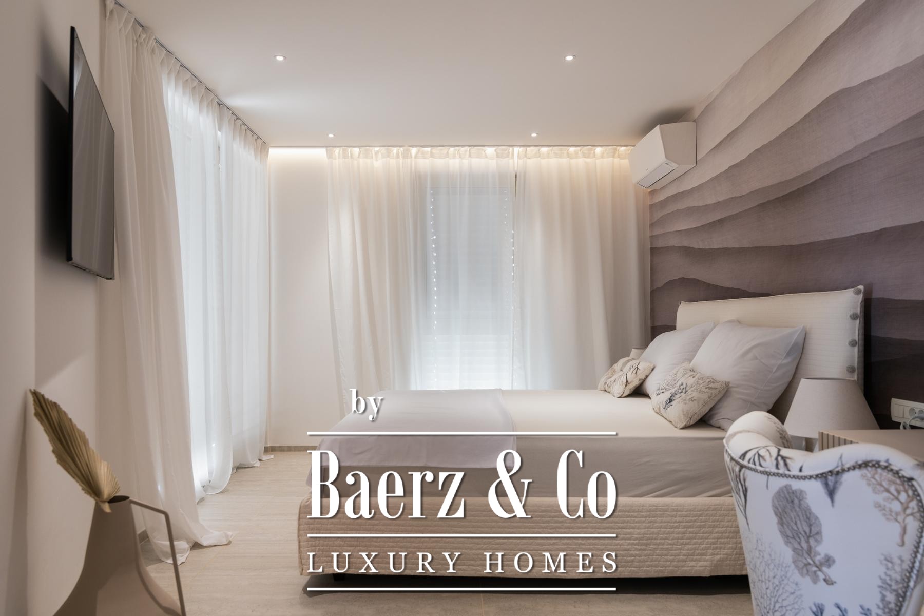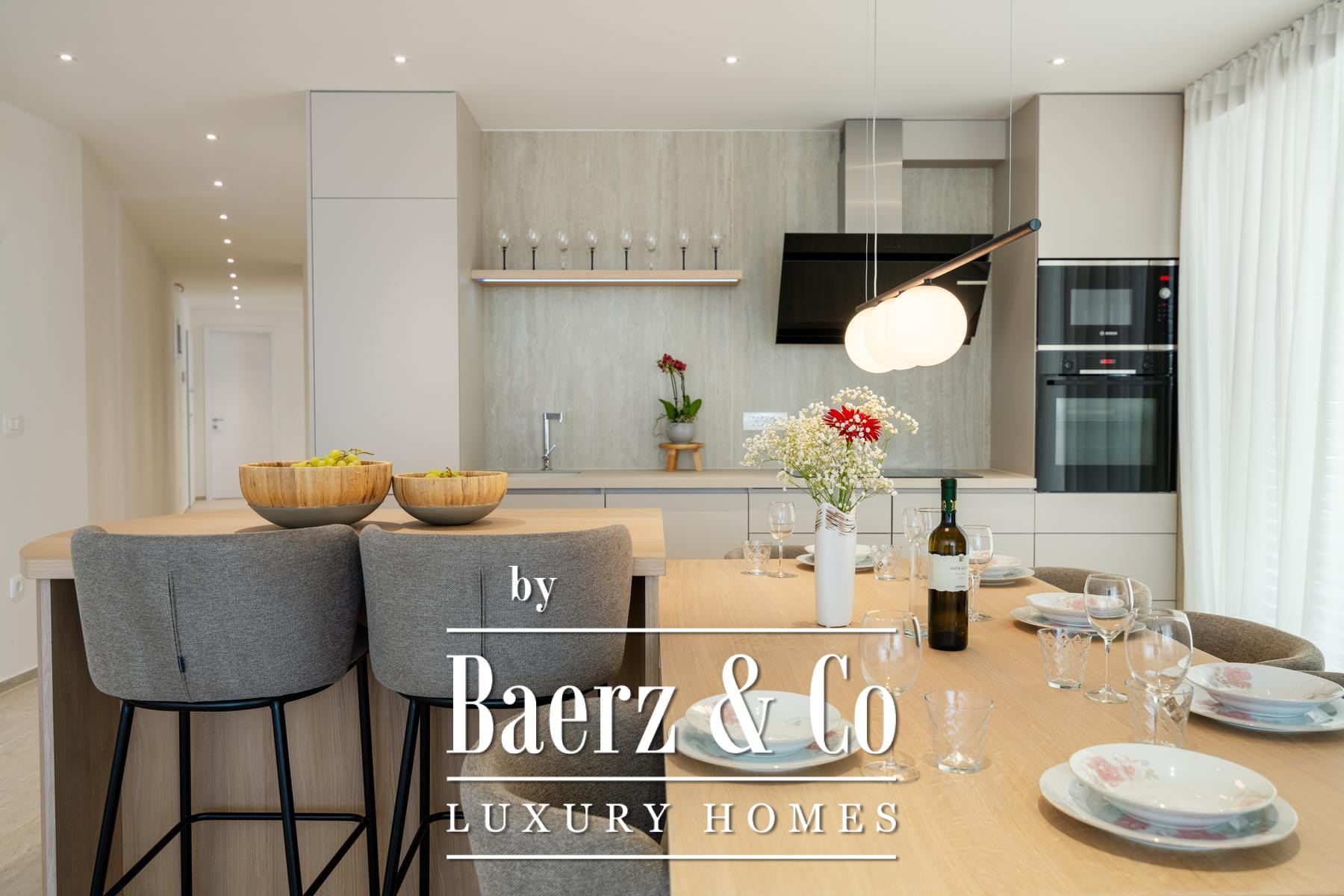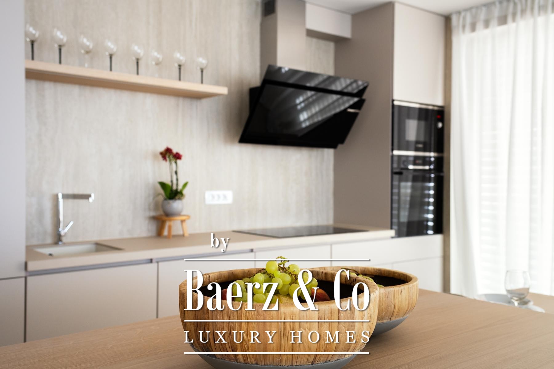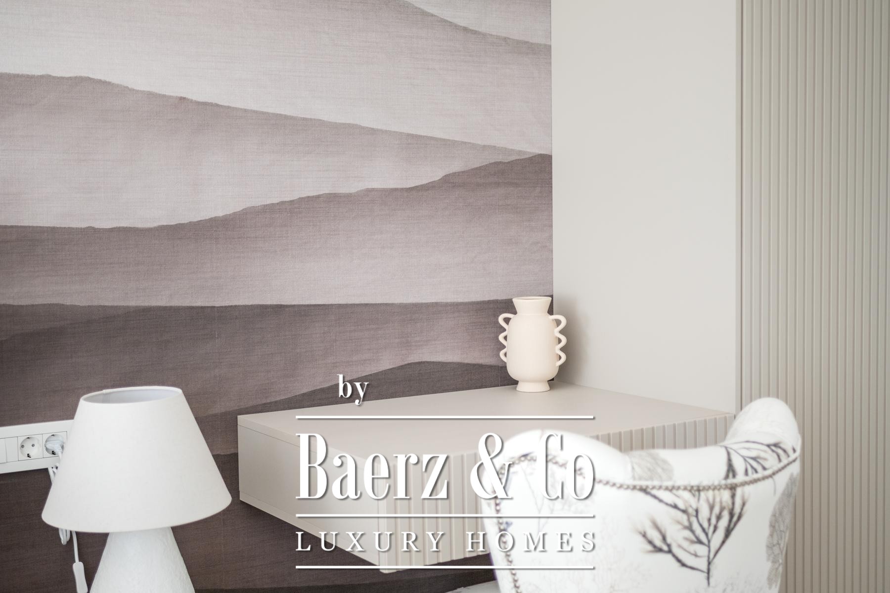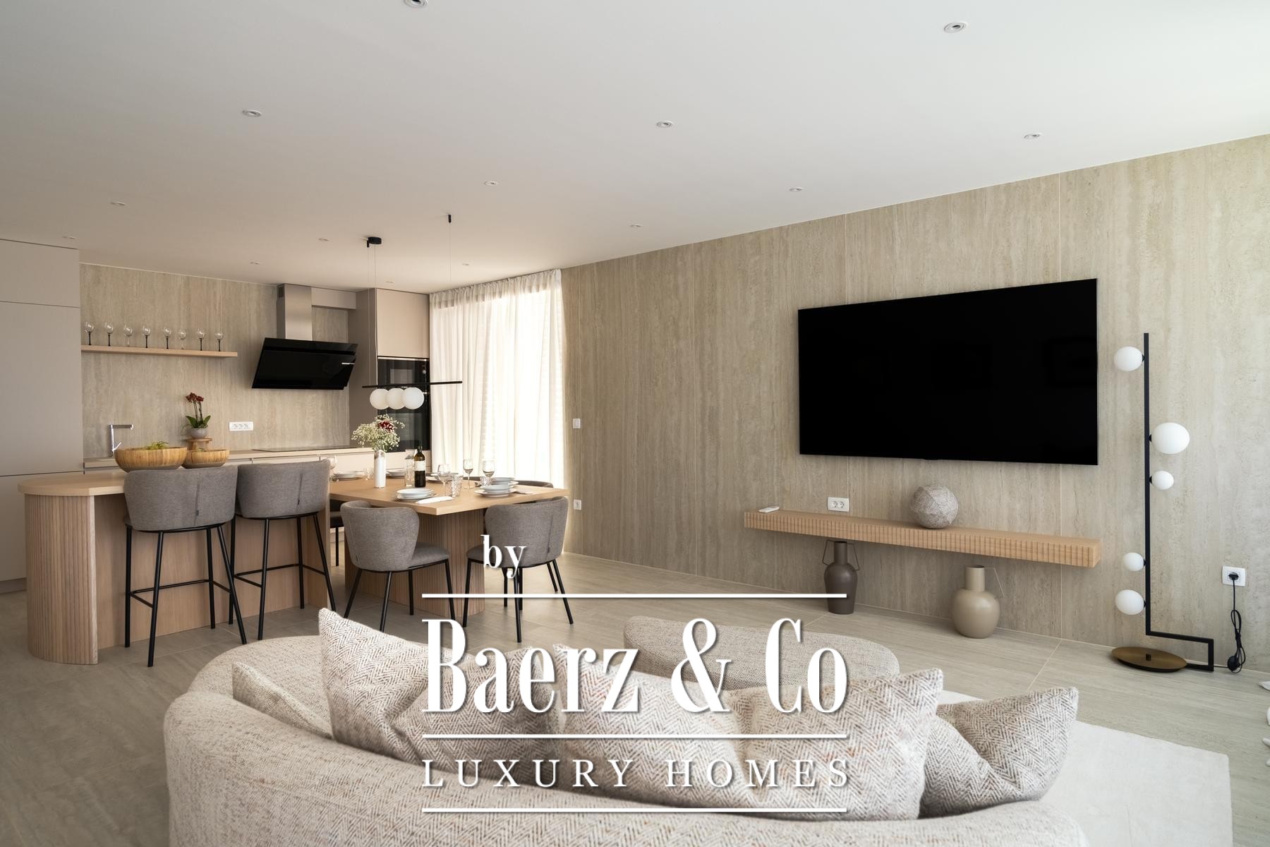 Light fills the open-plan living area where kitchen, dining, and lounge flow seamlessly onto a covered terrace with expansive sea views. The master bedroom enjoys its own private bathroom and balcony, while two further bedrooms share a well-appointed bathroom. Every element, from Bosch appliances to underfloor heating and air conditioning, prioritizes comfort and quality. The apartment extends its atmosphere of ease with two parking spaces, a private storage area, and access to a heated saltwater pool, sauna, and gym.