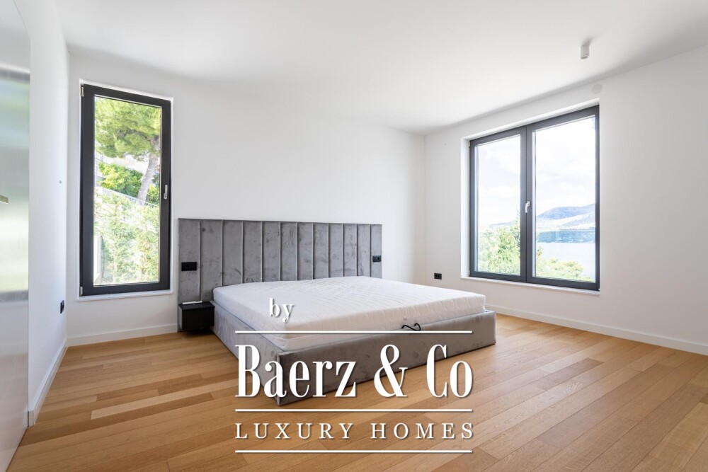A garage accommodates two cars, and every comfort suits year-round living. Full air conditioning, top-tier sanitary fittings, and turnkey readiness frame the daily experience. The complex ensures access to the sea, with the possibility for yacht mooring. This luxury villa for sale in Okrug captures Croatian island living, where refined design and the elements converse quietly.