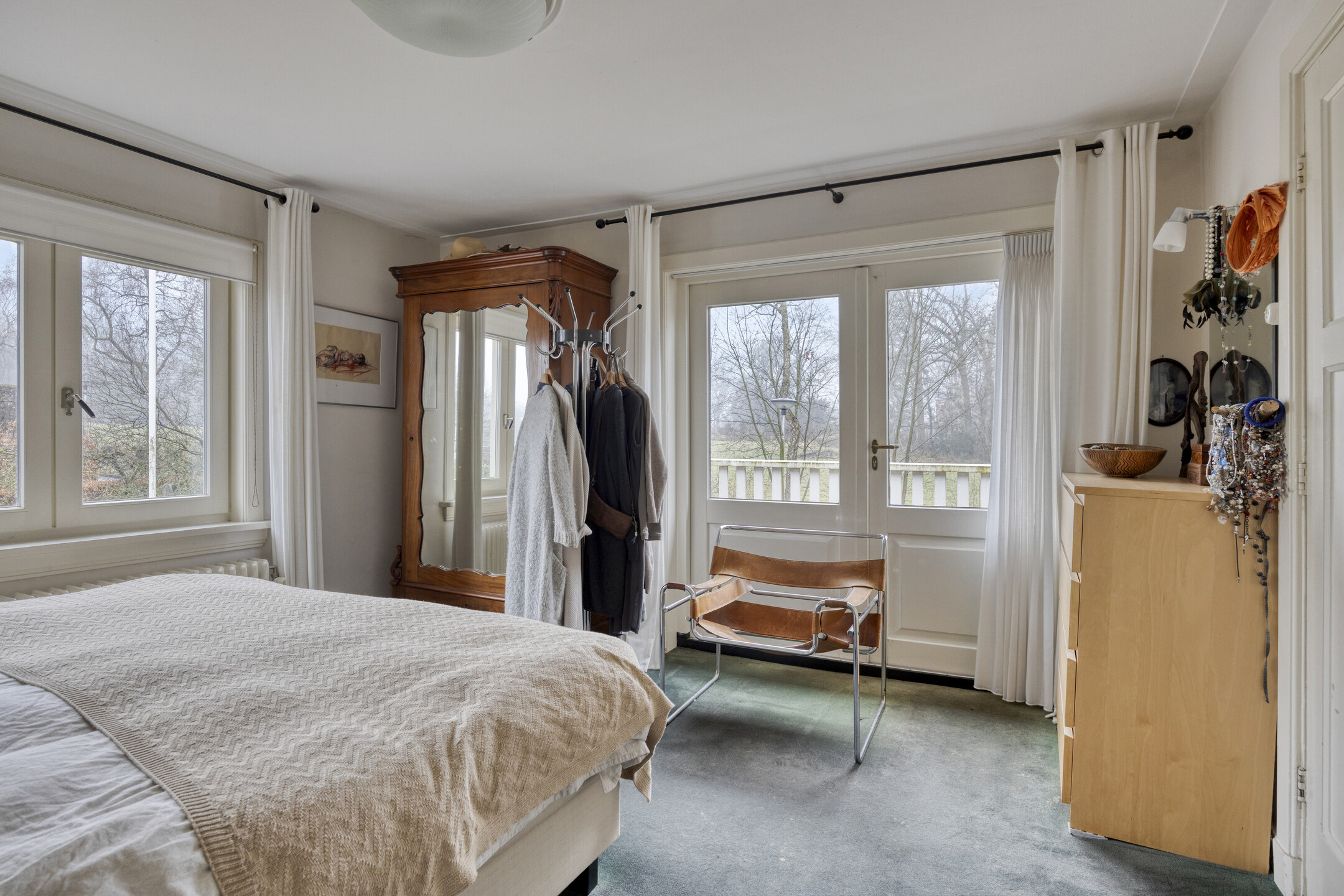 De ruime woonkamer heeft door de vele raampartijen en de karakteristieke erker een prachtige lichtinval. Vanuit de aangrenzende serre is er blijvend vrij uitzicht over het weiland. Zowel vanuit de woonkamer als vanuit de serre openen openslaande tuindeuren naar de royale tuin.