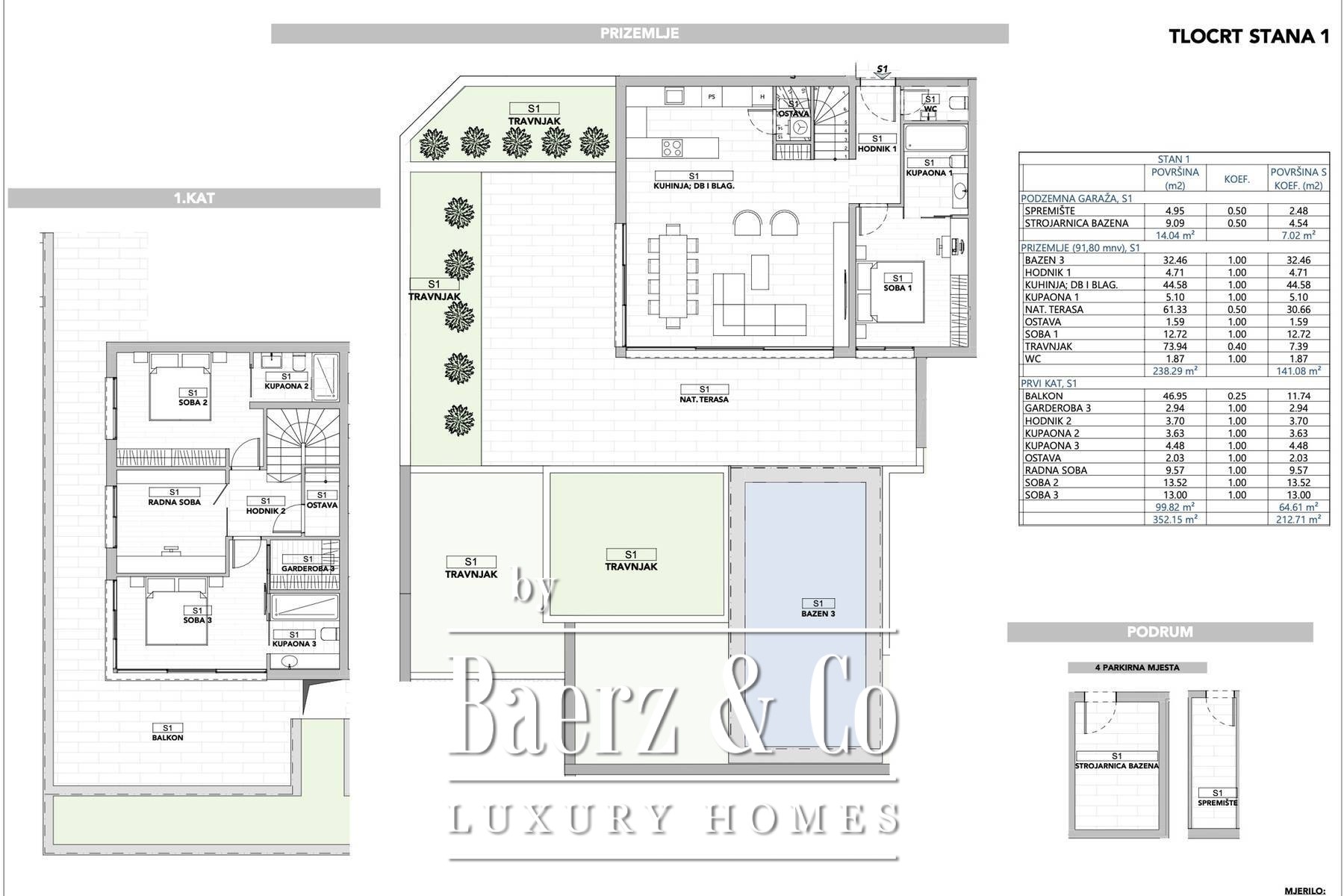 Three bedrooms and three bathrooms, a dedicated study, and a dressing room provide a sense of completeness. Finishes include underfloor heating, air conditioning, electric blinds, security doors, and video surveillance. Four garage parking spaces and a storage room underline the practical ease of ownership. Located above Opatija, with its Habsburg-era villas and vibrant promenade, this apartment offers a rare blend of architectural poise and access to the coast.