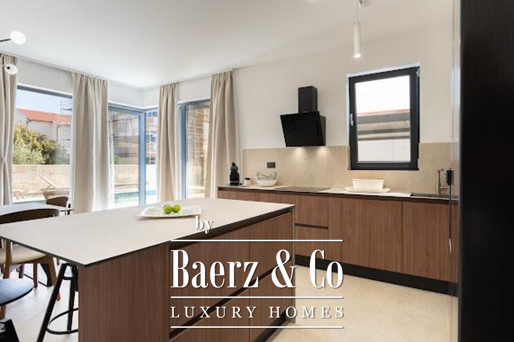 Pag Mandre, semi-detached house with swimming pool is located on a plot of 465 m2.The house consists of a ground floor and an upper floor, with a total area of 220 m2.On the ground floor there is an open-concept kitchen, dining room and living room, a bedroom with a bathroom, a guest toilet, a laundry room and a storage room.Internal stairs lead to the upper floor where there is an entrance area, three bedrooms with bathrooms and a spacious terrace.It is located 350 meters from the sea and the beach.Equipment:AB constructionflat roof
