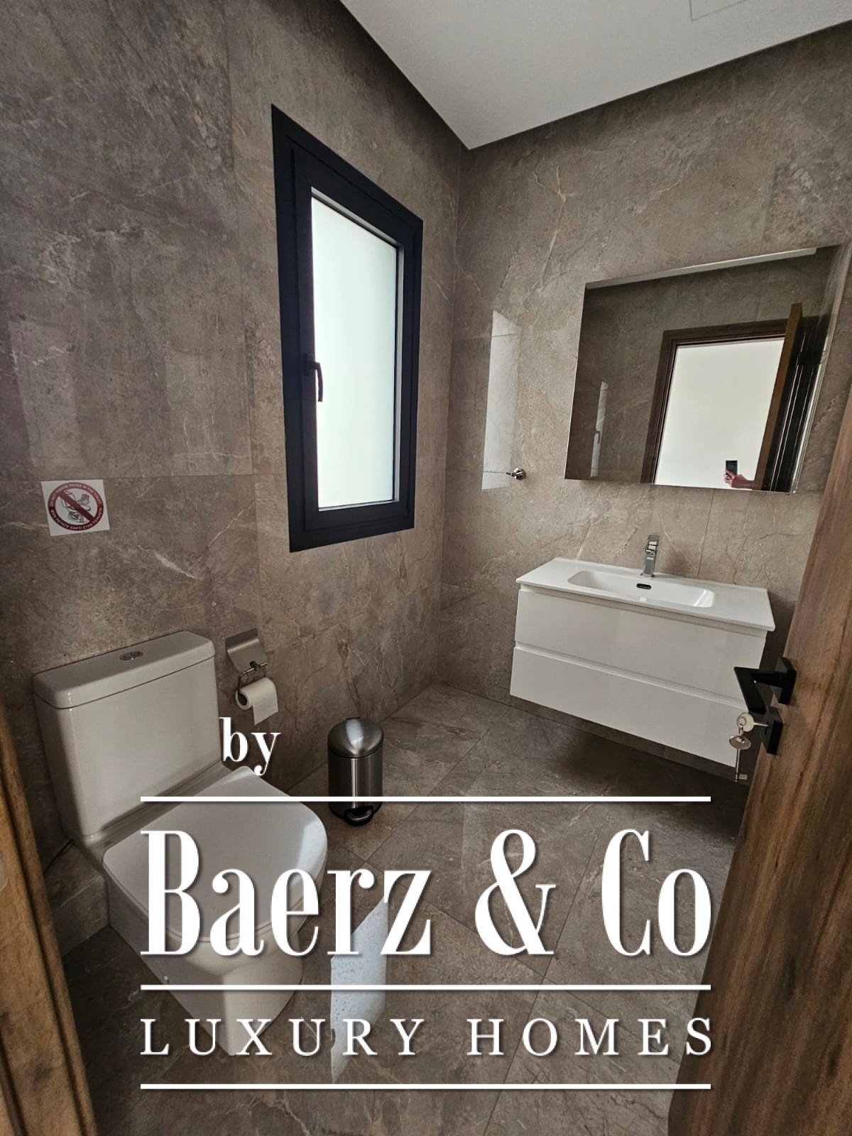 The primary living areas are oriented for natural light, while the villa’s layout accommodates four bedrooms, three bathrooms, and two guest WCs. Premium materials include tiled floors and aluminium double-glazed, energy-efficient windows. Underfloor heating, air conditioning, a ventilation system, and sound and thermal insulation ensure year-round comfort. An internal elevator and staircase connect all floors, emphasizing convenience and accessibility.