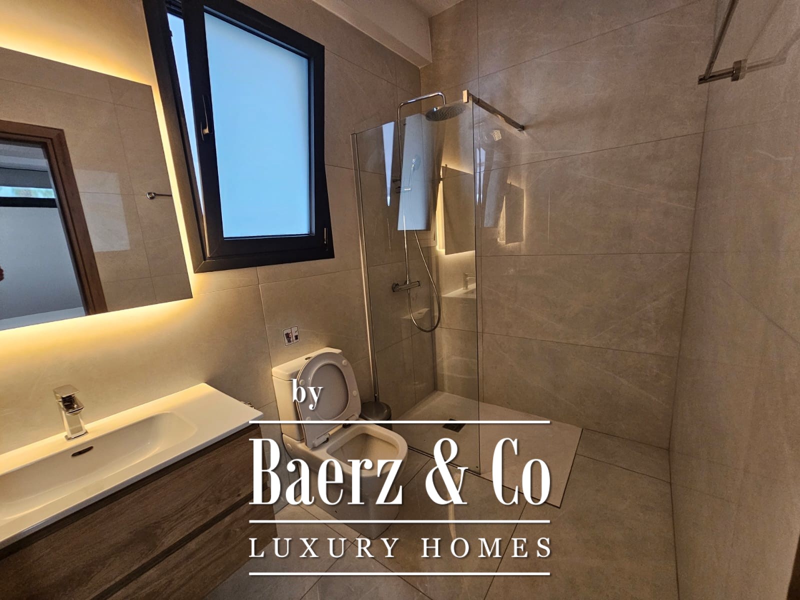 Set within a landscaped 888 sq.m. plot, the villa invites residents to savour quiet moments by the private swimming pool, host gatherings in the sunlit BBQ area, or simply relax in the exceptional living spaces. The layout includes four bedrooms, three bathrooms, and two guest WCs, while a service room adds further convenience. Interiors are finished to exacting standards, featuring large-format tiles, aluminium double-glazed windows for thermal and sound insulation, and a fully integrated underfloor heating and air conditioning system.