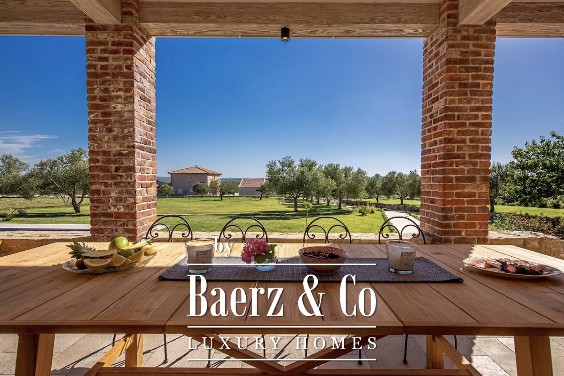 Stone villa Poličnik Zadar stands as a rare expression of Mediterranean architecture, set within a generous 7,800 m² garden distinguished by mature olive and palm trees. This villa, offering 360 m² of living space and five bedrooms across two floors, seamlessly blends rustic Dalmatian character with modern minimalism, resulting in a refined and inviting environment.