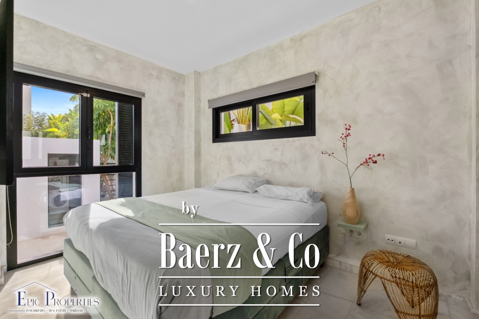 Charming villa located in a quiet residential area. This property offers a bright and spacious environment with high ceilings and marble flooring throughout the house. The home, with 114 m² built on a single floor on a plot of 820 m², features 3 bedrooms and 2 bathrooms. The master bedroom has an en-suite bathroom and a walk-in closet, while the other bedrooms include built-in wardrobes. It has a fully equipped open kitchen that connects to the living room. Large windows