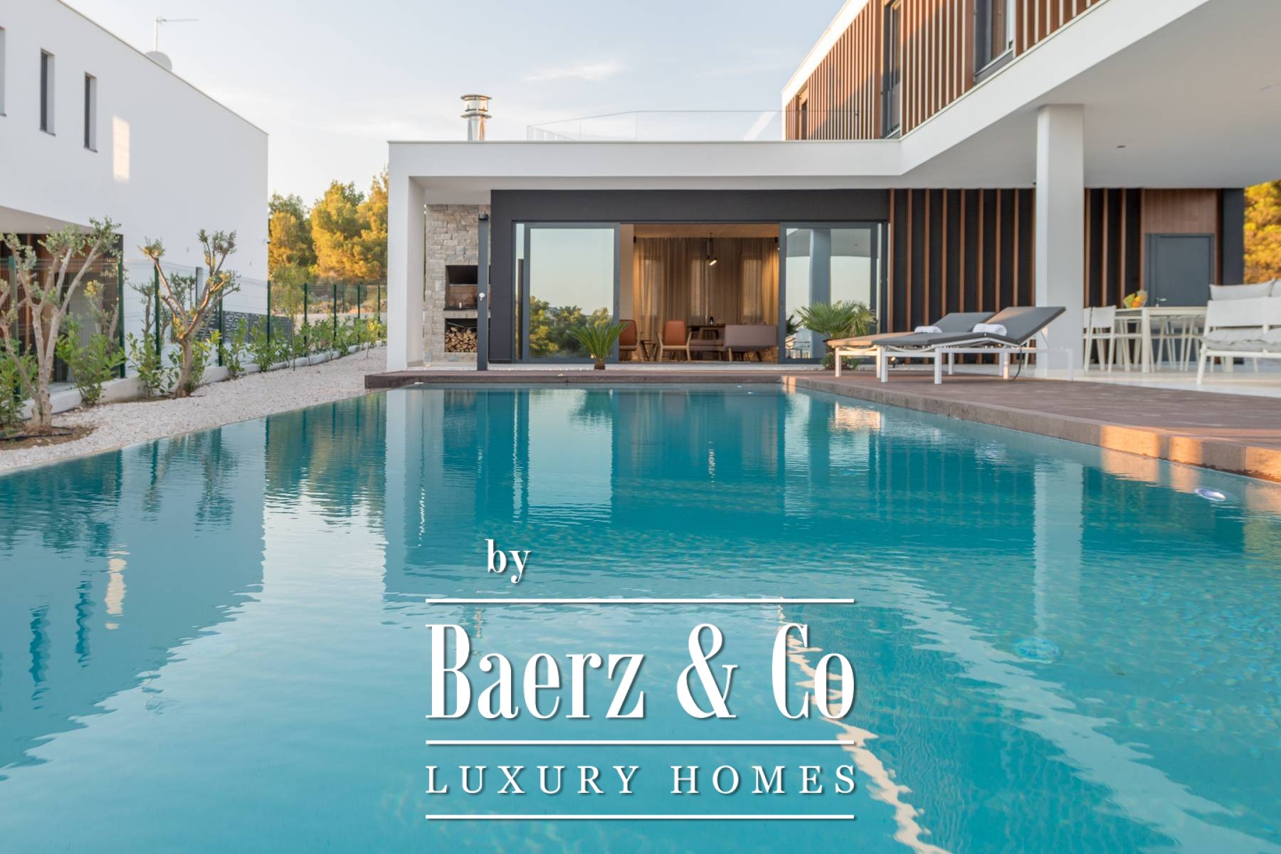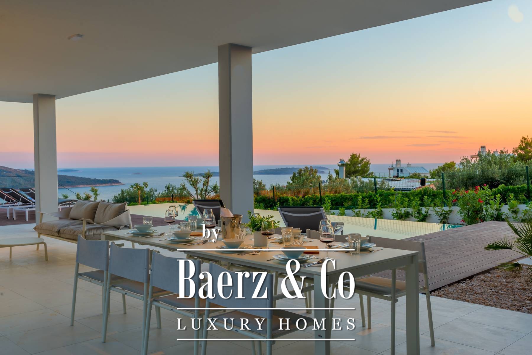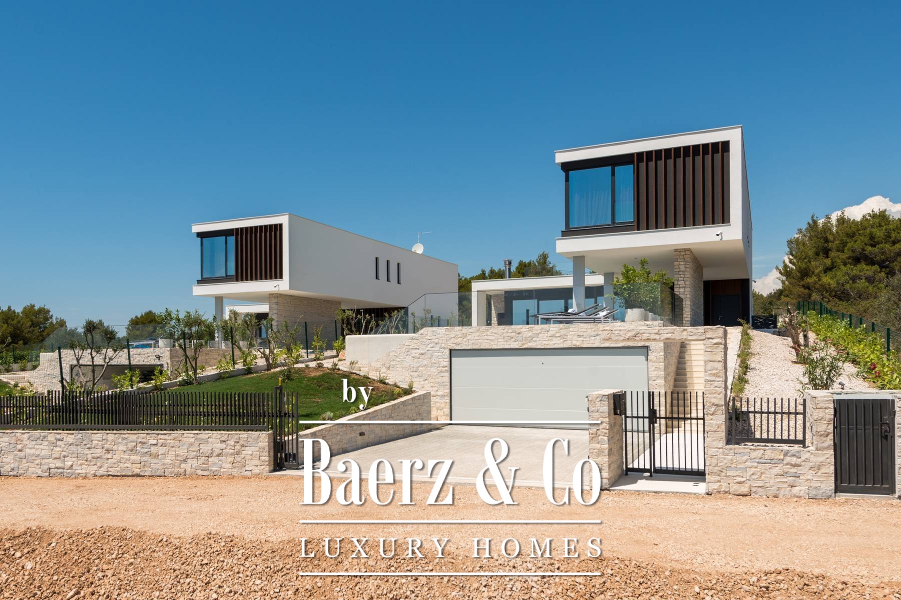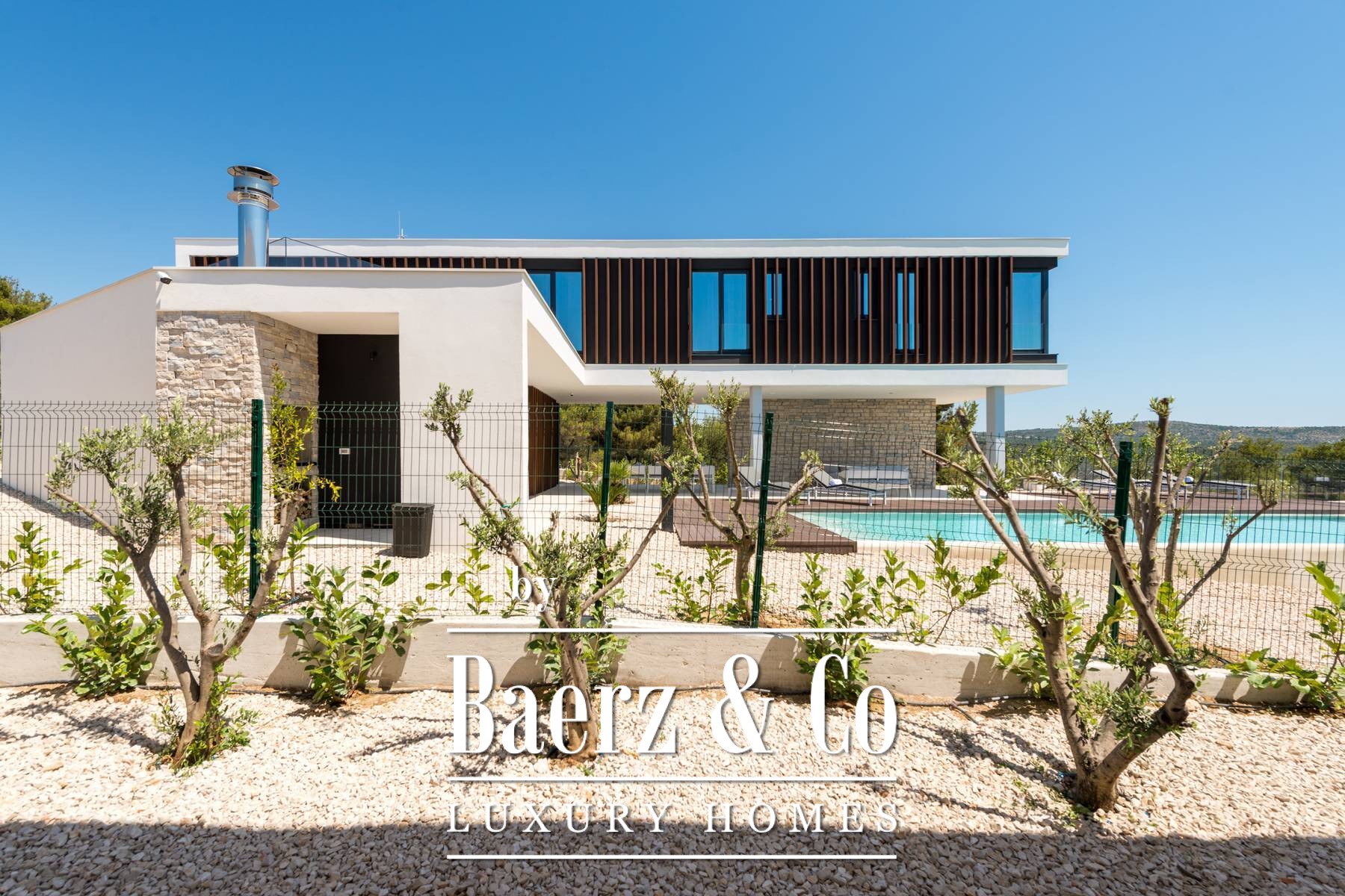 Built in 2020 and fully furnished, the property unfolds across two thoughtfully planned levels. The ground floor features a generous living area, a fully equipped kitchen with dedicated dining space, and practical amenities including a toilet and laundry. Upstairs, four air-conditioned bedrooms each possess an en-suite bathroom, opening to a terrace where panoramic views sweep across Primosten and the islands of the Sibenik archipelago.