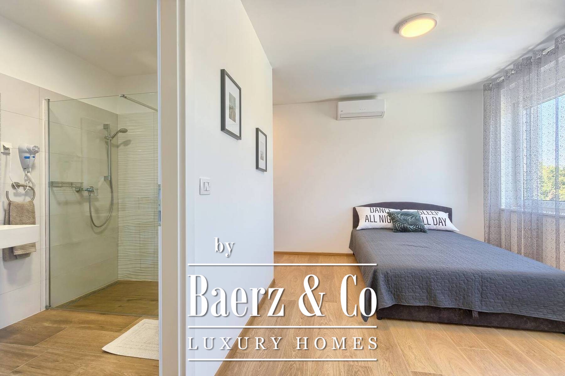 The property’s green garden frames a 64 m² swimming pool, sun terrace, and a hand-made stone fireplace with a sheltered outdoor dining area. Engineered for self-sufficiency, the villa integrates filtered fresh water storage and solar panels, underscoring an ecological and economic commitment. With beaches and local amenities nearby, this villa in Štinjan strikes a rare balance of privacy, design, and environmental responsibility—a compelling proposition for private family life or exquisite rental potential.