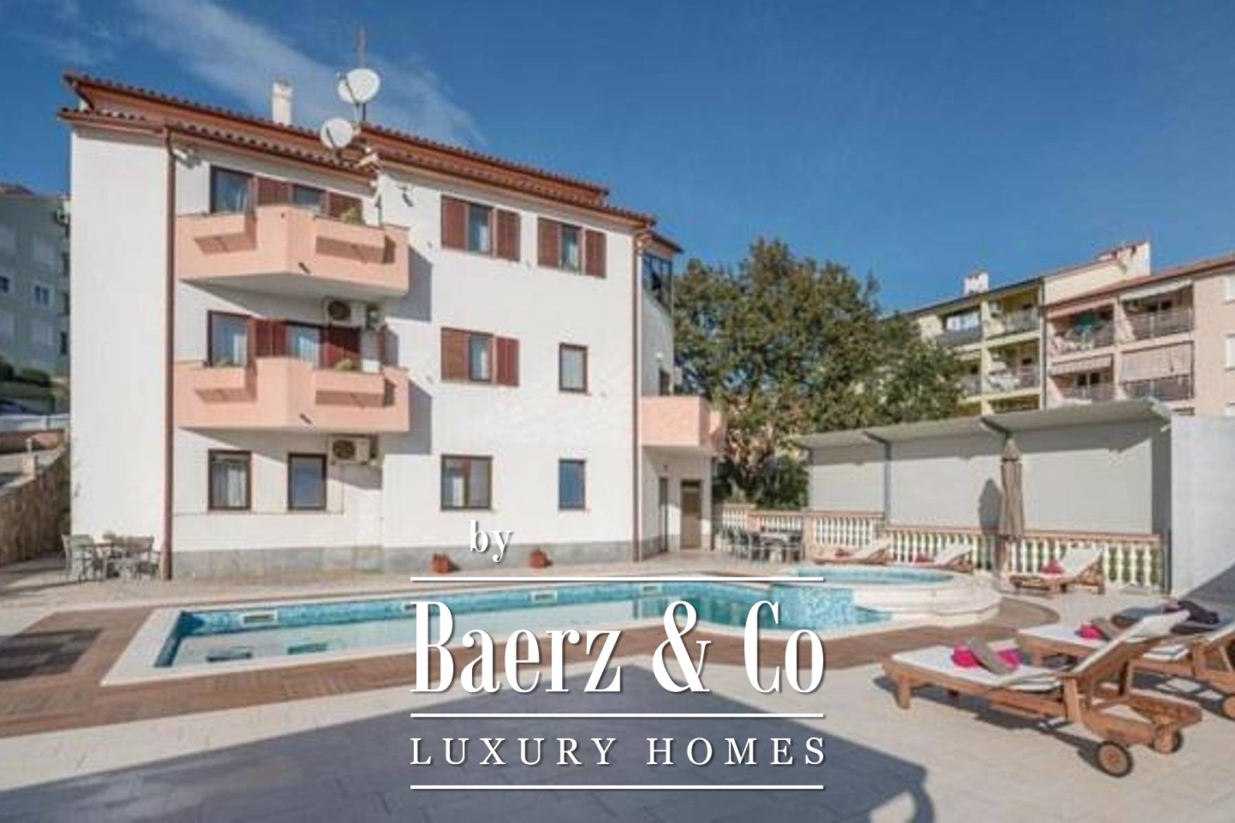 Townhouse Pula offers 501 m² of contemporary living spread across four levels, positioned just 350 metres from the Adriatic in Croatia’s largest Istrian city. This property is designed for privacy and leisure, featuring nine bedrooms and nine bathrooms, each room appointed with climate control and complemented by central gas heating. The ground floor flows from two bedroom suites into a lounge with a jacuzzi, a gym, sauna, and full range of recreation including billiards, table tennis, and table football. The adjoining terrace leads to a private swimming pool with sun loungers and umbrellas, two outdoor toilets, showers, a barbecue, children's park, and volleyball court, all within a 417 m² plot. Six secure parking spaces and a garage offer discreet arrival.