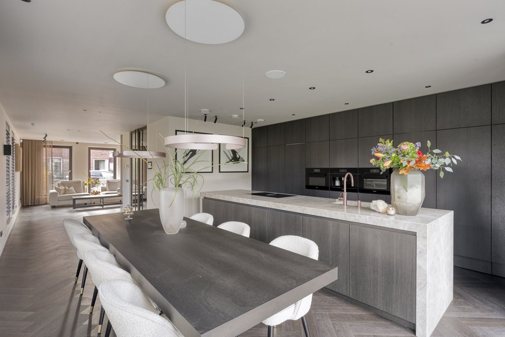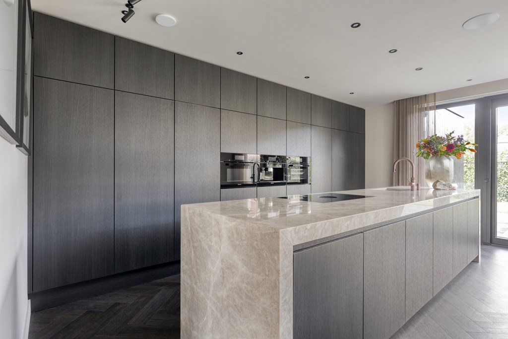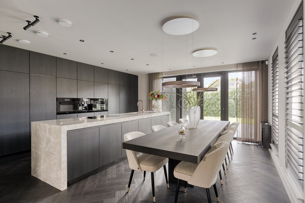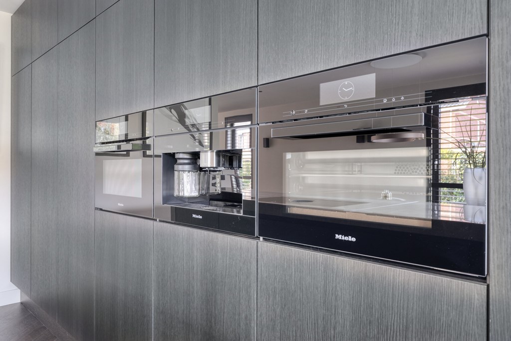 The modern open-plan kitchen forms the heart of the home and is equipped with high-end appliances. The countertop is made of Pure Quartzite, a stylish and durable natural stone. Cooking is done on a Bora induction cooktop with integrated extraction, while the Miele ovens, built-in coffee machine, and the large Siemens refrigerator, freezer and dishwasher ensure optimal cooking comfort.