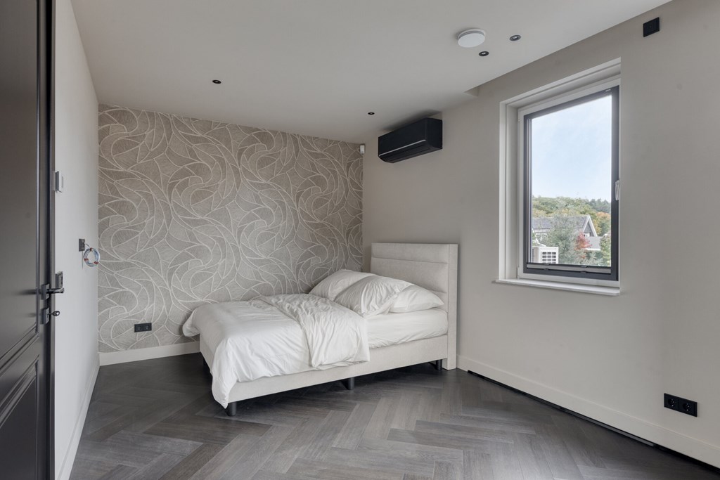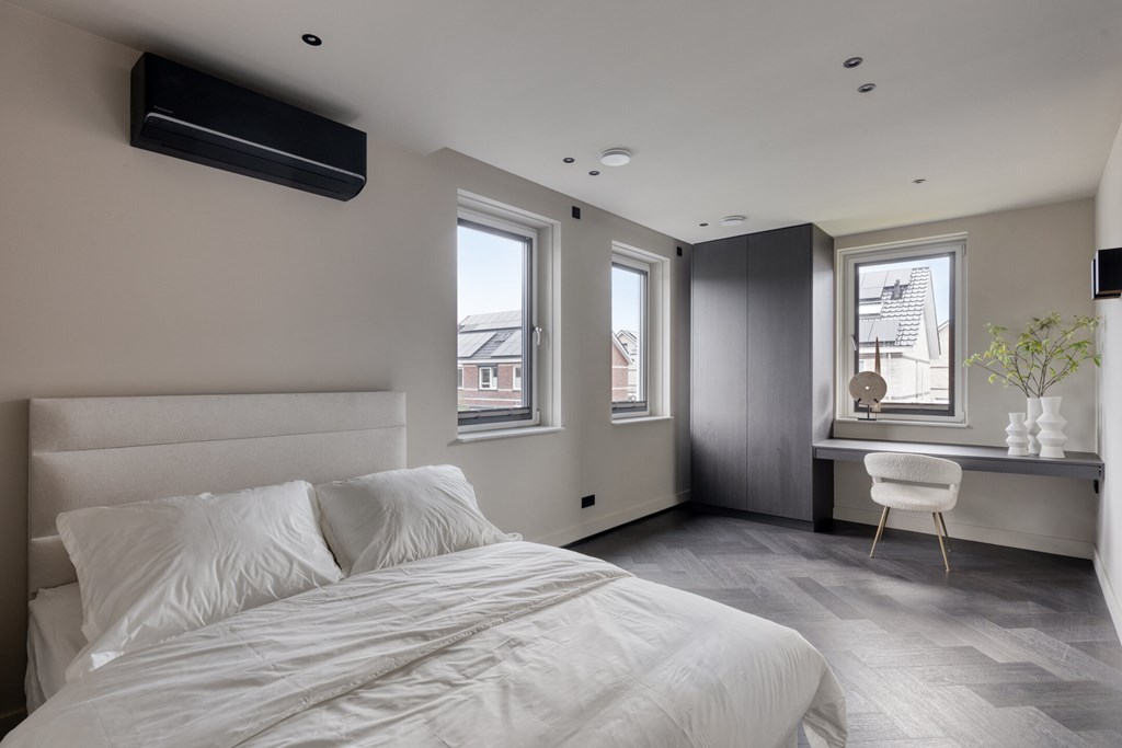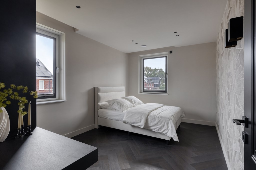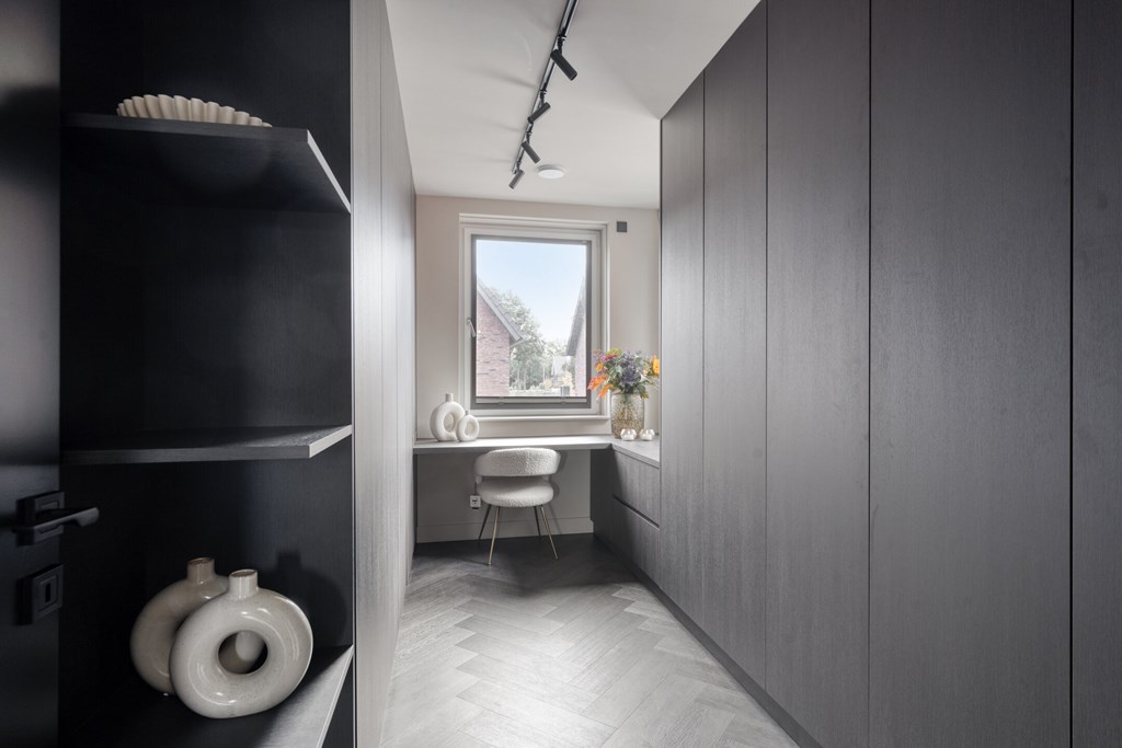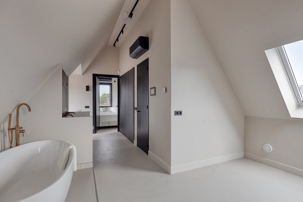 A fixed staircase leads to the second floor, which is designed as the master suite. Here you will find a spacious bedroom and a generous open wellness area with a freestanding bathtub, walk-in shower, toilet and double washbasin. Preparations have been made for the installation of a sauna, allowing you to create a true relaxation space. On the landing, a beautiful built-in wardrobe wall with lighting has been installed.