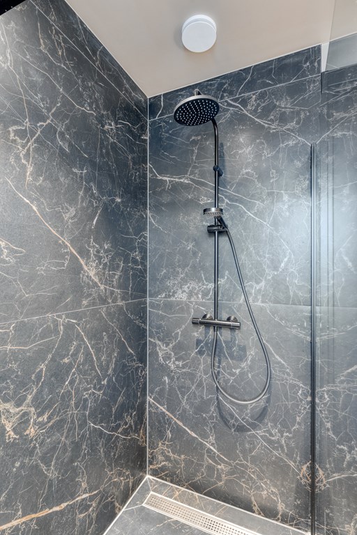The modern bathroom is fully tiled and equipped with a walk-in shower with glass partition, a double washbasin with mirror, and a Sonos speaker. On the landing, there is a separate toilet with wall-mounted toilet. Everything exudes quality and comfort.