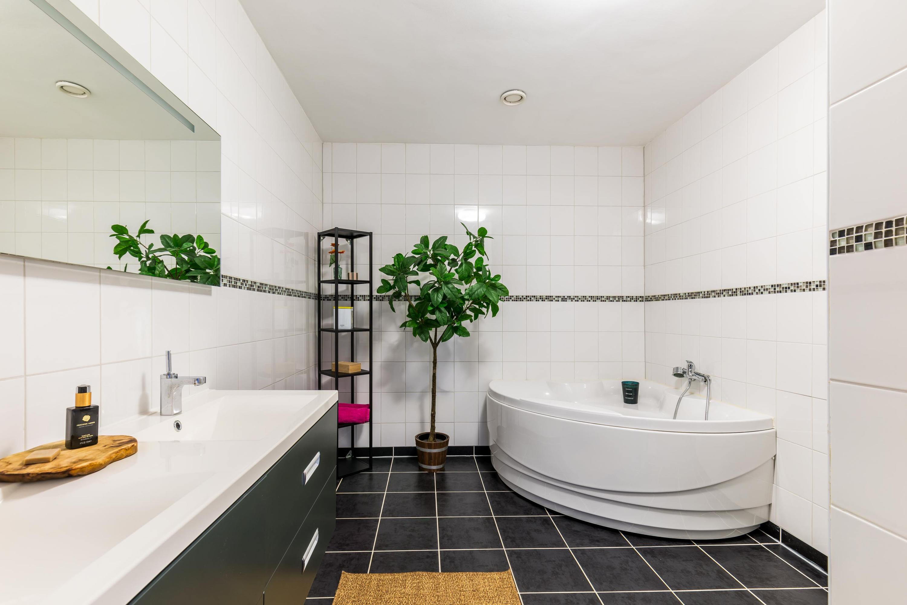 The modern bathroom features a corner bathtub, walk-in shower, and double washbasin. The large master bedroom at the rear includes a built-in sliding wardrobe and French doors to the wide balcony overlooking the garden.