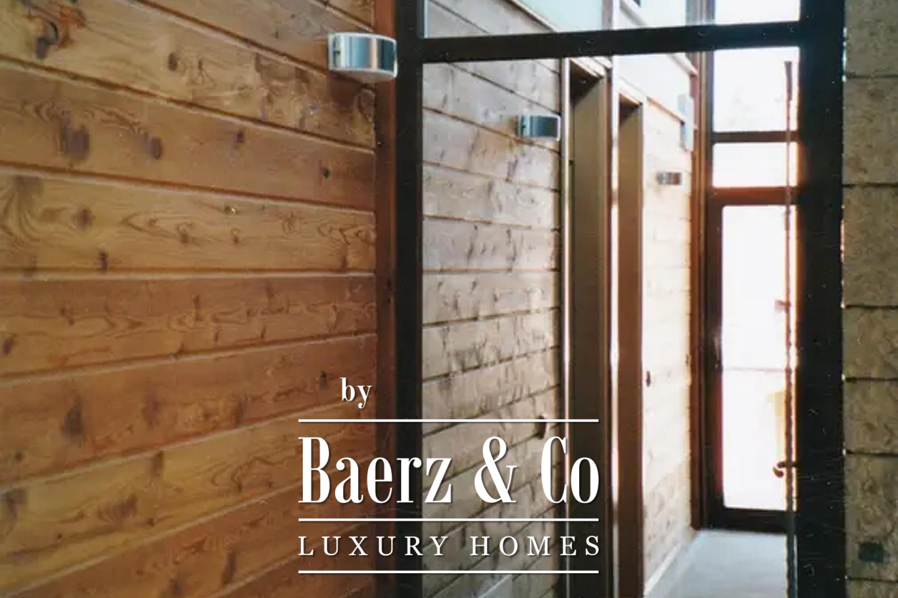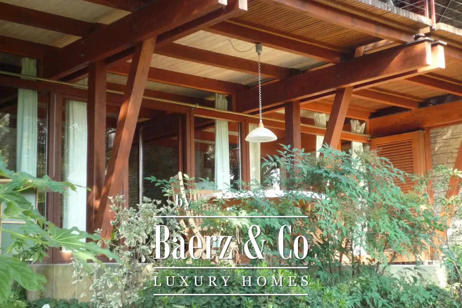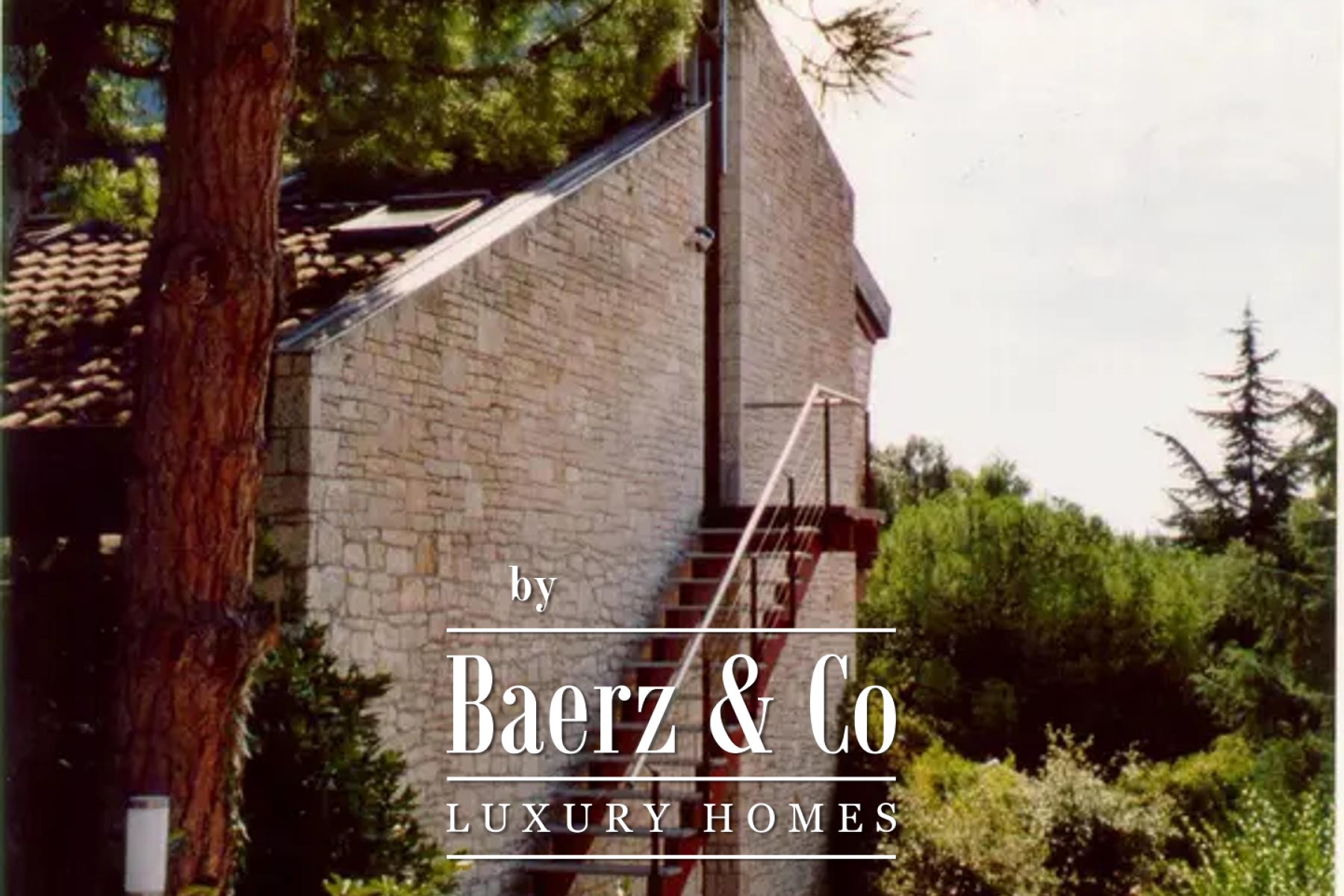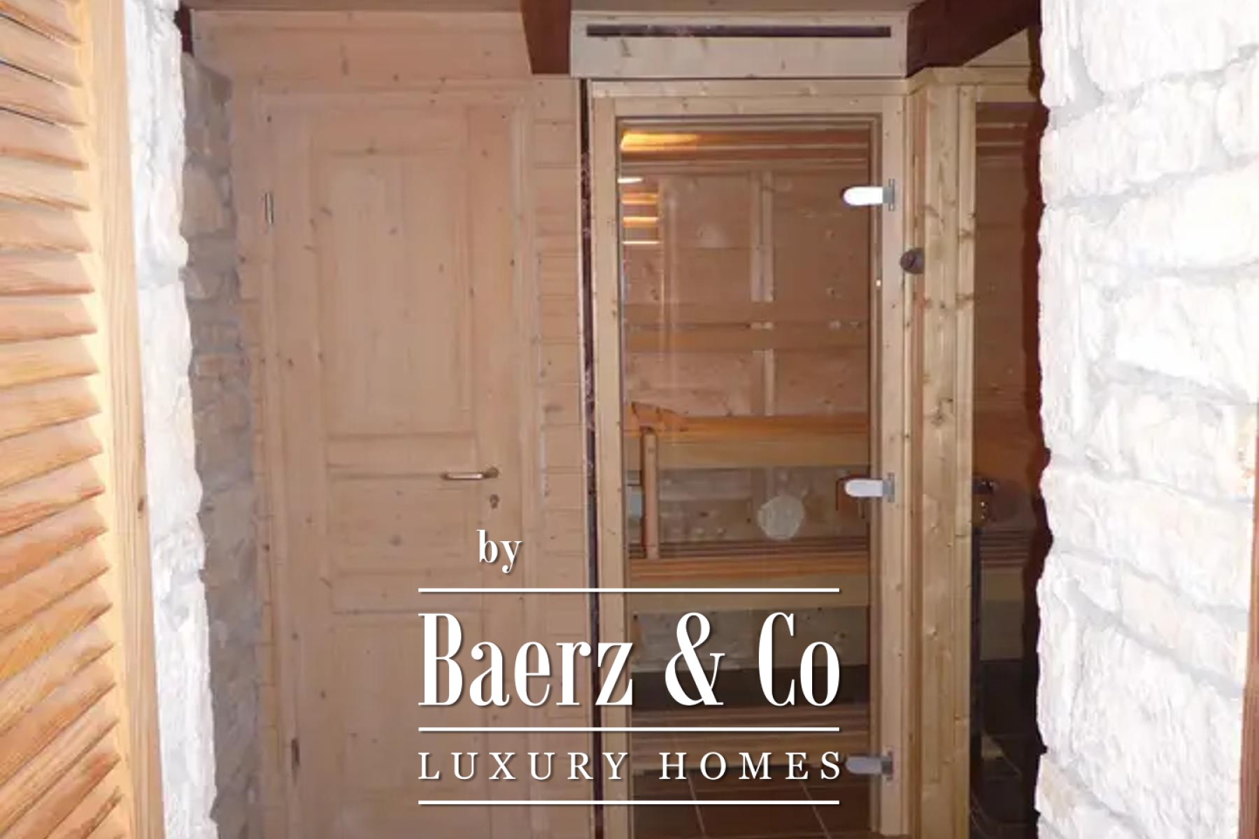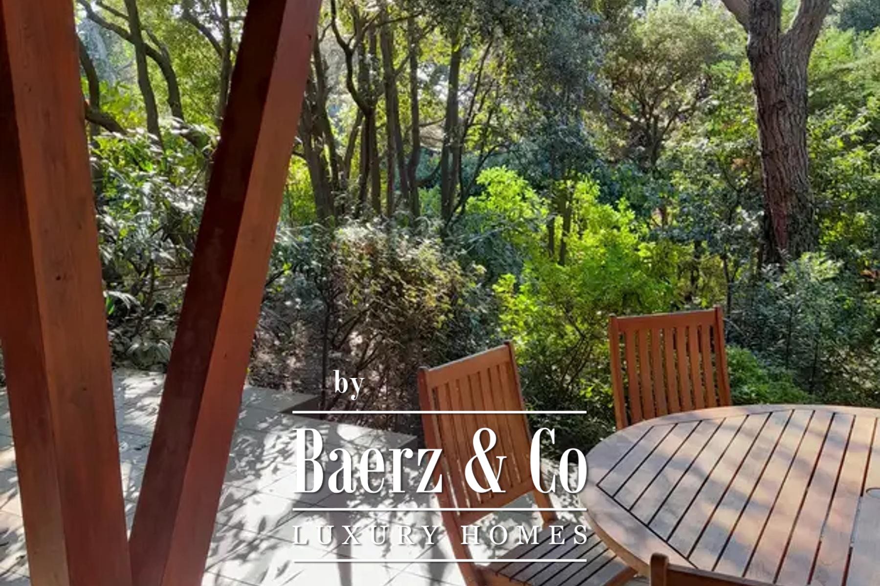 Upstairs, four tranquil bedrooms open onto balconies, with a gallery and shaded terrace connecting to a rooftop enclave for contemplative moments above the garden. The lower level hosts a summer kitchen framed in glass, and a wellness area with sauna, pools, and a landscaped terrace, while a cellar provides storage, central systems, and laundry.