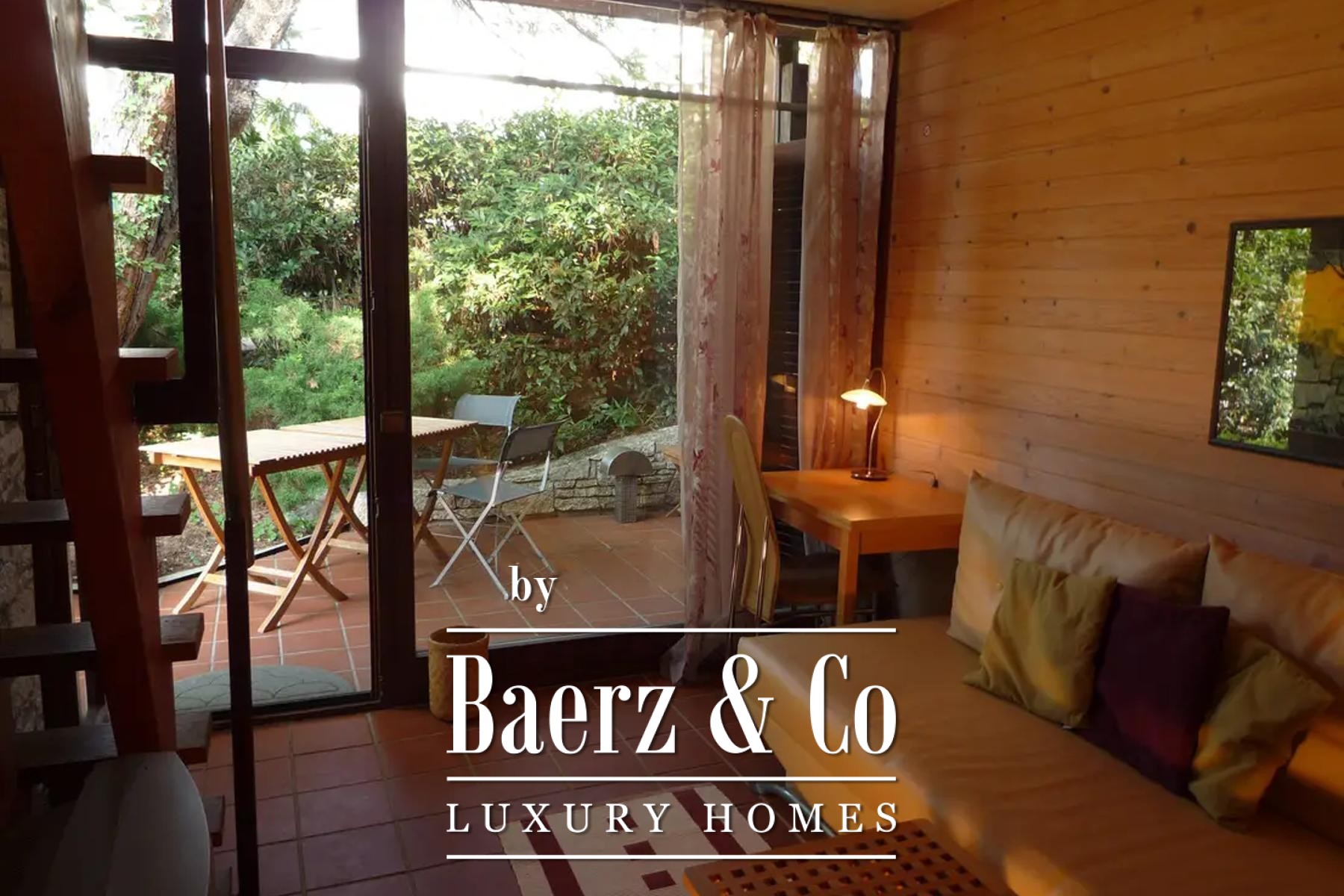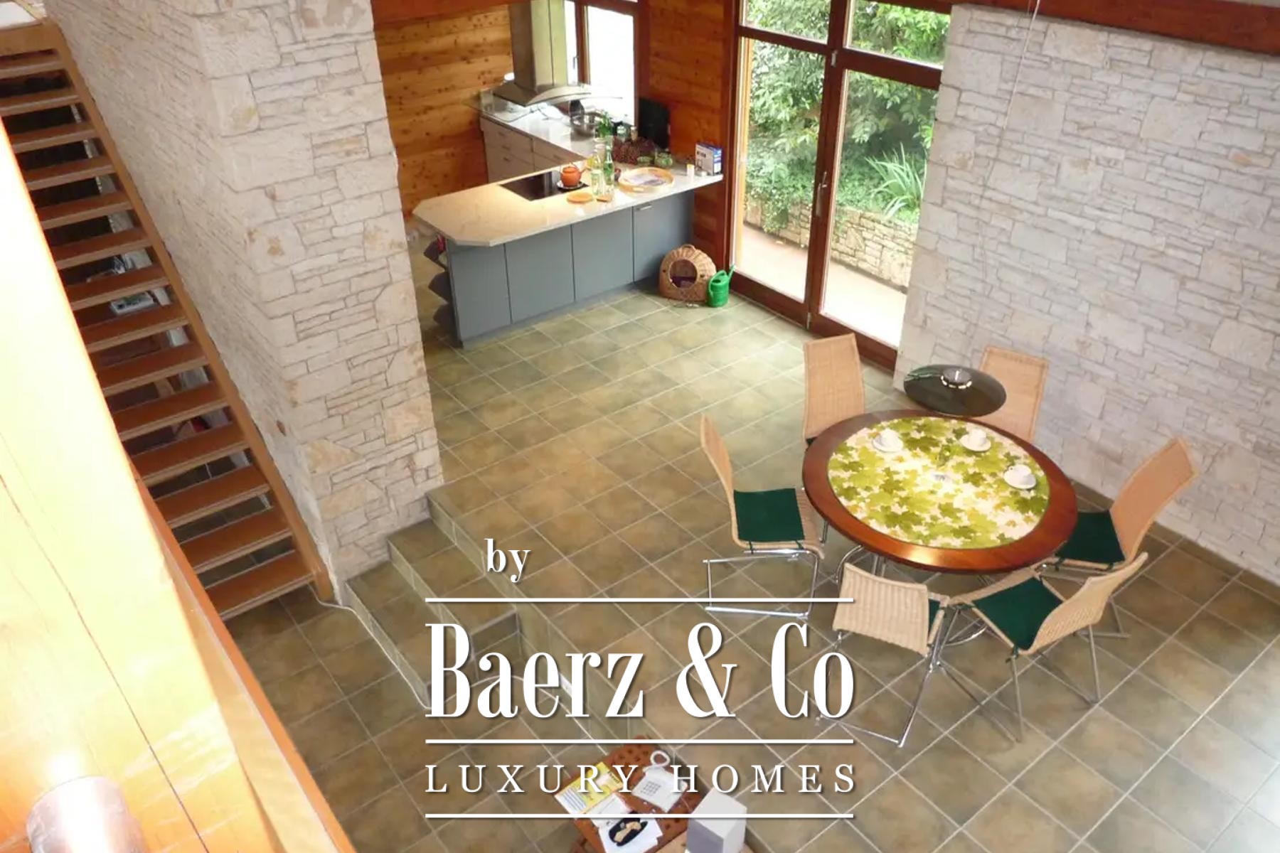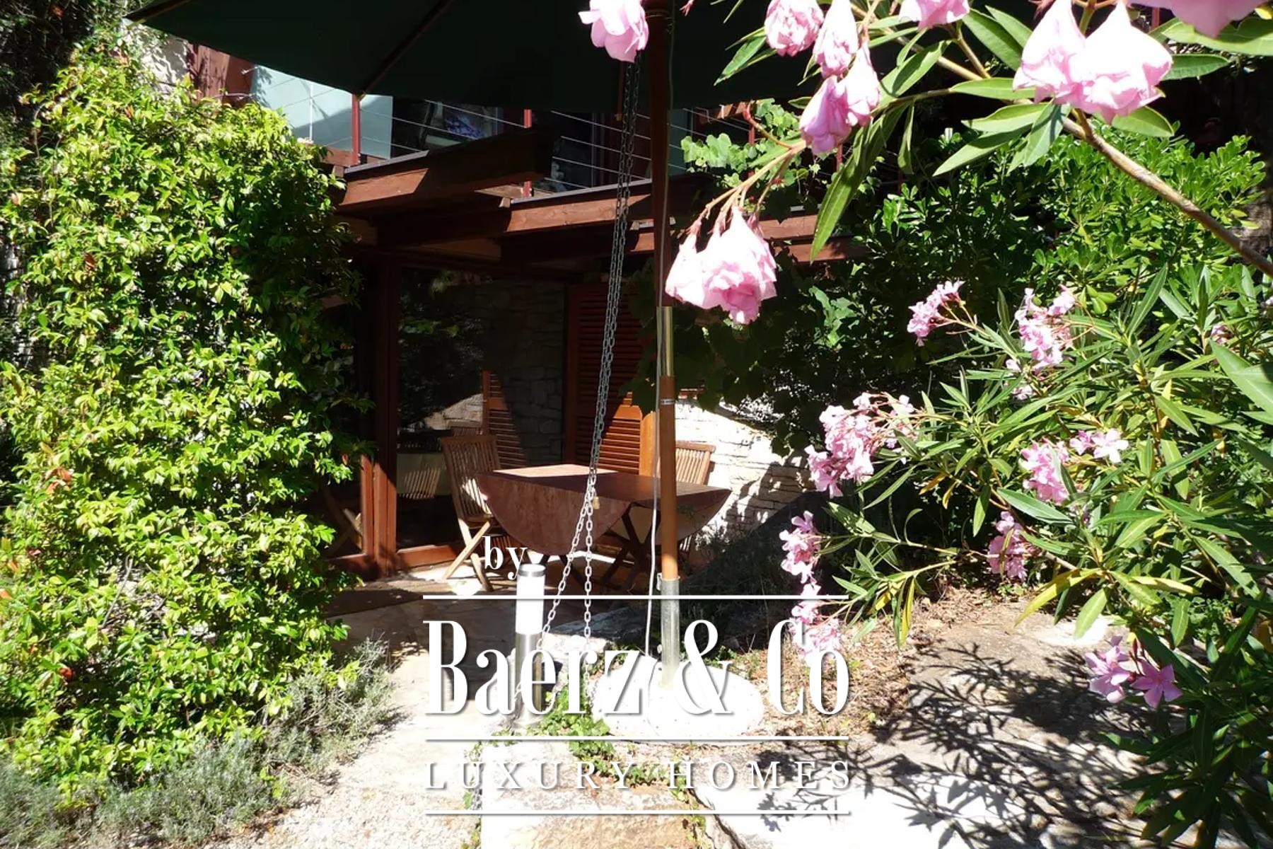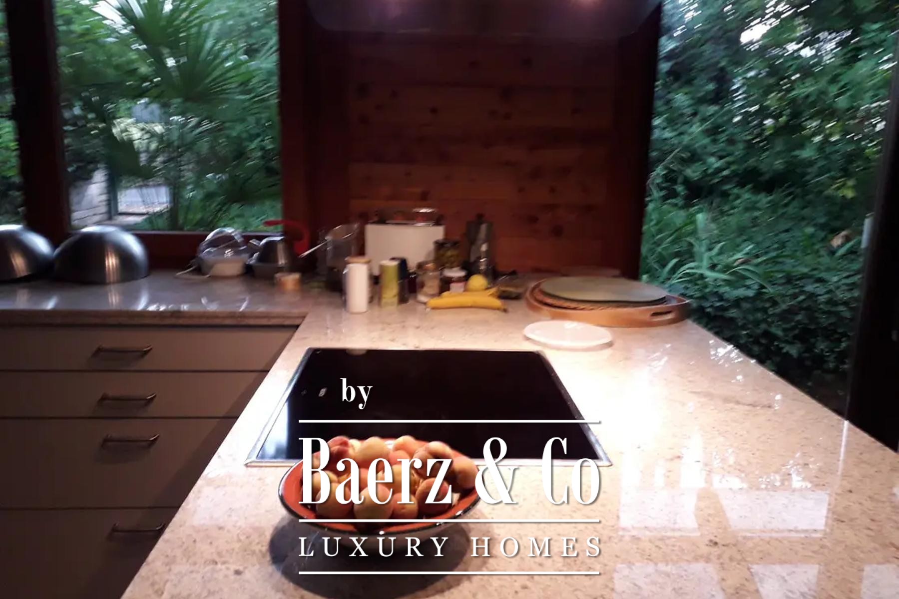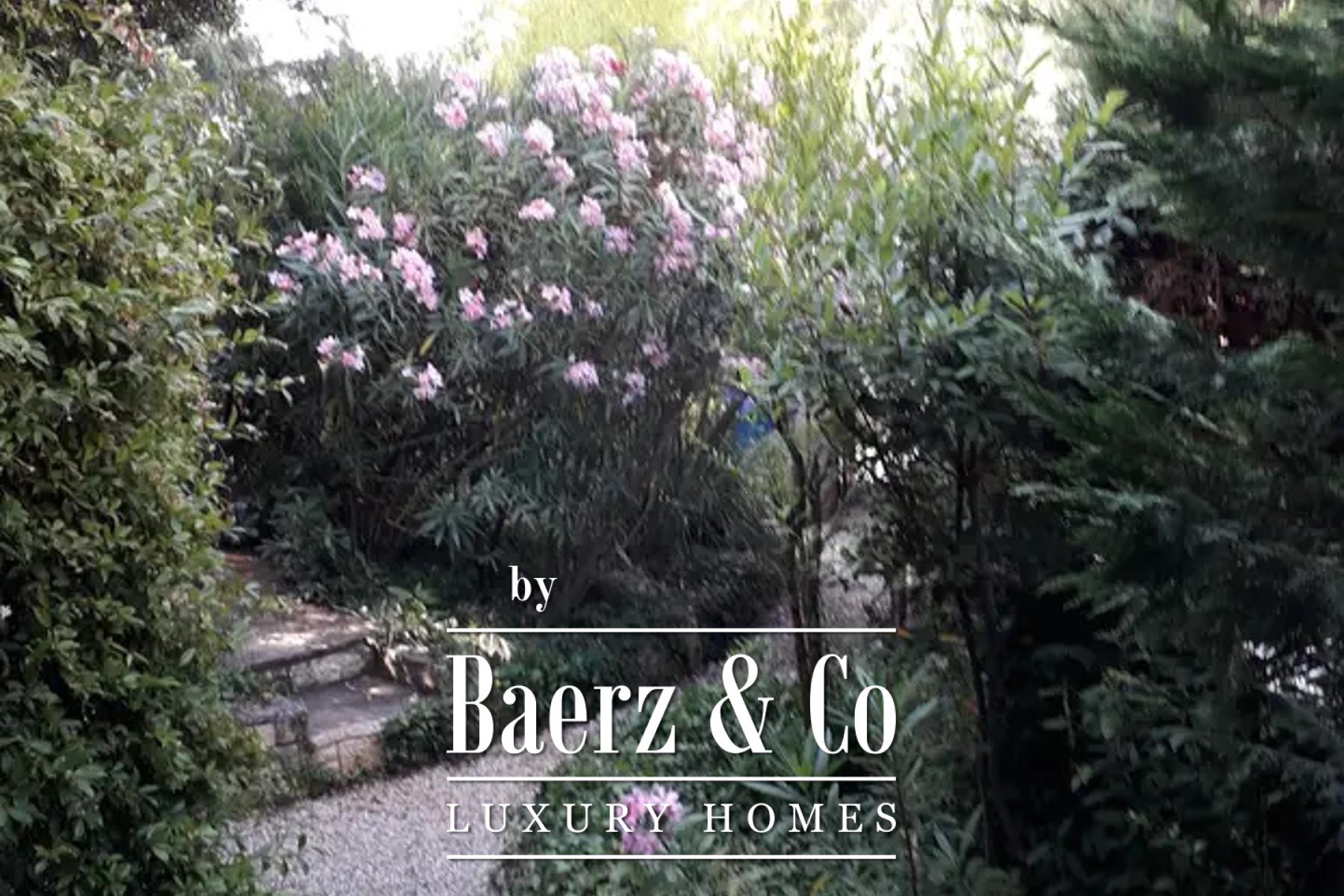 Upstairs, four tranquil bedrooms open onto balconies, with a gallery and shaded terrace connecting to a rooftop enclave for contemplative moments above the garden. The lower level hosts a summer kitchen framed in glass, and a wellness area with sauna, pools, and a landscaped terrace, while a cellar provides storage, central systems, and laundry.
