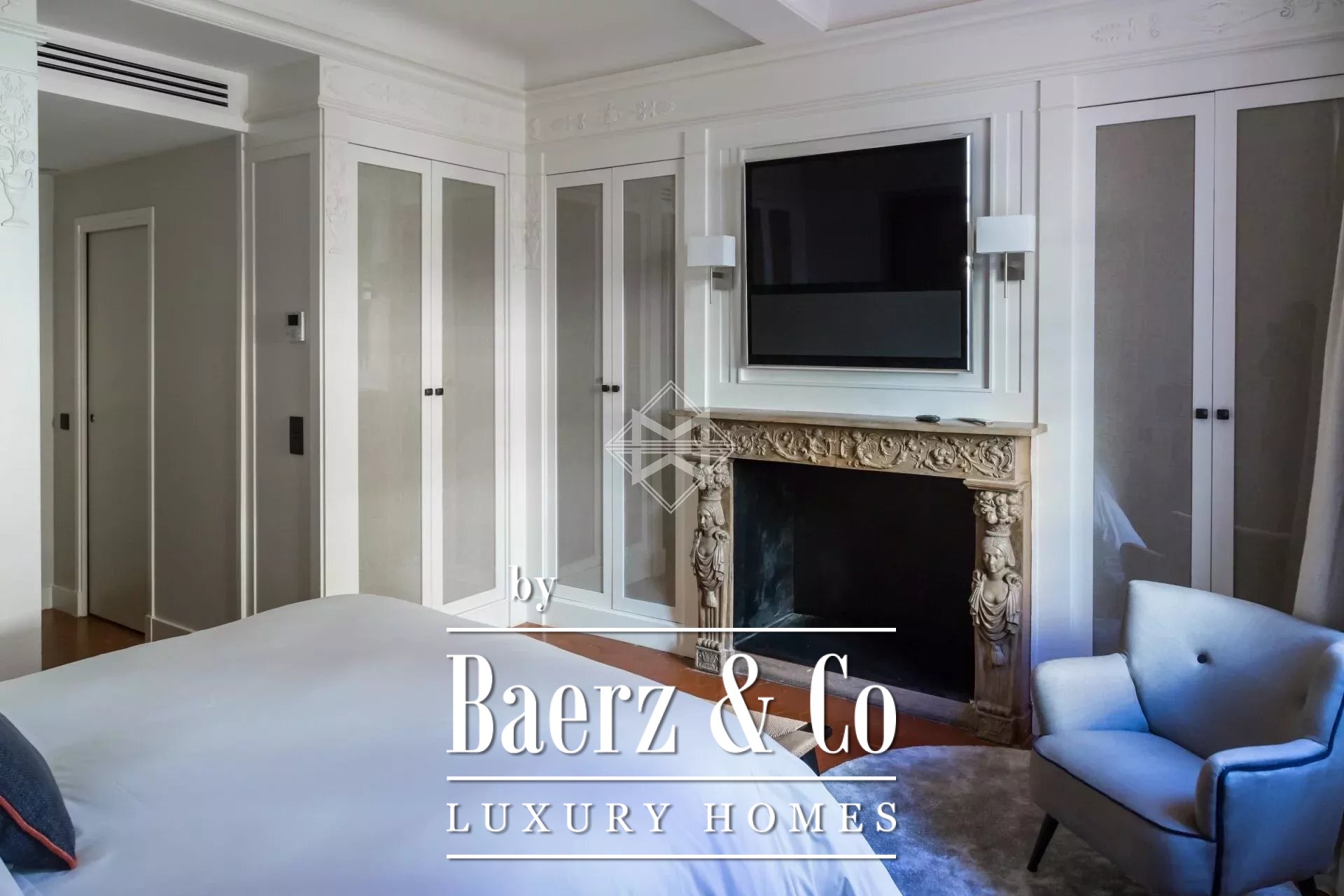 A second kitchen and dining area leads to a living room that opens directly onto a large terrace. From here, one can experience evocative village scenes and the unmistakable bell tower that defines Saint-Tropez’s skyline. High quality materials and finishes contribute to a calm, sophisticated atmosphere throughout, with air-conditioning, double glazing, fireplace, and a curated selection of amenities including Jacuzzi, alarm system, safe, spa, and more.
