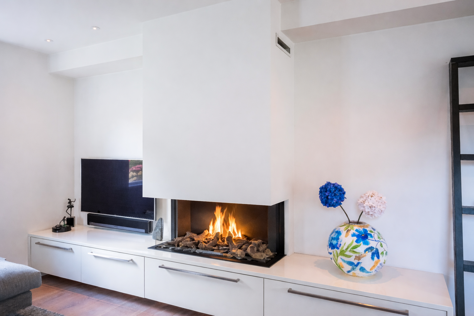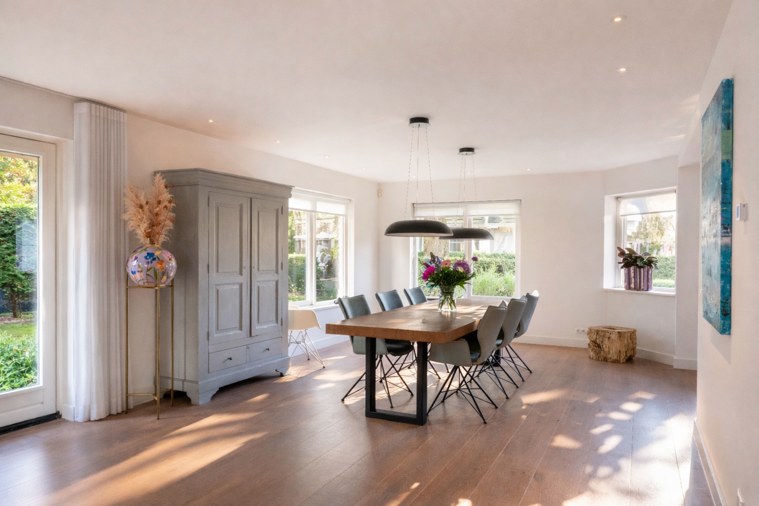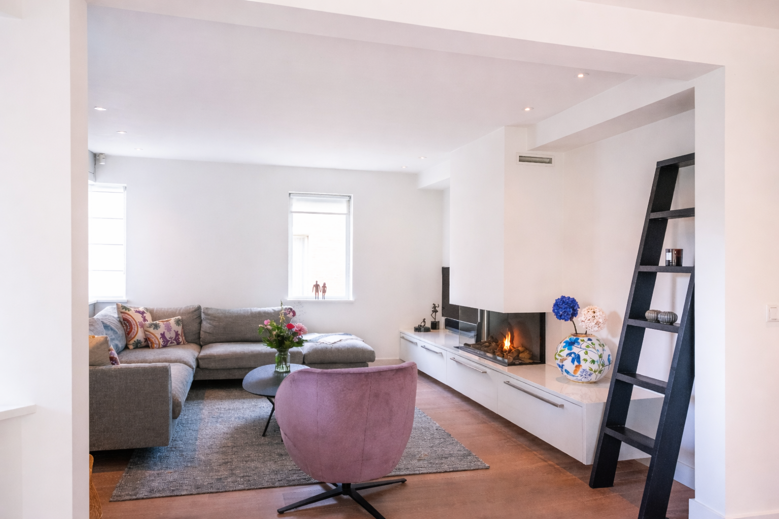 Double doors give access to the spacious L-shaped living room, where you are immediately welcomed by lots of light thanks to the large windows. In the corner is a cosy sitting area with an attractive gas fireplace. The oak laminate flooring in combination with underfloor heating throughout the ground floor creates a warm and comfortable atmosphere.