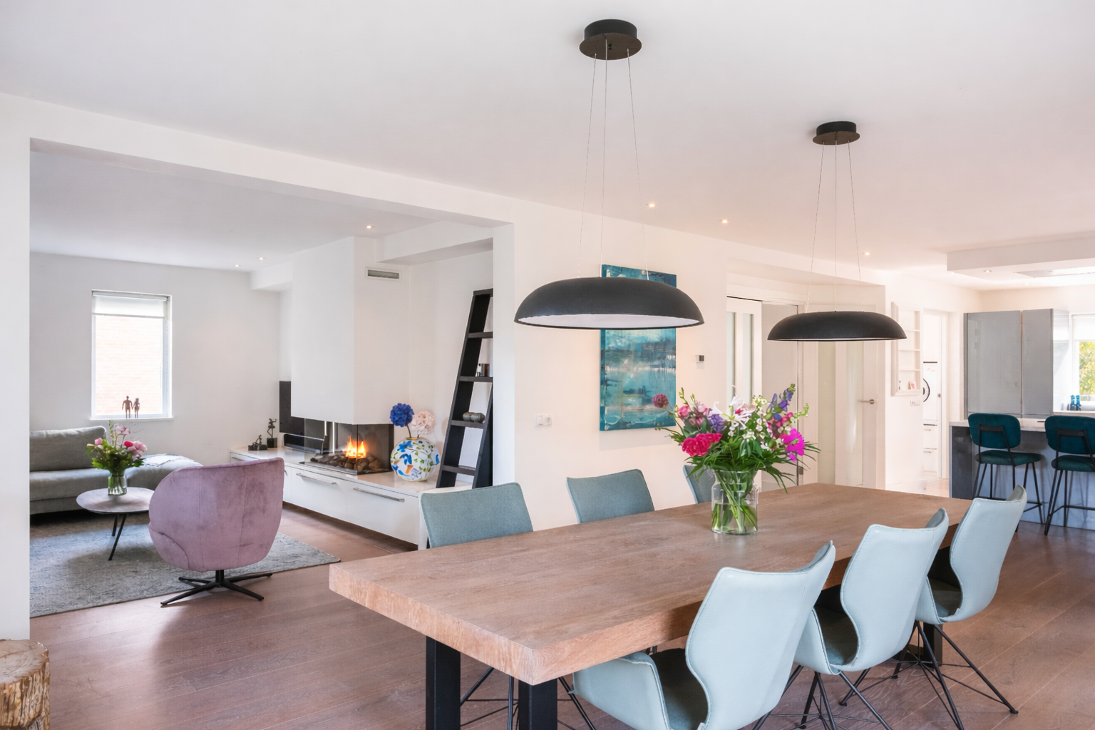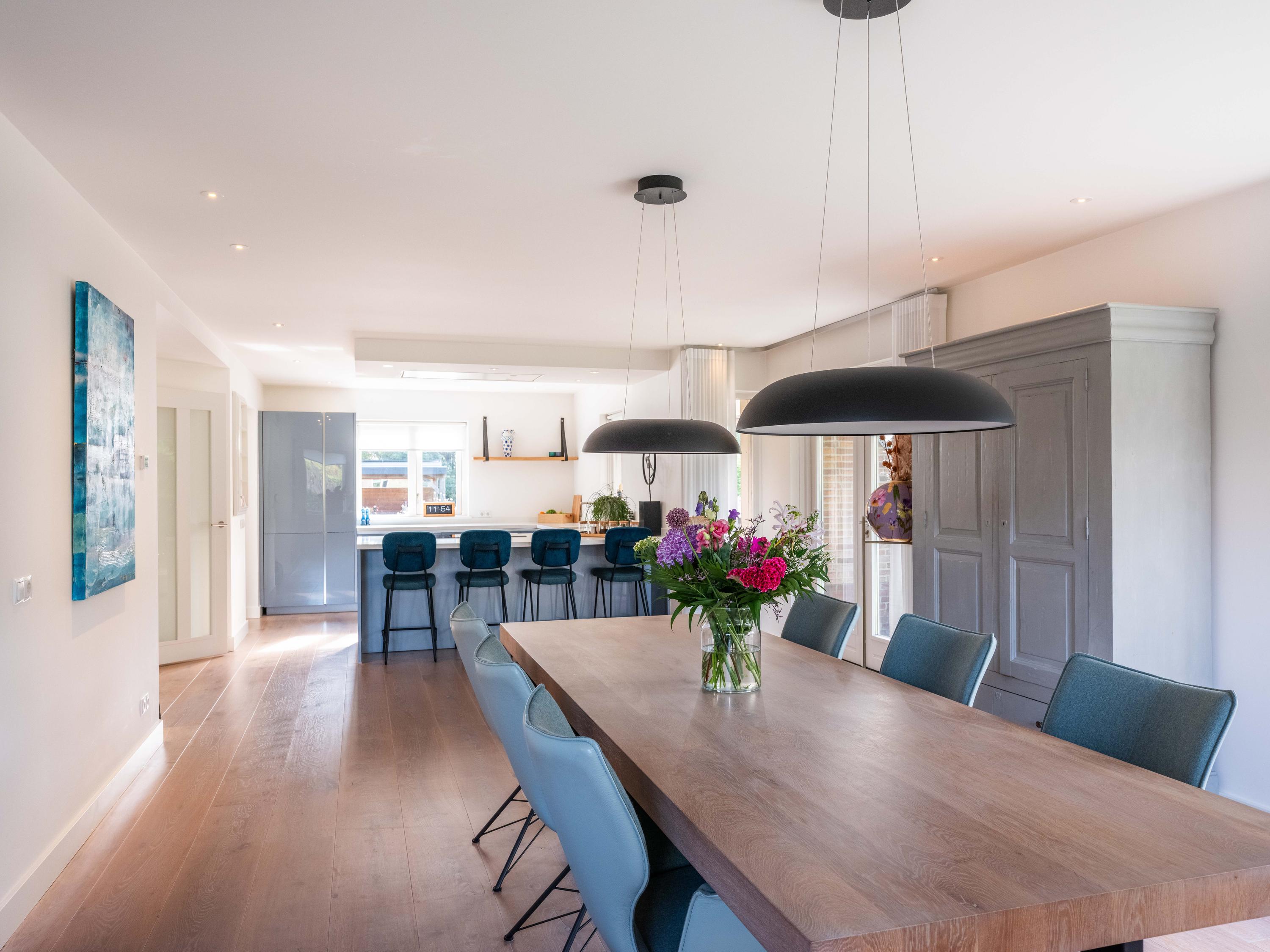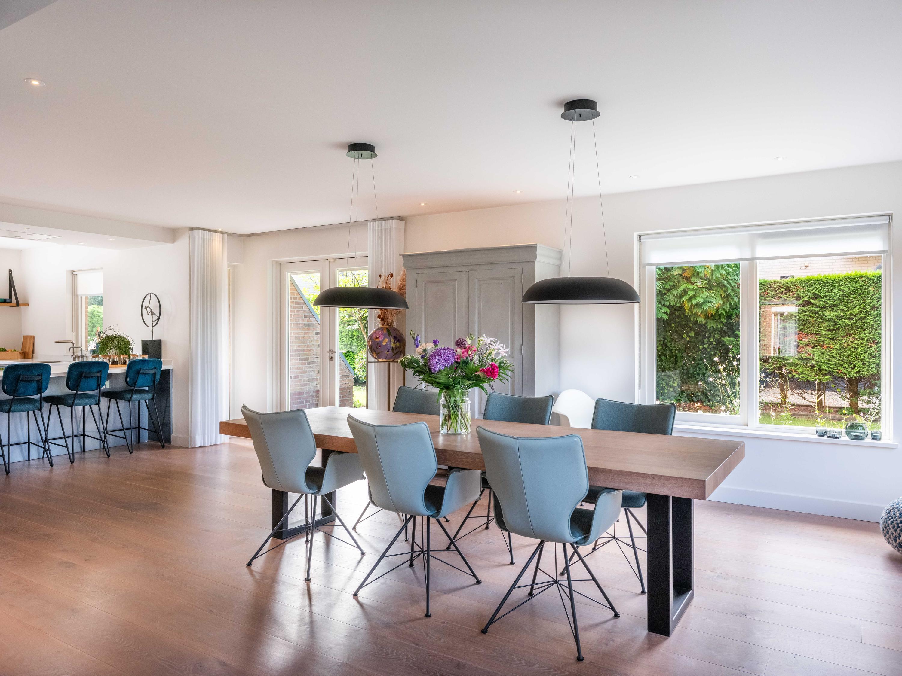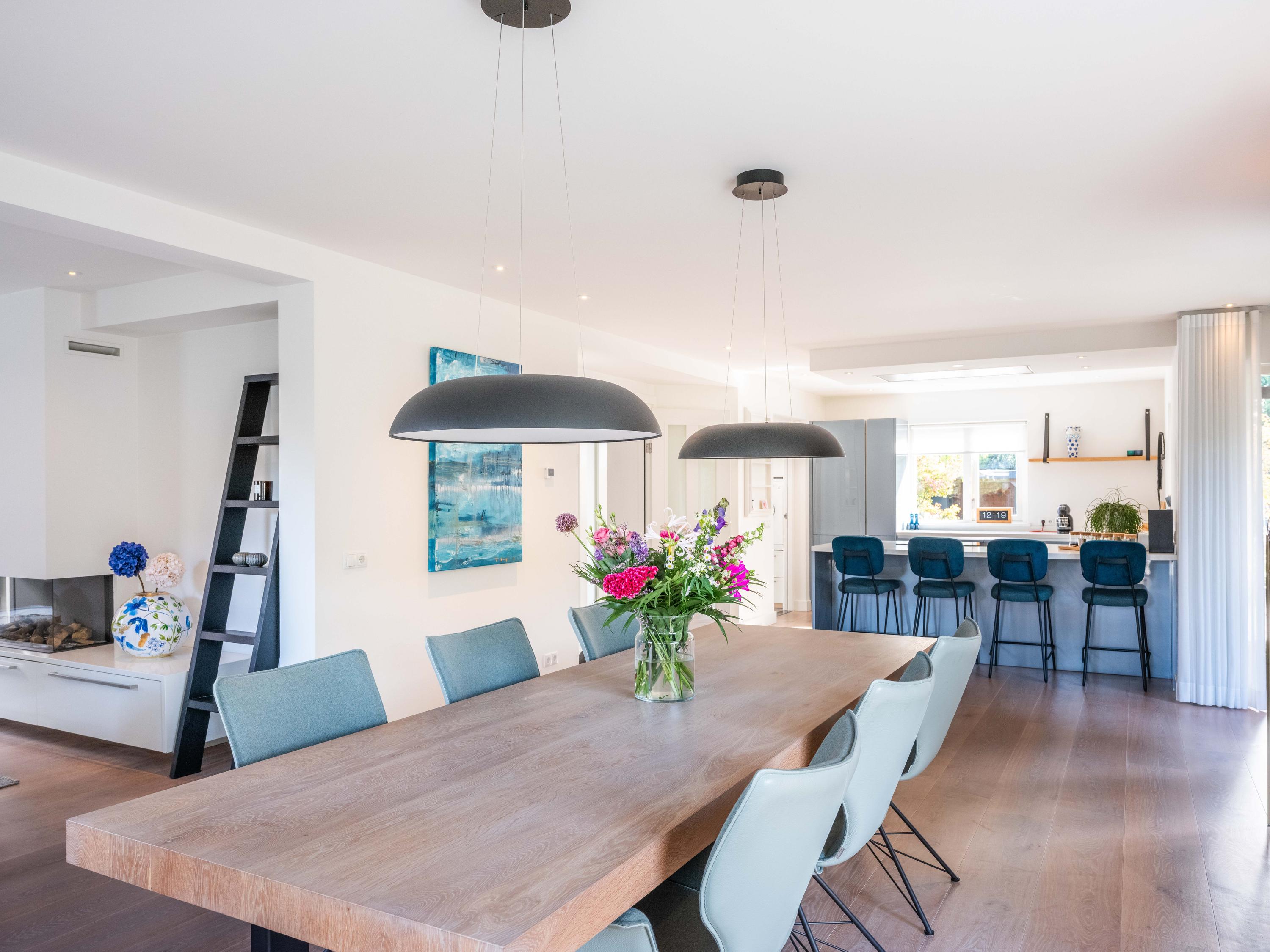 The open kitchen is attractively decorated and equipped with a cosy bar with seating. From the kitchen, you can enjoy a beautiful view of the garden and there is a direct connection to the living room. Thanks to the open layout and abundant light, everything feels spacious, fresh and inviting.