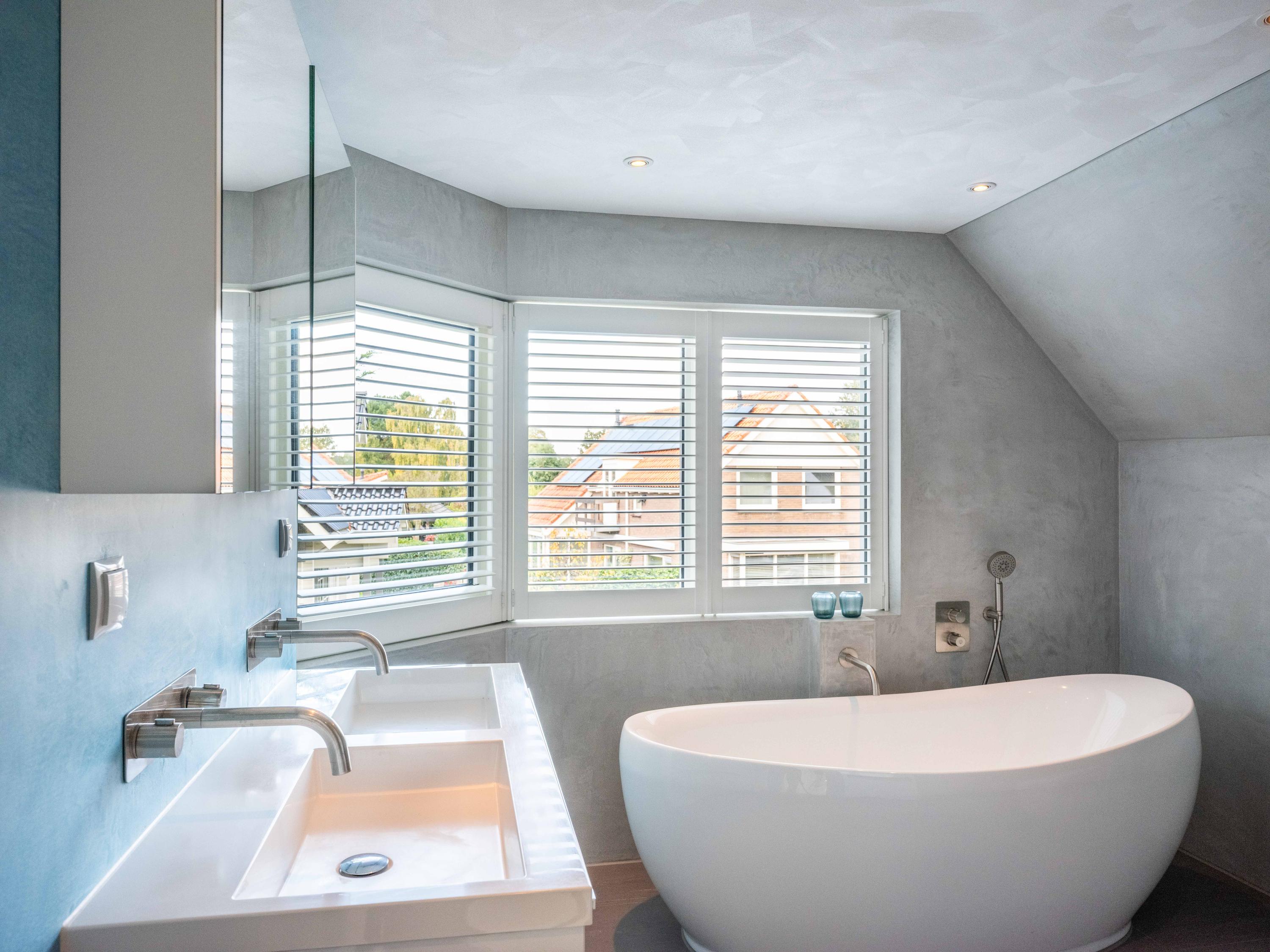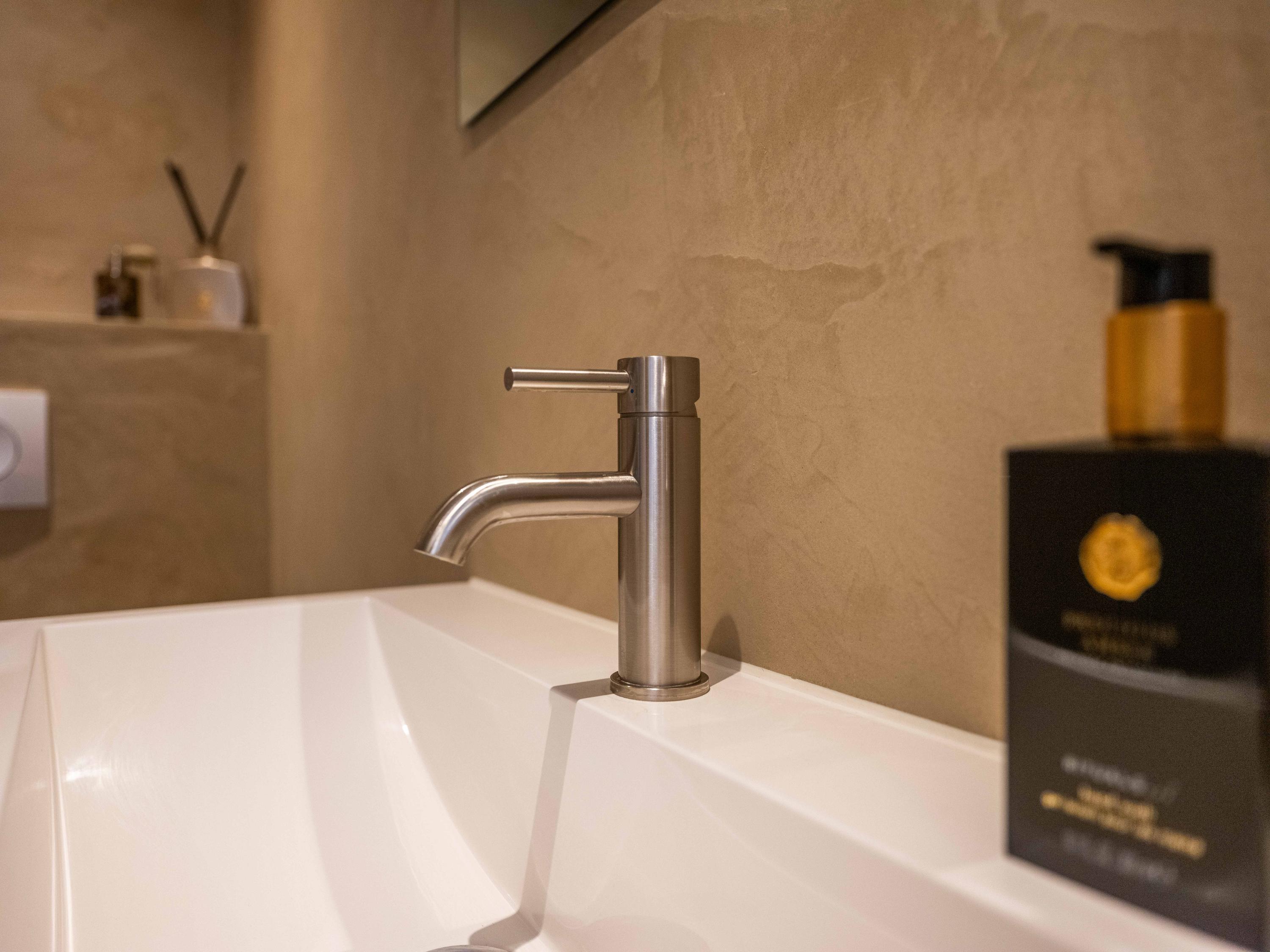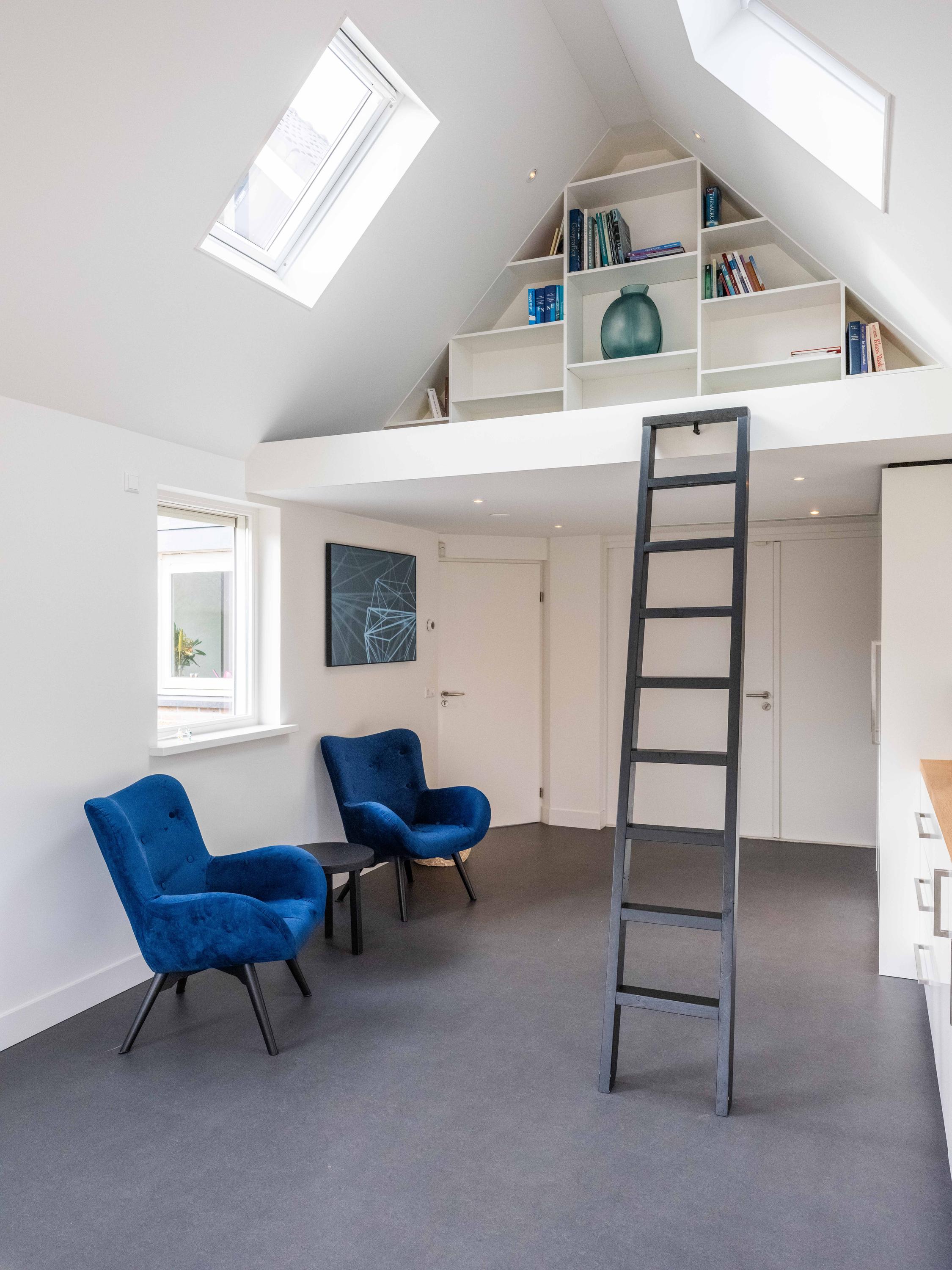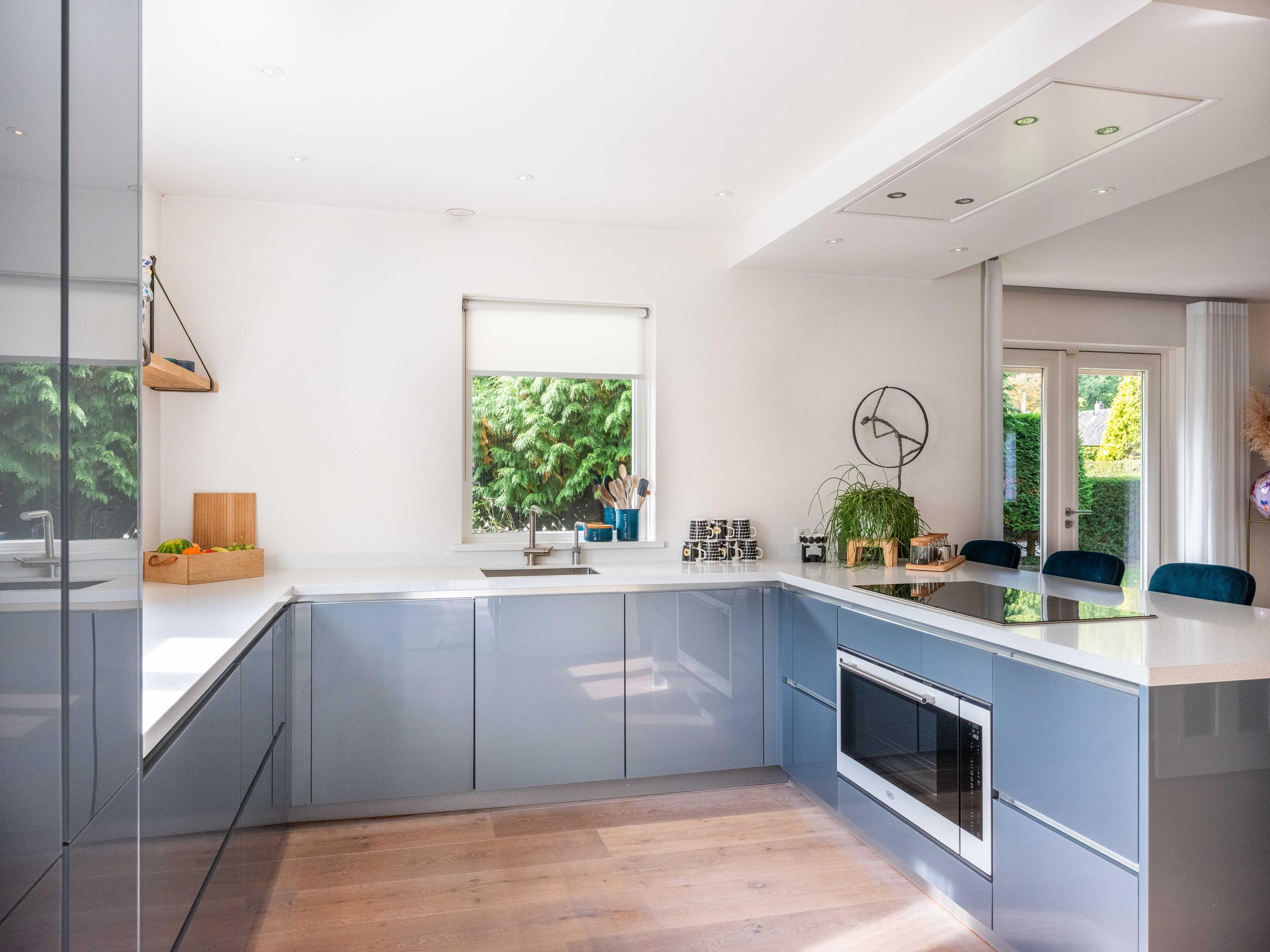The open kitchen is attractively decorated and equipped with a cosy bar with seating. From the kitchen, you can enjoy a beautiful view of the garden and there is a direct connection to the living room. Thanks to the open layout and abundant light, everything feels spacious, fresh and inviting.