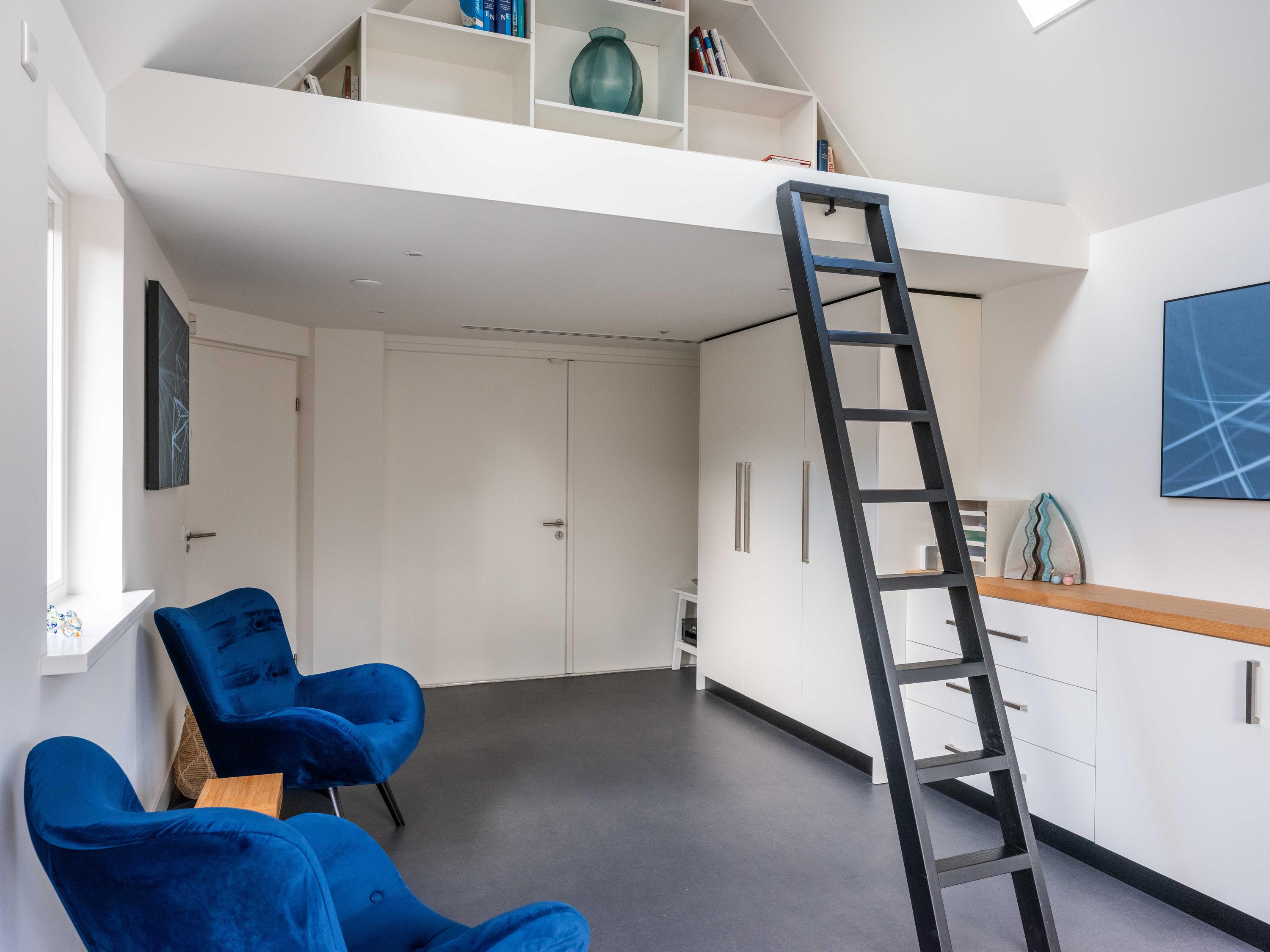 From the utility room, there is access to an additional room with air conditioning, built-in cupboards and a loft. This room is currently used as an office but could also serve as a bedroom or hobby room. The loft offers additional storage space.