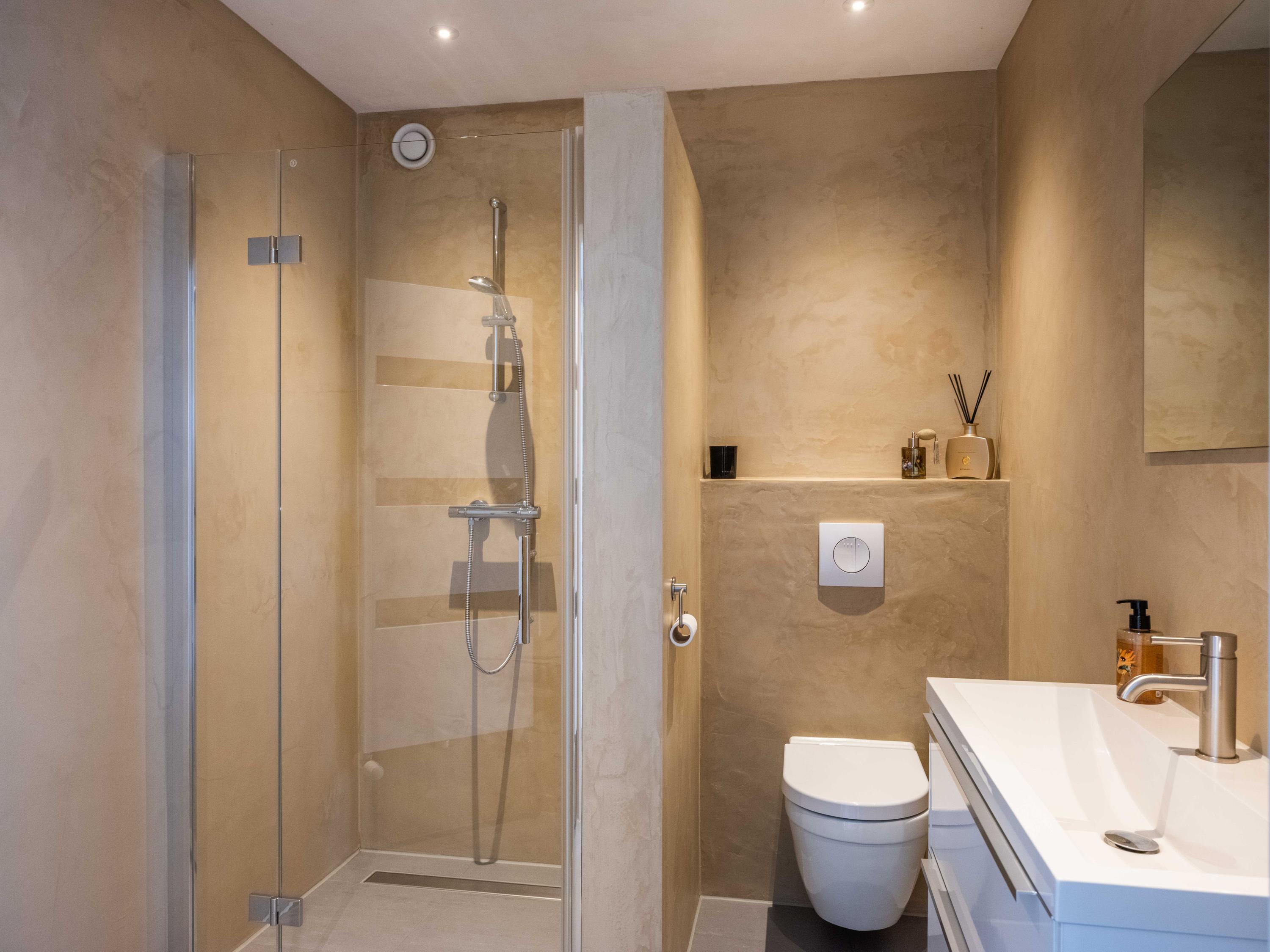 Upon entering, you will immediately notice the spacious hall, with meter cupboard, bathroom and stairs to the upper floor. There is a practical storage space under the stairs. The bathroom is spacious and equipped with a shower, toilet, washbasin and radiator.