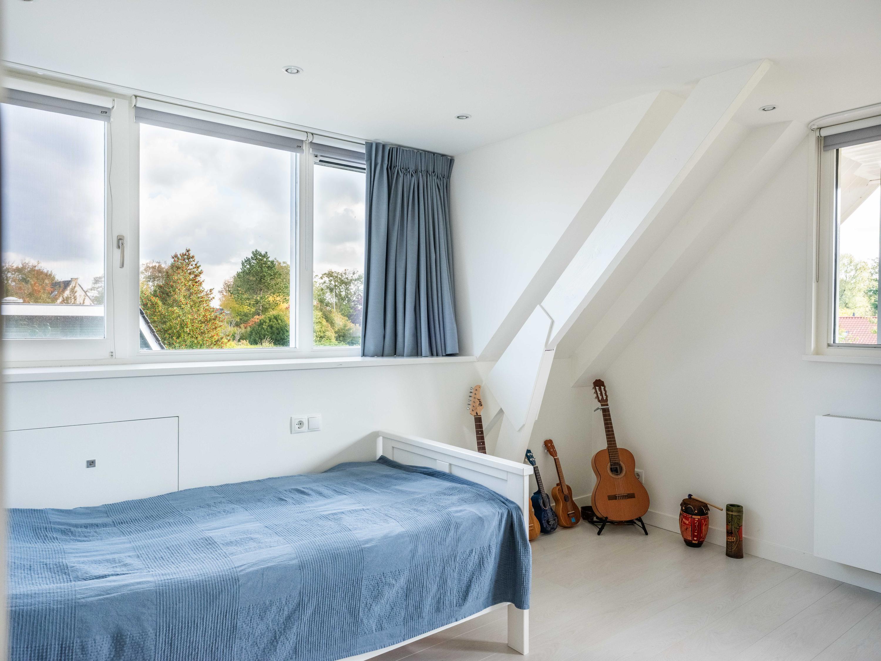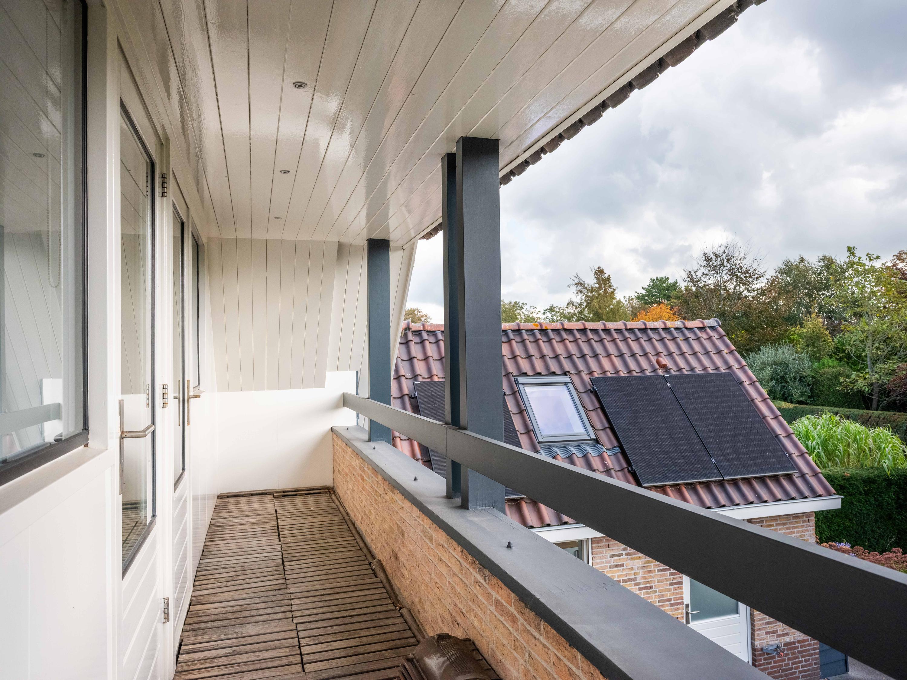 On the first floor, there are three bedrooms and a spacious bathroom with double sink, toilet, bathtub and a generous double walk-in shower. Underfloor heating is also present here, as well as a radiator. The master bedroom is spacious and has plenty of built-in cupboard space. There are two additional bright bedrooms, both with built-in cupboards and access to a private balcony. There is a handy storage cupboard under the stairs to the attic.