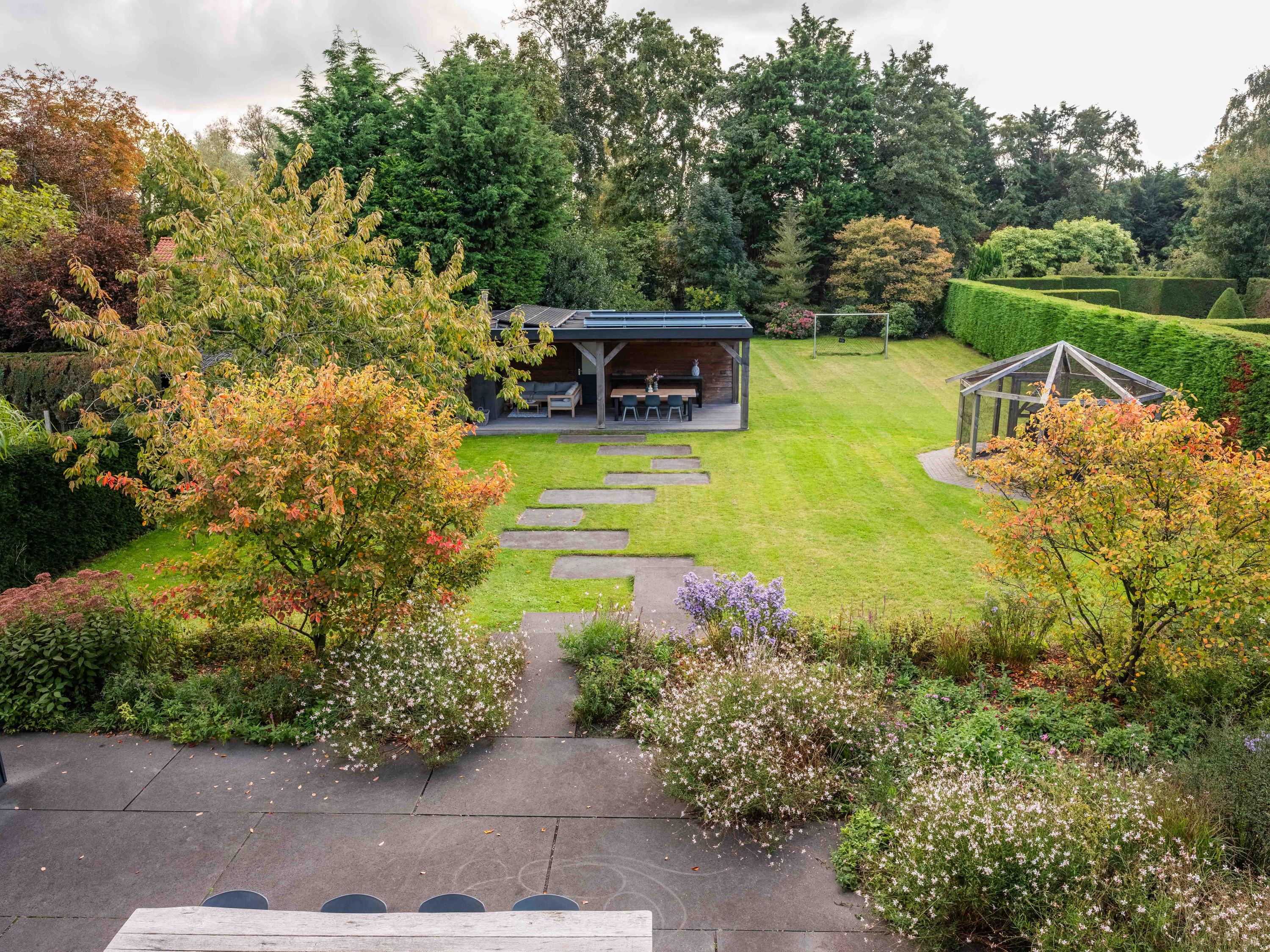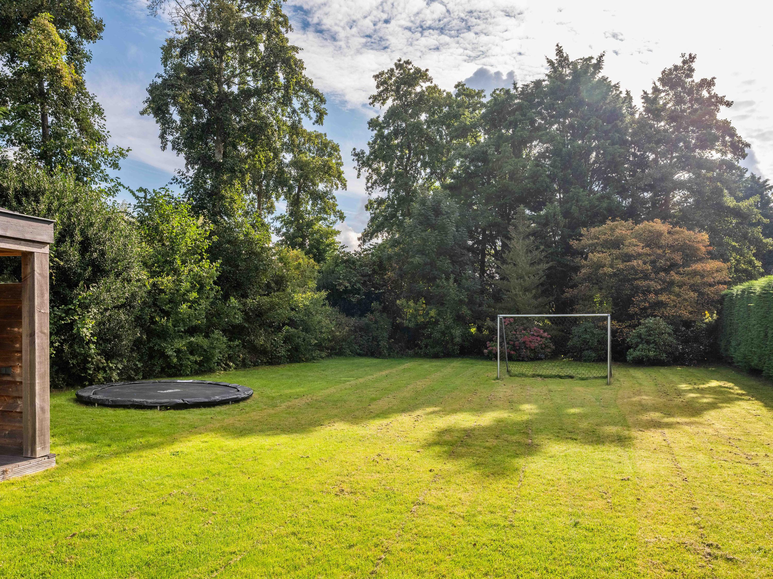 The back garden is very spacious and well landscaped. There is a lovely veranda with a wood-burning stove, seating area, storage space, electricity, lighting and (cold) water. There is also a spacious chicken coop in the garden, which will remain.