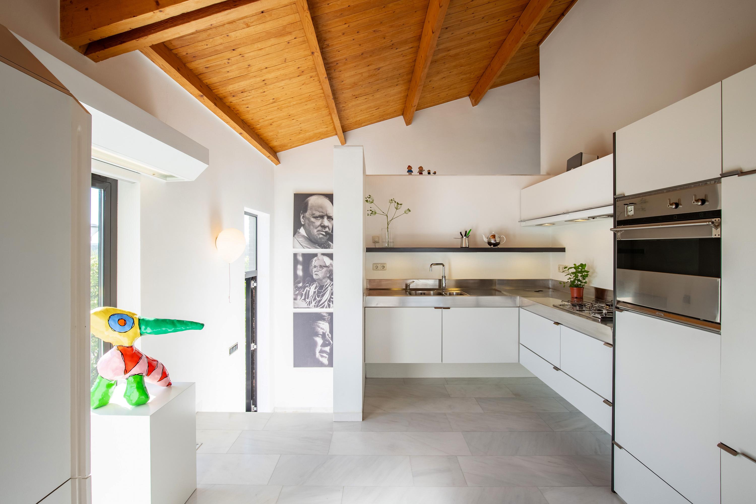 One floor up, accessible via the spiral staircase from the entrance hall, lies the entire living area. An open hallway with a few steps on the right leads to the semi-open kitchen, and on the left to the living room. Generous windows on all facades allow plenty of natural light to flood in. The combination of the sloping wooden ceiling and the roofline, paired with “maple” parquet flooring, enhances the living experience and creates a harmonious atmosphere. The kitchen is arranged in a corner layout and equipped with various built-in appliances. A staircase from the living room leads to the cozy sitting room one floor up, which features a loft. The living room features a cozy gas fireplace.