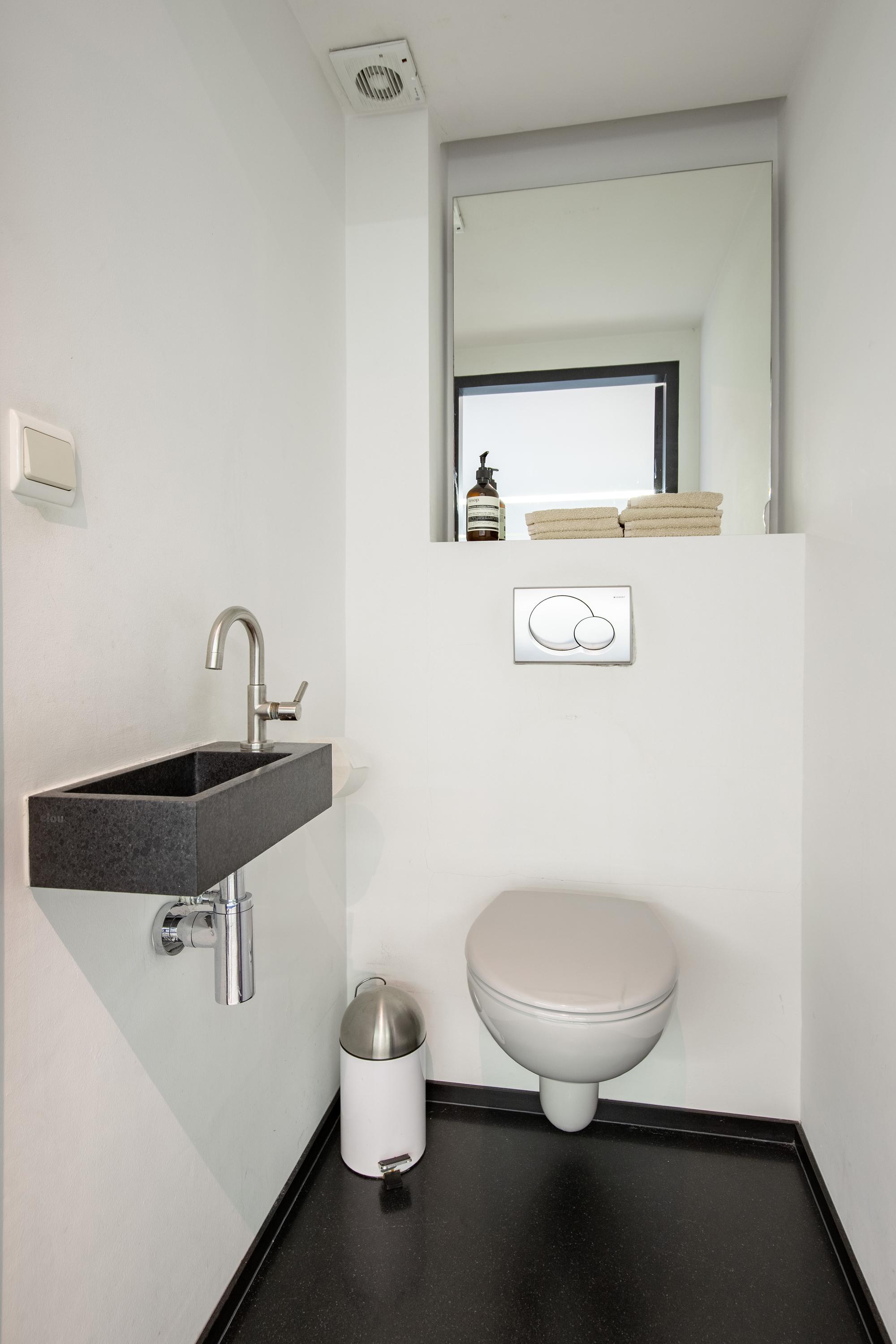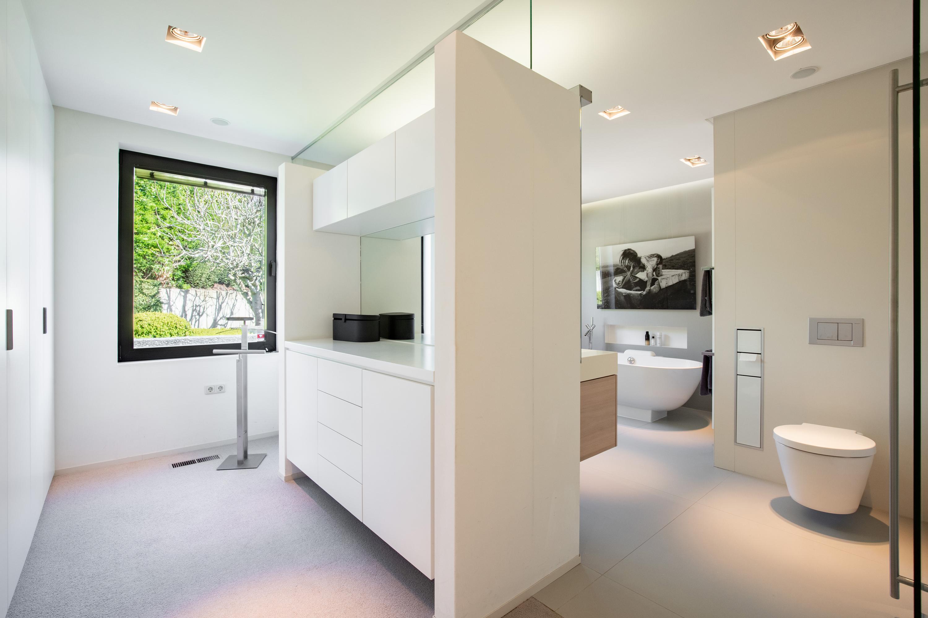 The sleeping areas are connected to the living room and kitchen via a hallway lined with windows on both sides. A beautifully tiled half-bathroom. Three bedrooms, some of which feature built-in closets. A spiral staircase leads from the master bedroom down to the pool at ground level. The tasteful and luxurious bathroom is finished with high-quality materials and accessible from the hallway. First, there is a spacious walk-in closet with built-in cabinetry, followed by access to the bathroom. This has been recently fitted with a wall-hung toilet, a walk-in shower with a tempered glass screen, a freestanding bathtub, and a bathroom vanity featuring a full-width sink with a mirrored wall. The walls and floor feature a distinctive finish with large, ultra-thin ceramic tiles laid seamlessly. Finally, ceiling lighting with elegant recessed spotlights has been installed. The bathroom features underfloor heating. From each of the living areas, there is a direct connection to the exterior of the villa and a magnificent view of the rolling hills and the architecturally landscaped garden. Surrounding the villa are exquisitely landscaped terraces where one can enjoy the sun or shade. A water feature in an elongated concrete element with a wooden deck tastefully completes the ensemble. The beautiful fig trees are a true eye-catcher in the garden. The garden is also accessible from the front and side.