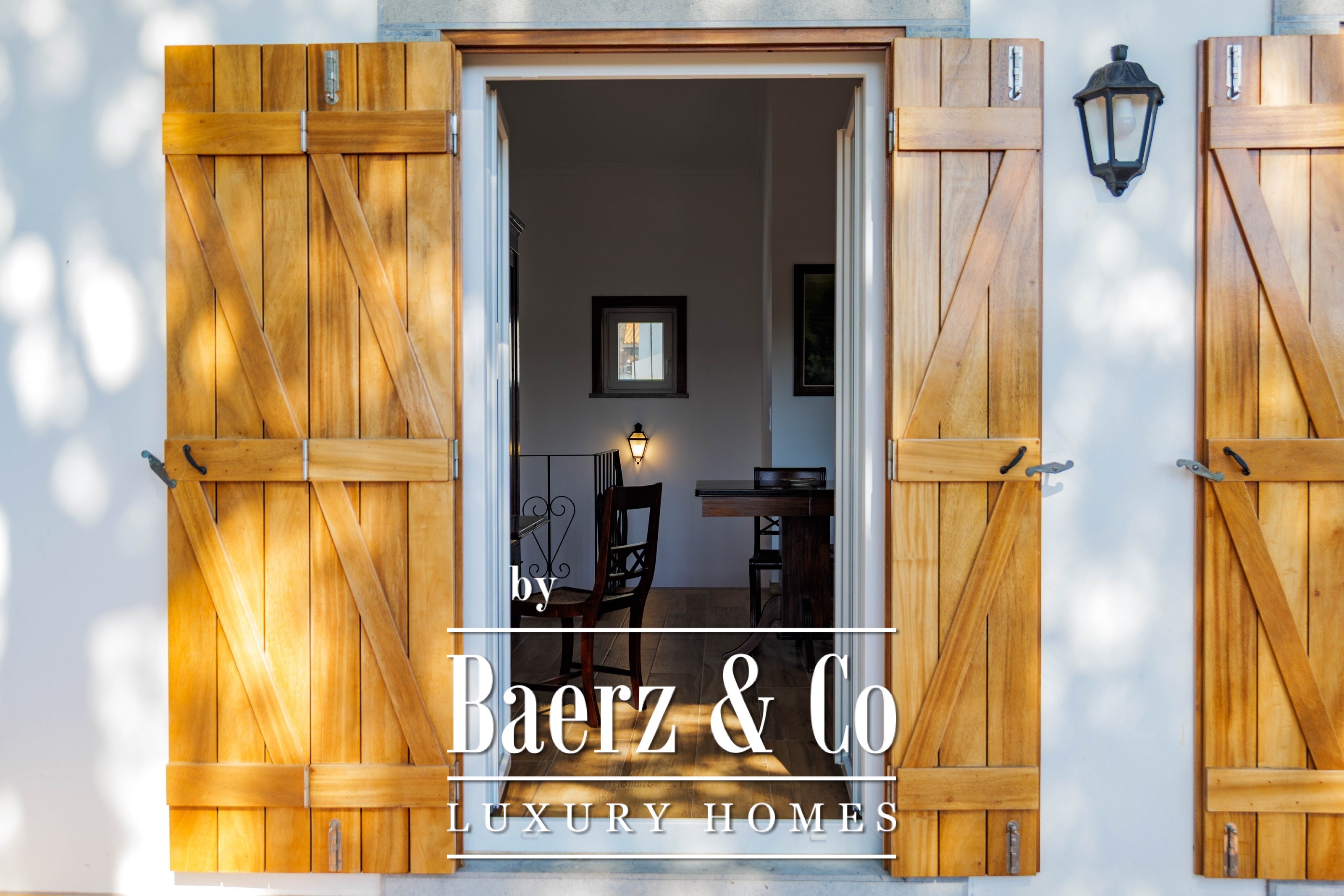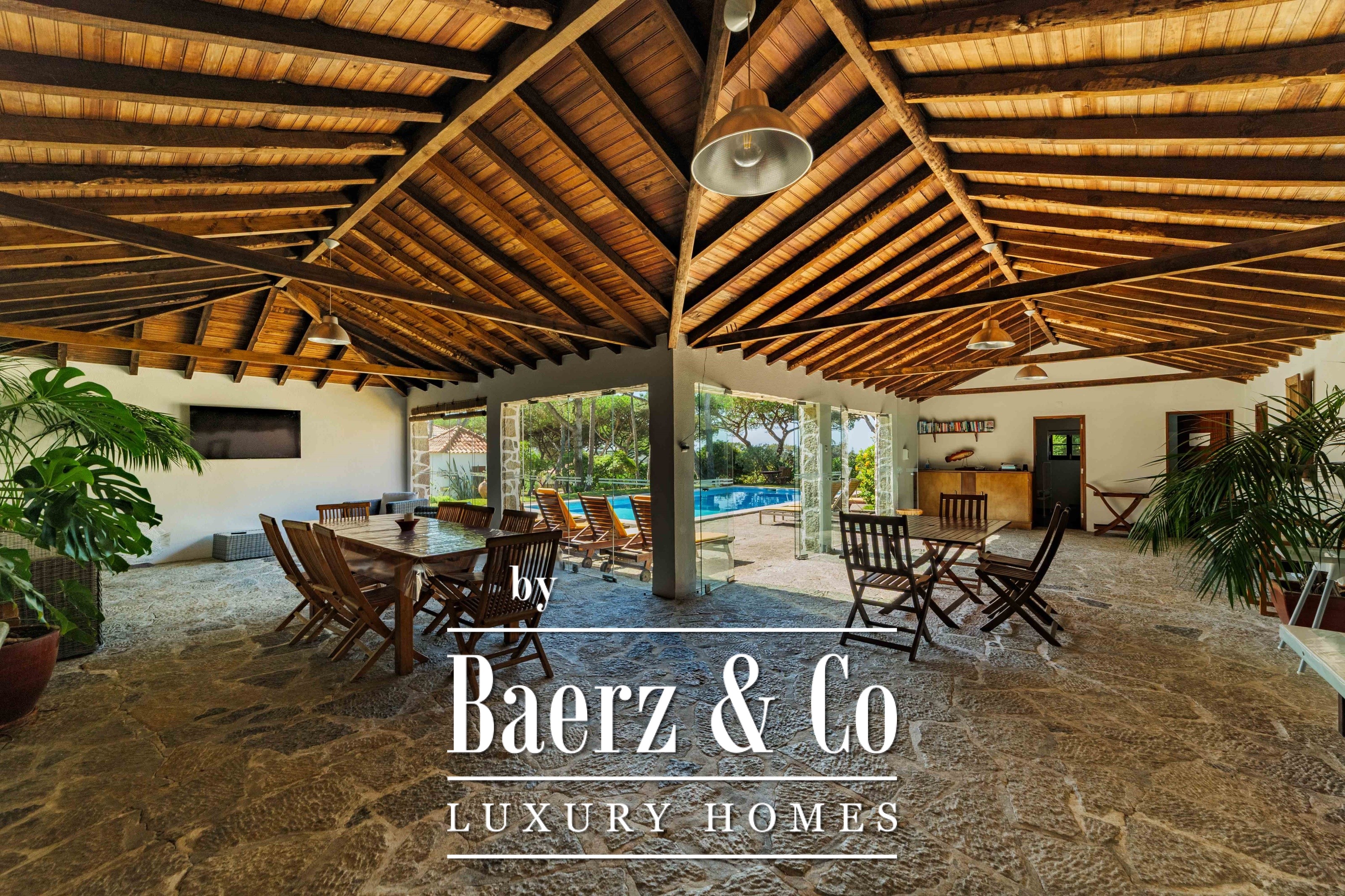 The main residence spans two stories and 302 m², completed in 2023 with a focus on authentic materials: exotic woods, fine stone, traditional clay tile roofing, and handmade wrought iron details. Sunlight from east to west fills harmoniously proportioned rooms—spacious living areas with a fireplace, a fully equipped kitchen opening onto the gardens, private suites, and terraces oriented toward serene views of the Sintra hills and the Atlantic.