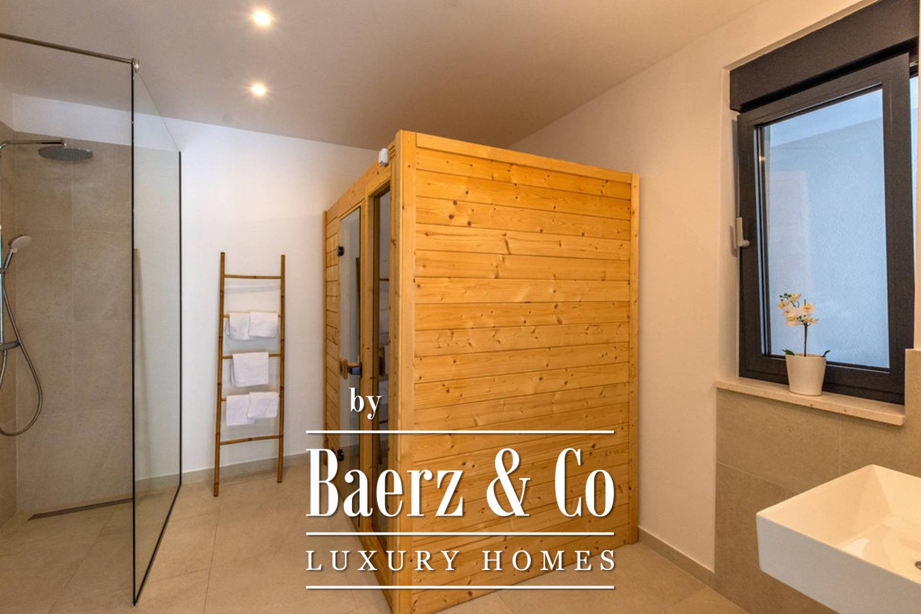 Upstairs, four distinct bedrooms each feature their own en suite bathrooms, complemented by an additional separate bathroom, a guest toilet and a laundry room. Wellness and relaxation are integral, with a dedicated room styled around a hydromassage bath, sauna and shower, fostering a retreat-like atmosphere on the ground level.