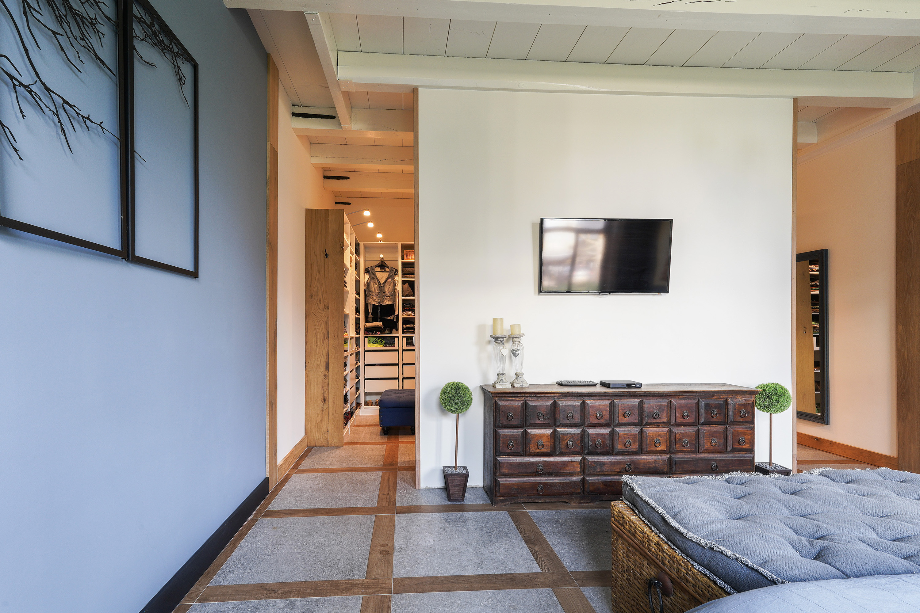 Despite its impressive dimensions, the home feels logical and comfortable. It is fully life-cycle proof. On the ground floor you will find, in addition to the spacious living room, a very generous bedroom, a large walk-in closet and a spacious bathroom. There is also a complete laundry room with ample storage and a sink.