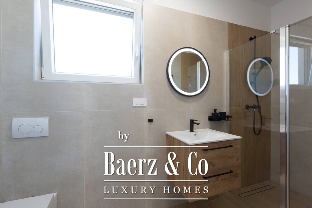 On the ground level, a bedroom adapted for accessibility, an additional bathroom, and a storage room ensure function without compromise. The first floor offers three further en-suite bedrooms, each opening to a generous terrace, extending both light and air throughout. Materials draw from the Mediterranean context, while underfloor heating, air conditioning in every room, and solar panels speak to contemporary standards.