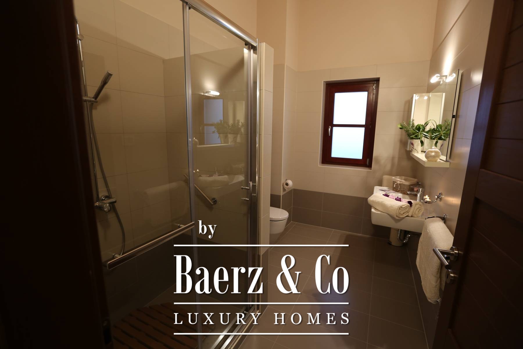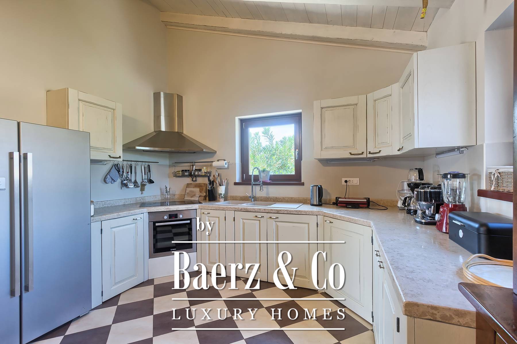The residence is composed over three levels. The basement houses a tavern and wine cellar, a nod to the region’s winemaking heritage. On the ground floor, the kitchen, living room, a bedroom with en suite bathroom, storage area, guest toilet, and spacious terraces flow seamlessly to the outdoors. Upstairs, two bedrooms each feature private bathrooms and expansive balconies that offer leafy views.