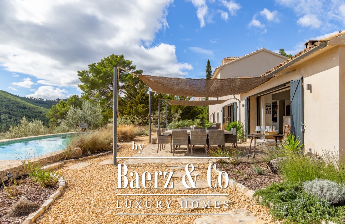 Seven bedrooms and five bathrooms ensure comfort and privacy, including two en-suite and an additional outdoor bathroom. The kitchen is equipped with Miele and Smeg appliances. Light filters through spacious terraces, while a large heated pool and fully fenced areas reinforce an atmosphere of security and calm. The estate’s infrastructure offers genuine independence, with natural spring water storage of 21,500 liters, 35 solar panels with advanced lithium batteries, and a 23 kVA emergency generator.