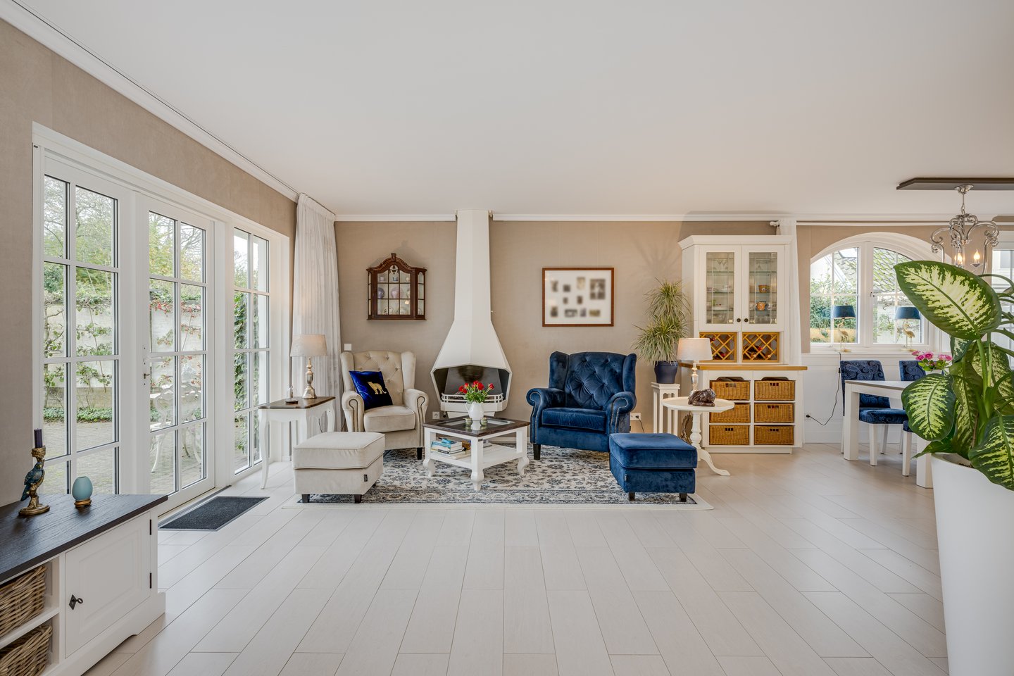 You enter a spacious hall with closet, toilet and stairs to the second floor. The attractive and spacious living room features a gas-fired fireplace and French doors to the sunny garden. Large windows provide a beautiful light.